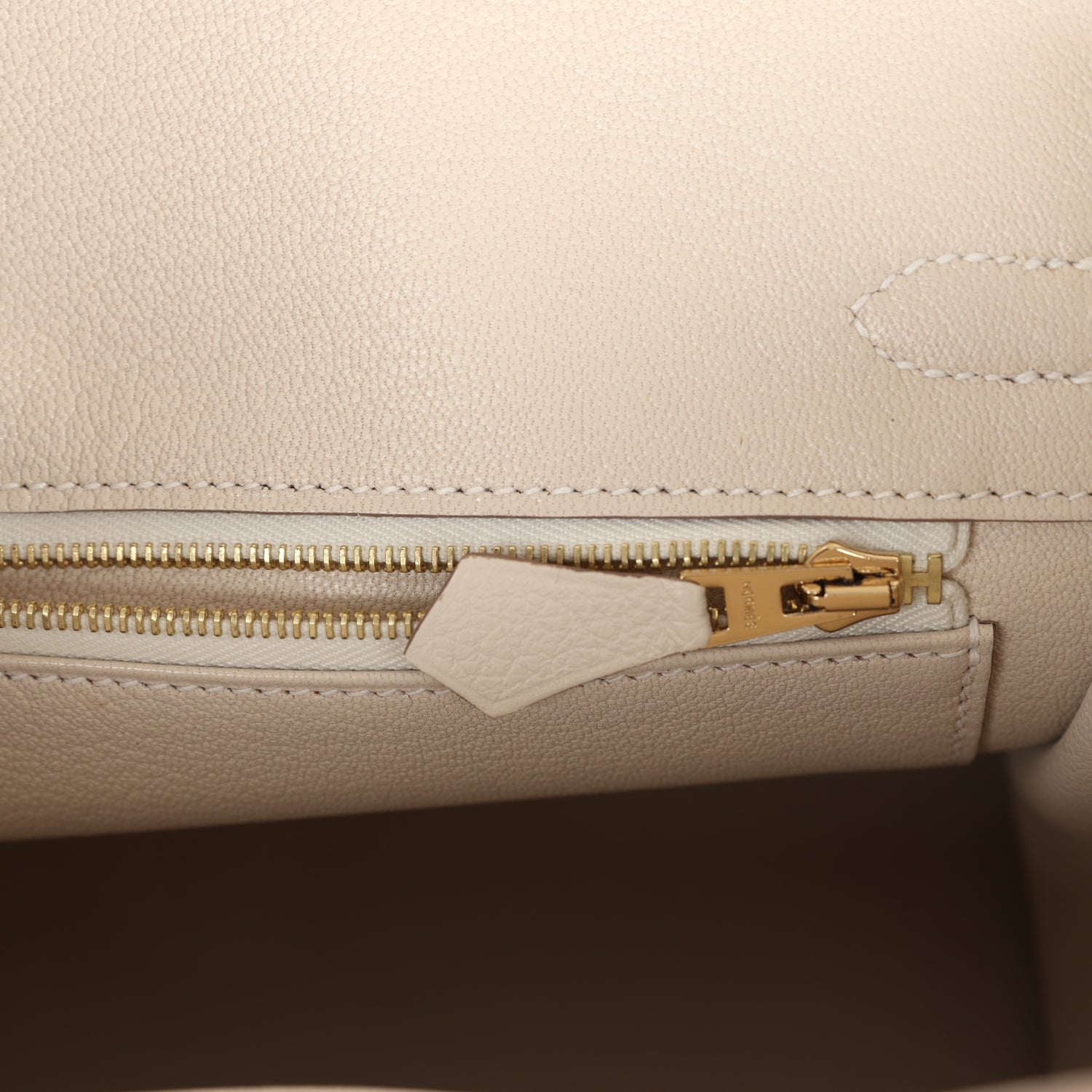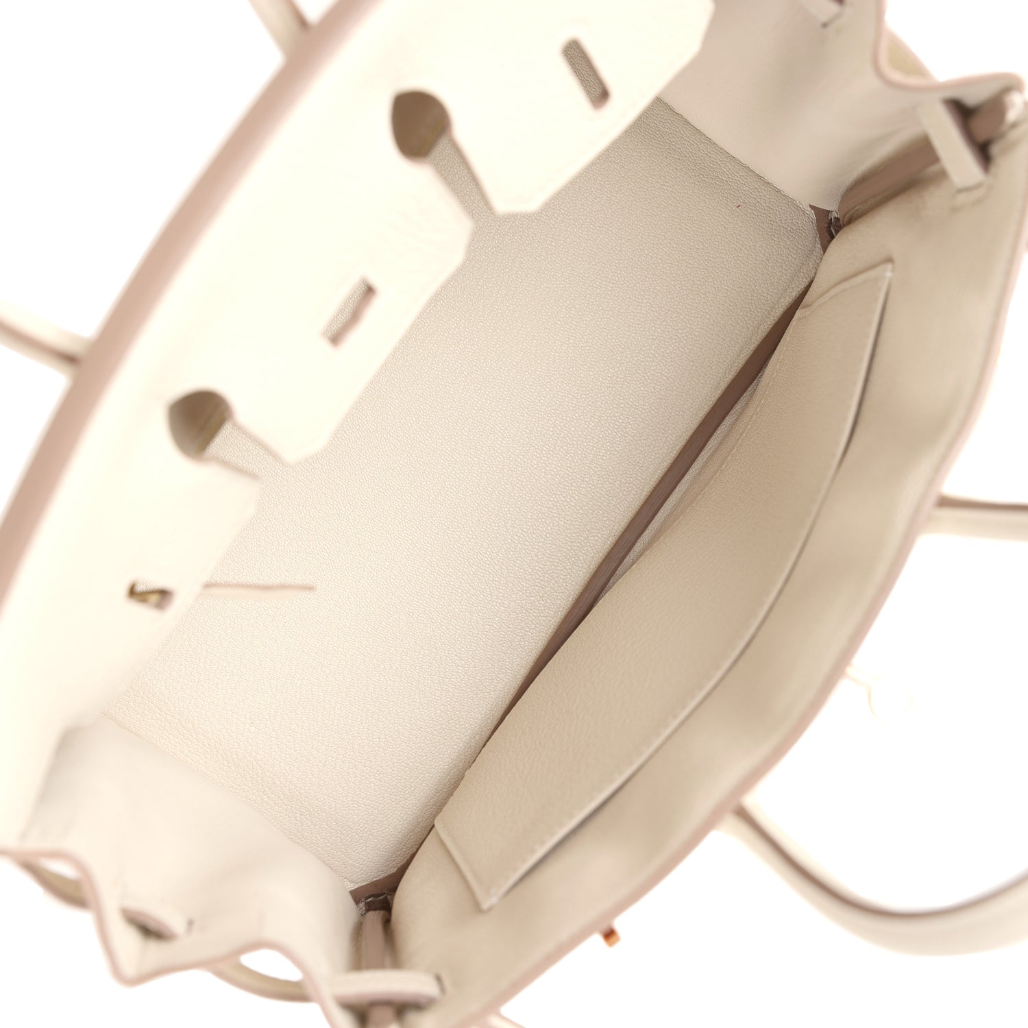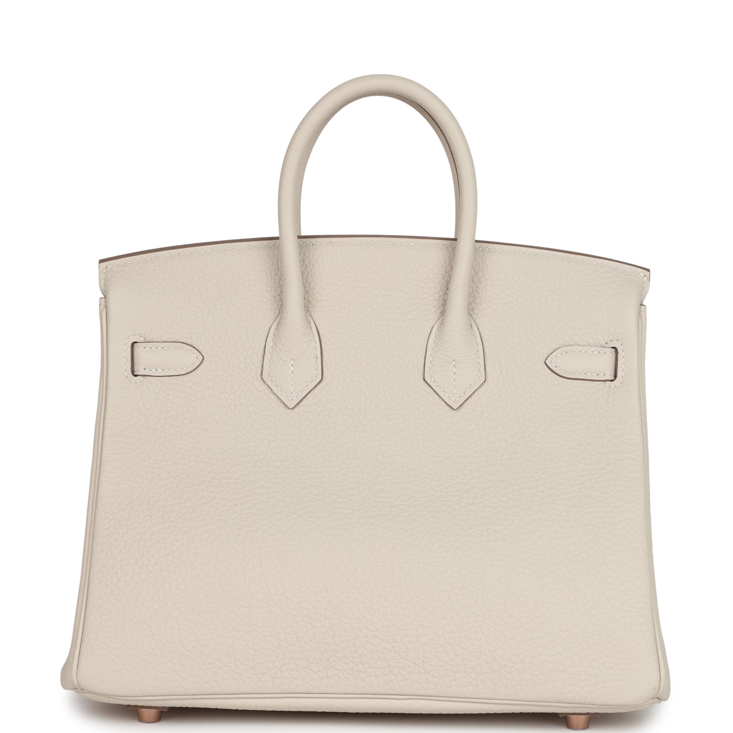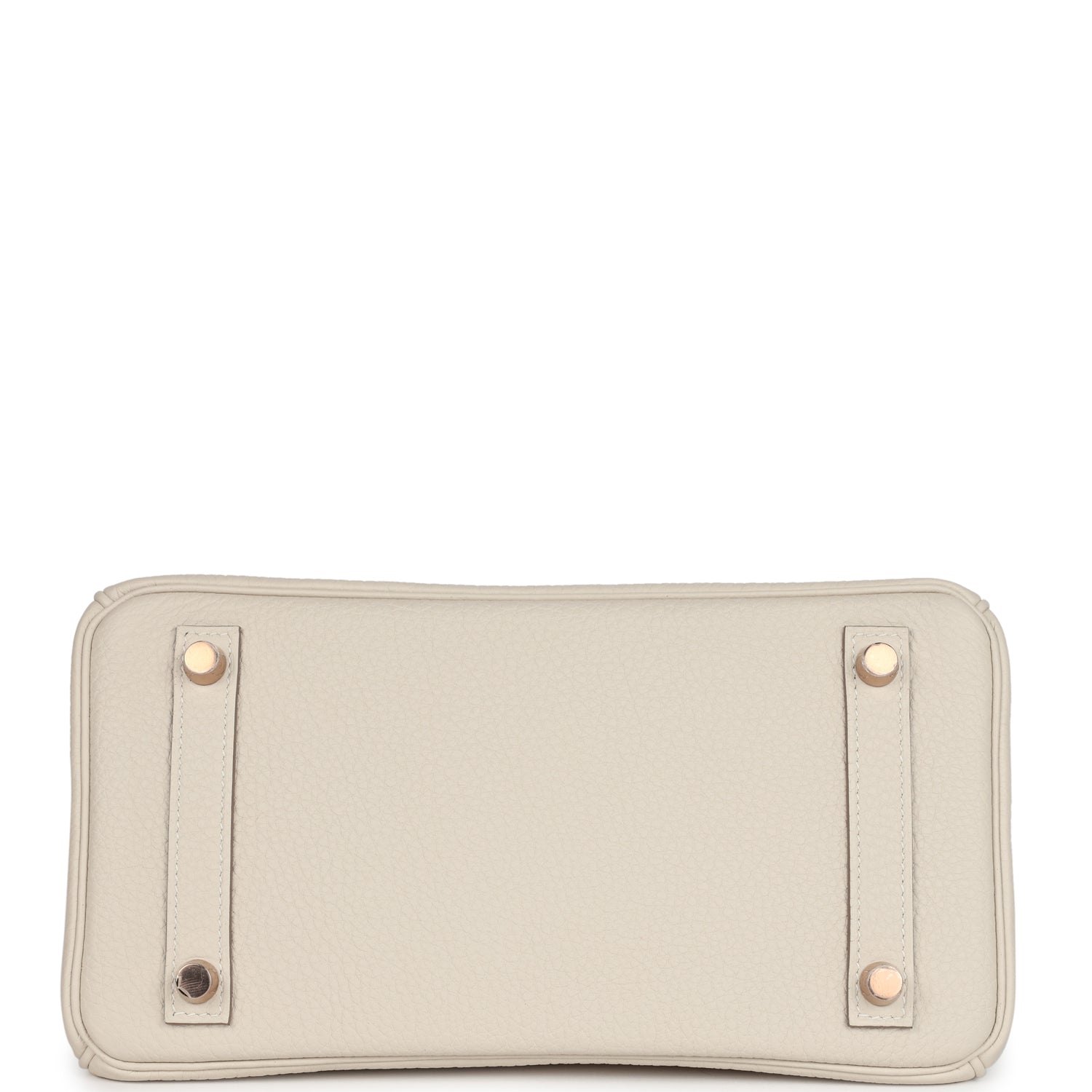 This Birkin is in Craie togo leather with rose gold hardware and has tonal stitching, front flap, two straps with center toggle closure, clochette with lock and two keys, and double rolled handles.