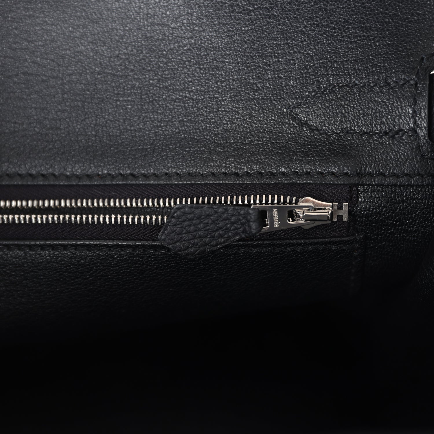 The interior is lined with Black chevre and has one zip pocket with an Hermes engraved zipper pull and an open pocket on the opposite side.