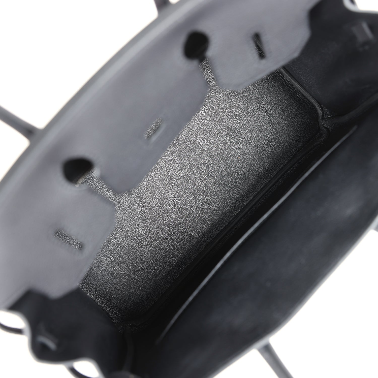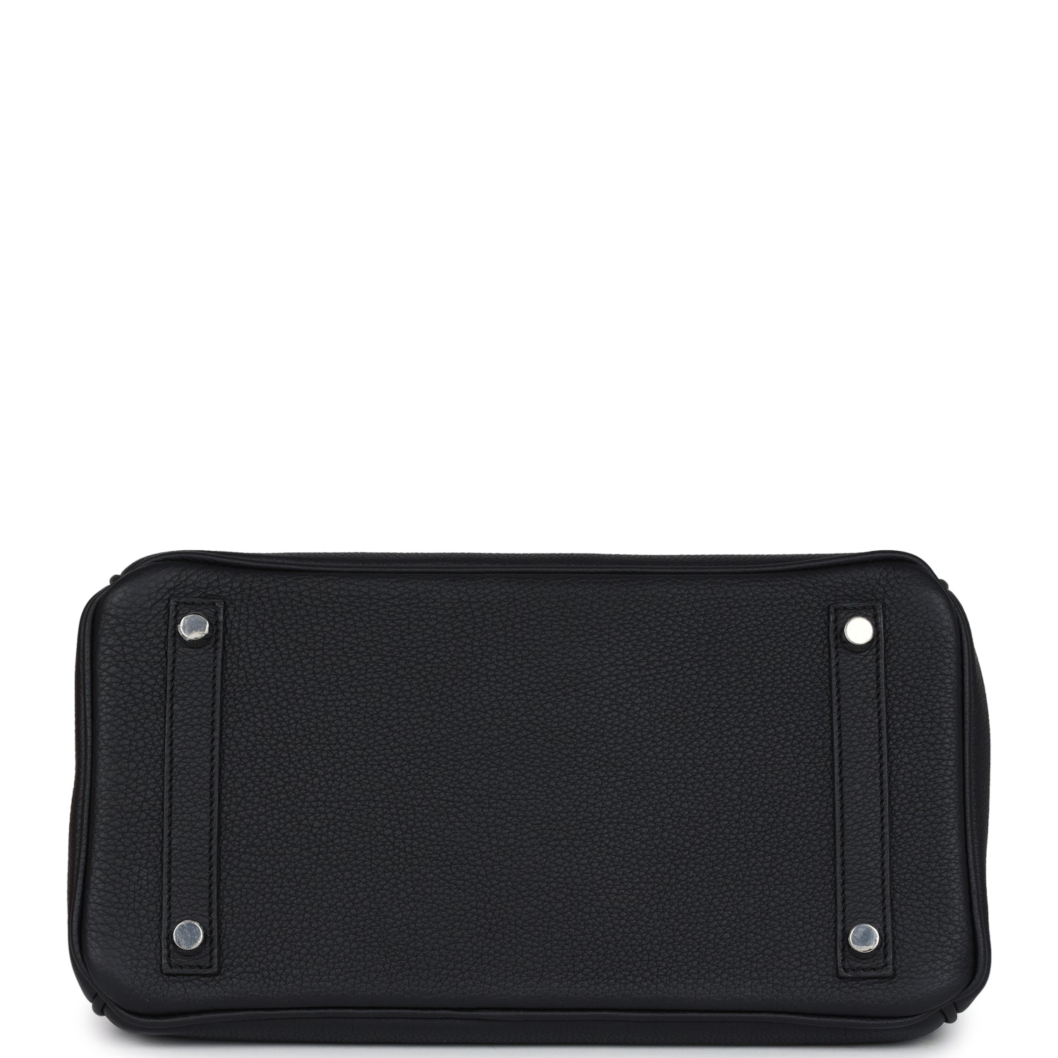 This Birkin is in Black togo leather with palladium hardware and has tonal stitching, front flap, two straps with center toggle closure, clochette with lock and two keys, and double rolled handles.