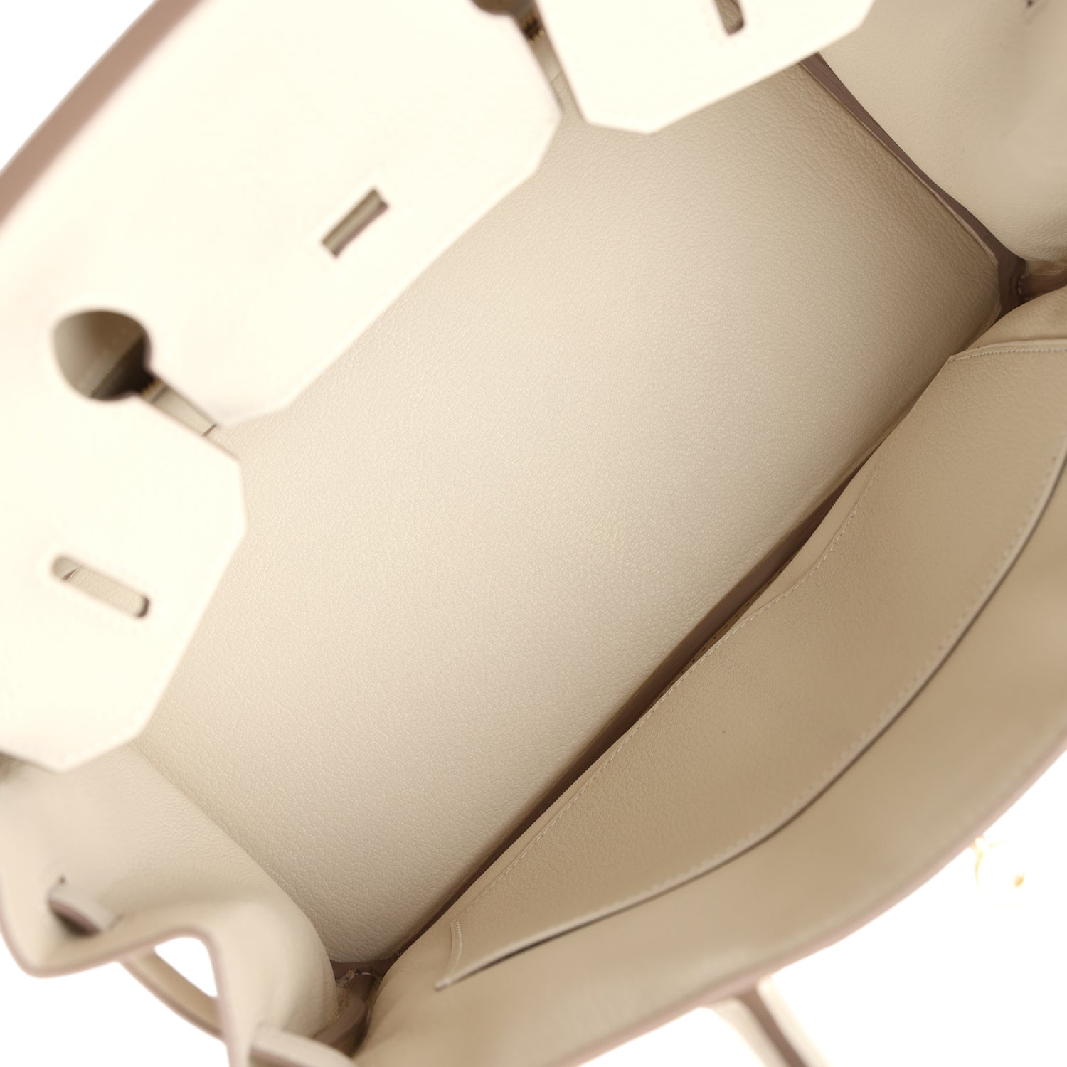 The interior is lined with Craie chevre and has one zip pocket with an Hermes engraved zipper pull and an open pocket on the opposite side.