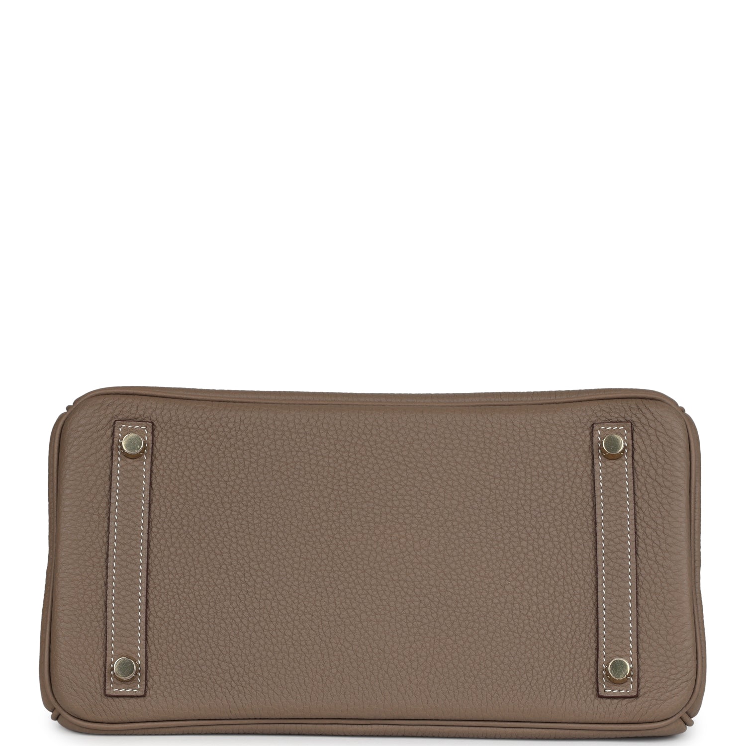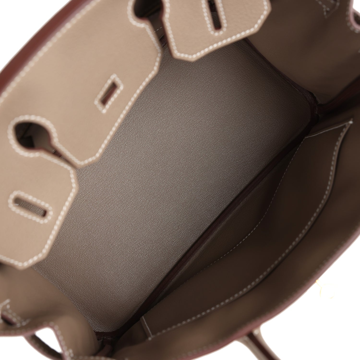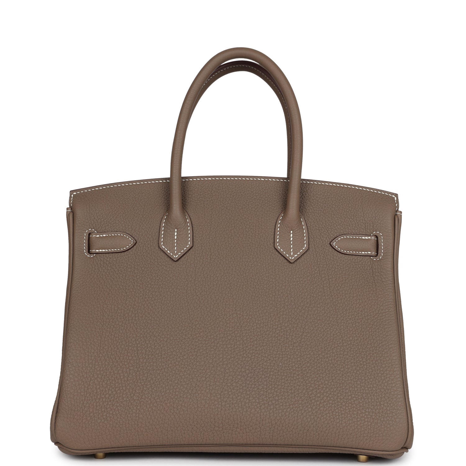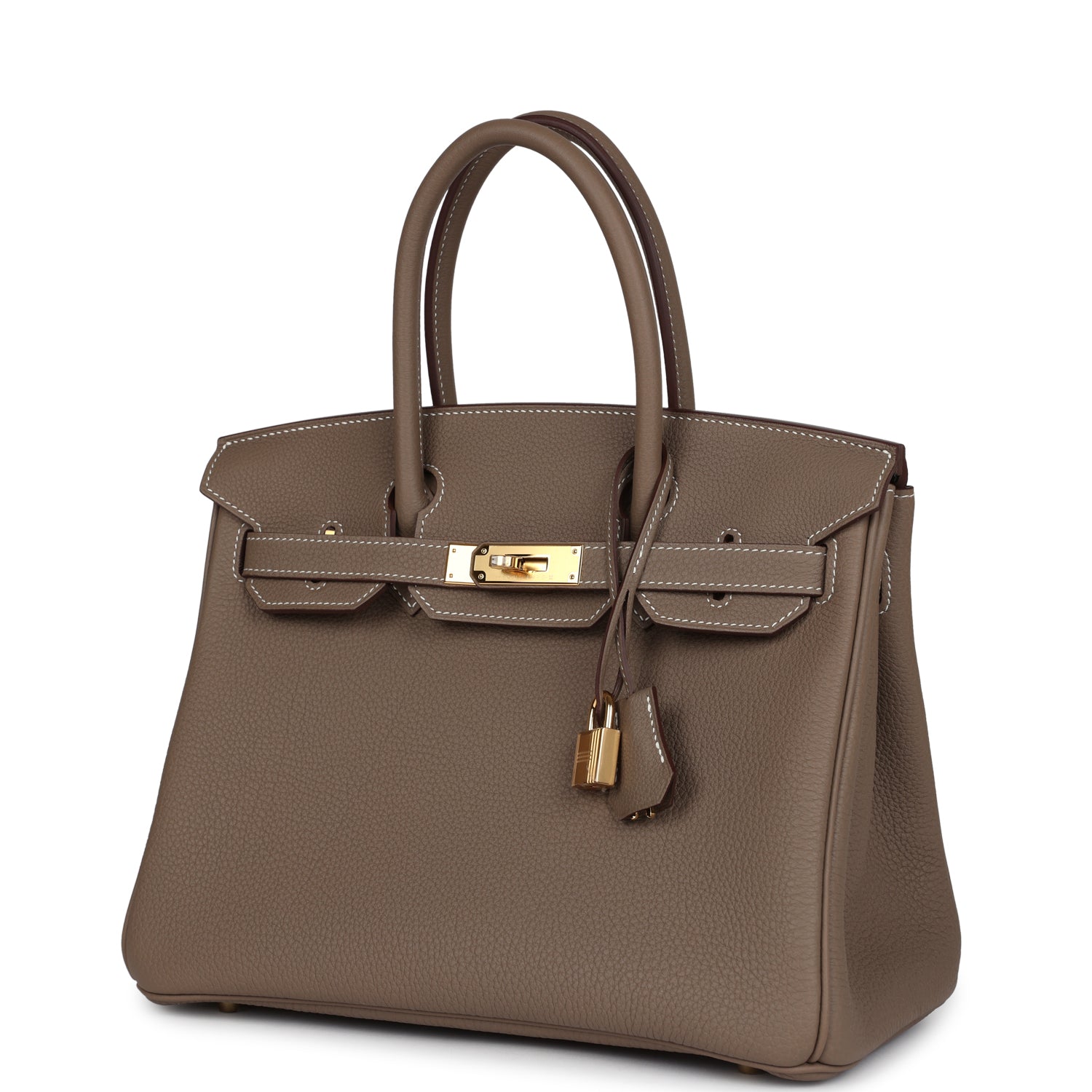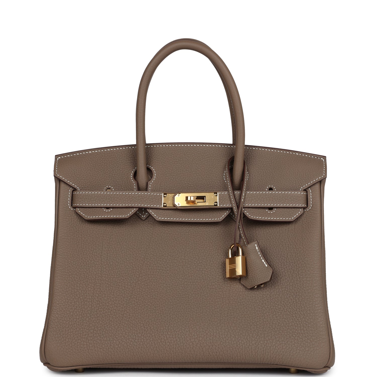 This Birkin is in Etoupe togo leather with gold hardware and has contrast stitching, front flap, two straps with center toggle closure, clochette with lock and two keys, and double rolled handles.