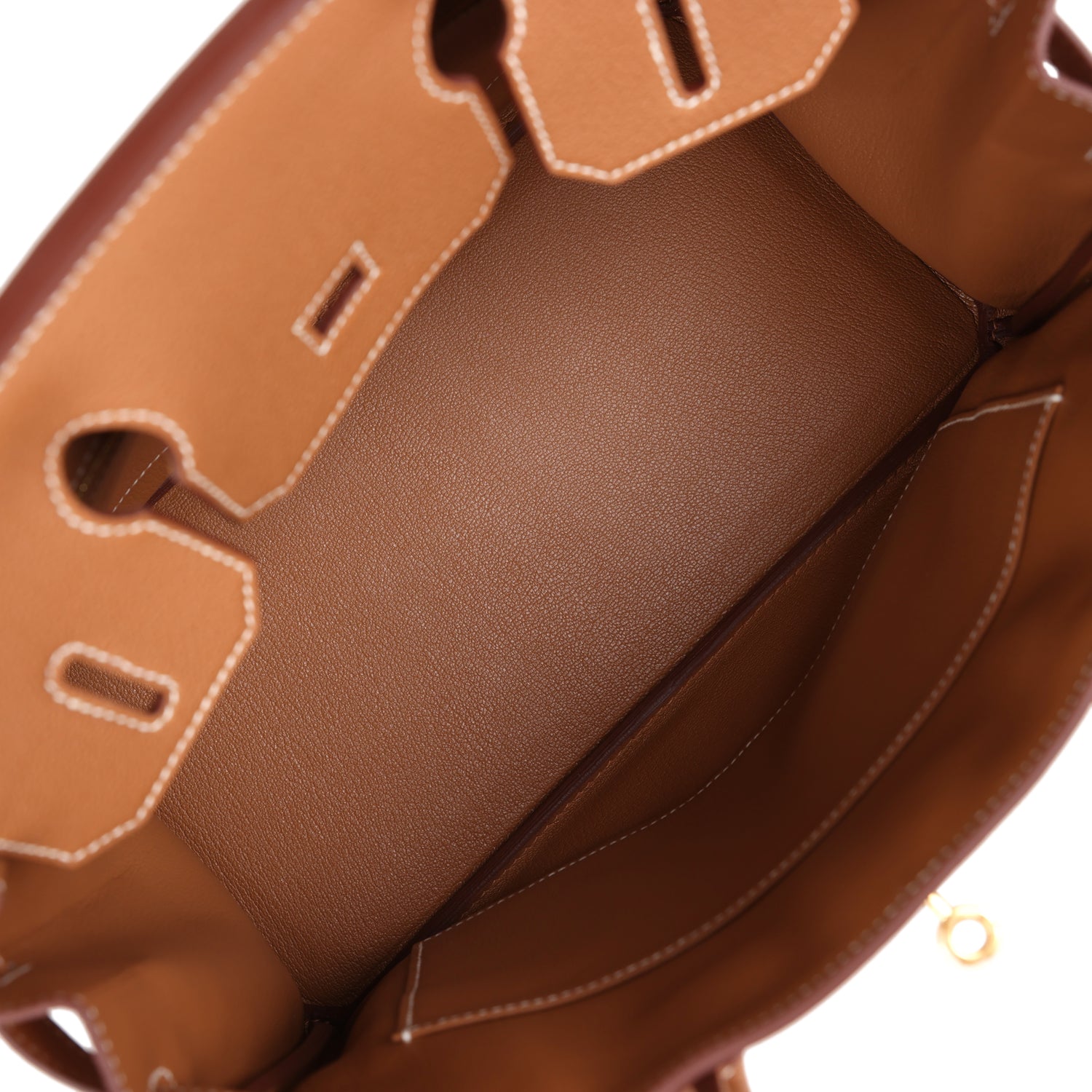 The interior is lined with Gold chevre and has one zip pocket with an Hermes engraved zipper pull and an open pocket on the opposite side.