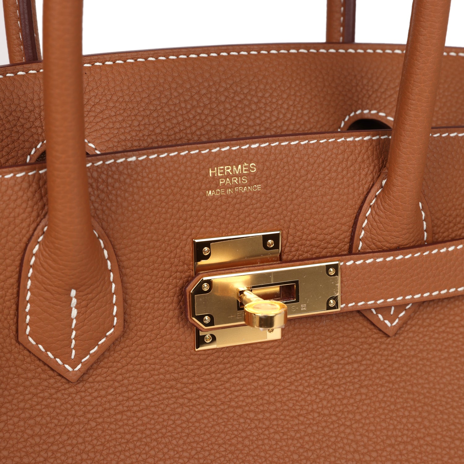 This Birkin is in Gold togo leather with gold hardware and has contrast stitching, front flap, two straps with center toggle closure, clochette with lock and two keys, and double rolled handles.