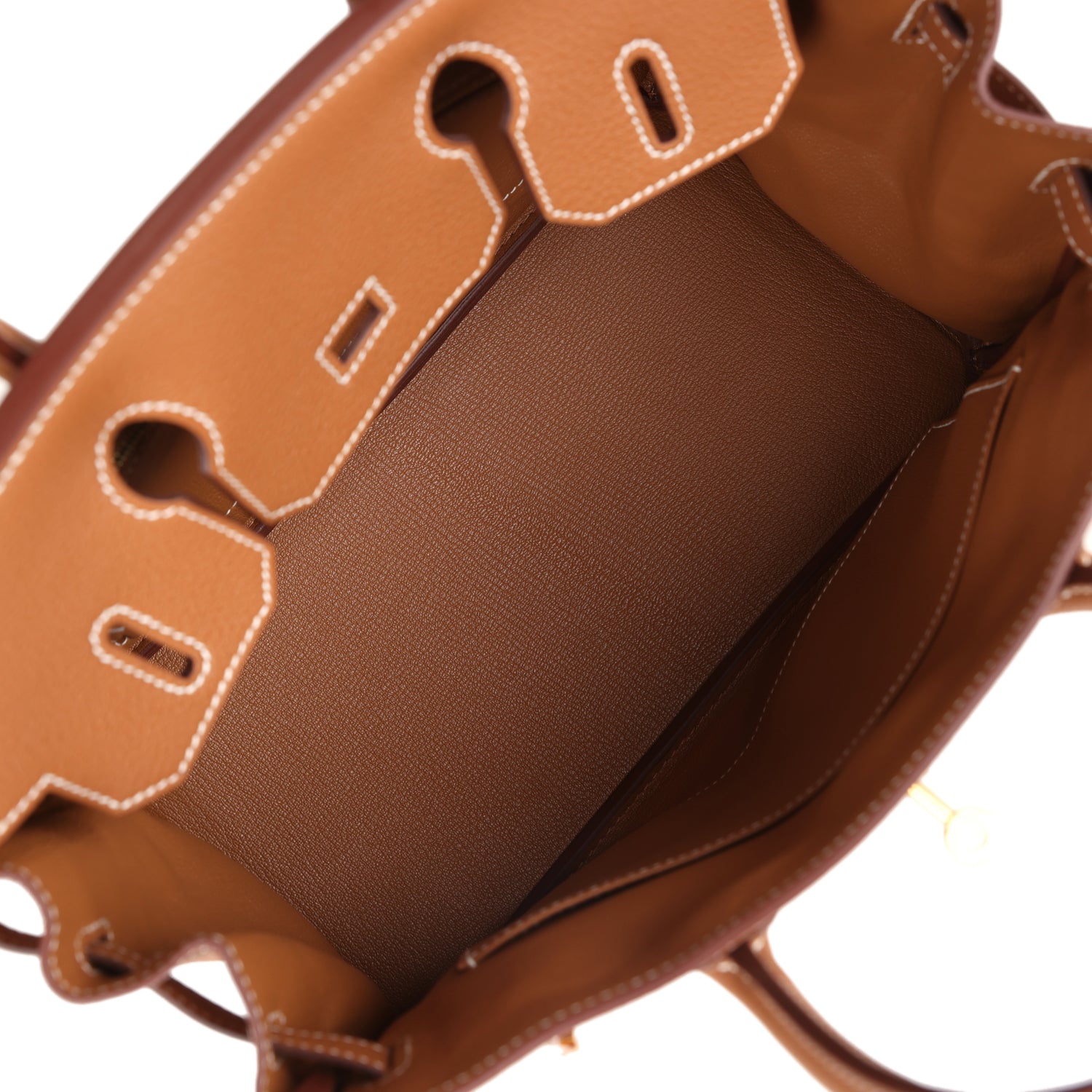 This Birkin is in Gold togo leather with gold hardware and has contrast stitching, front flap, two straps with center toggle closure, clochette with lock and two keys, and double rolled handles.