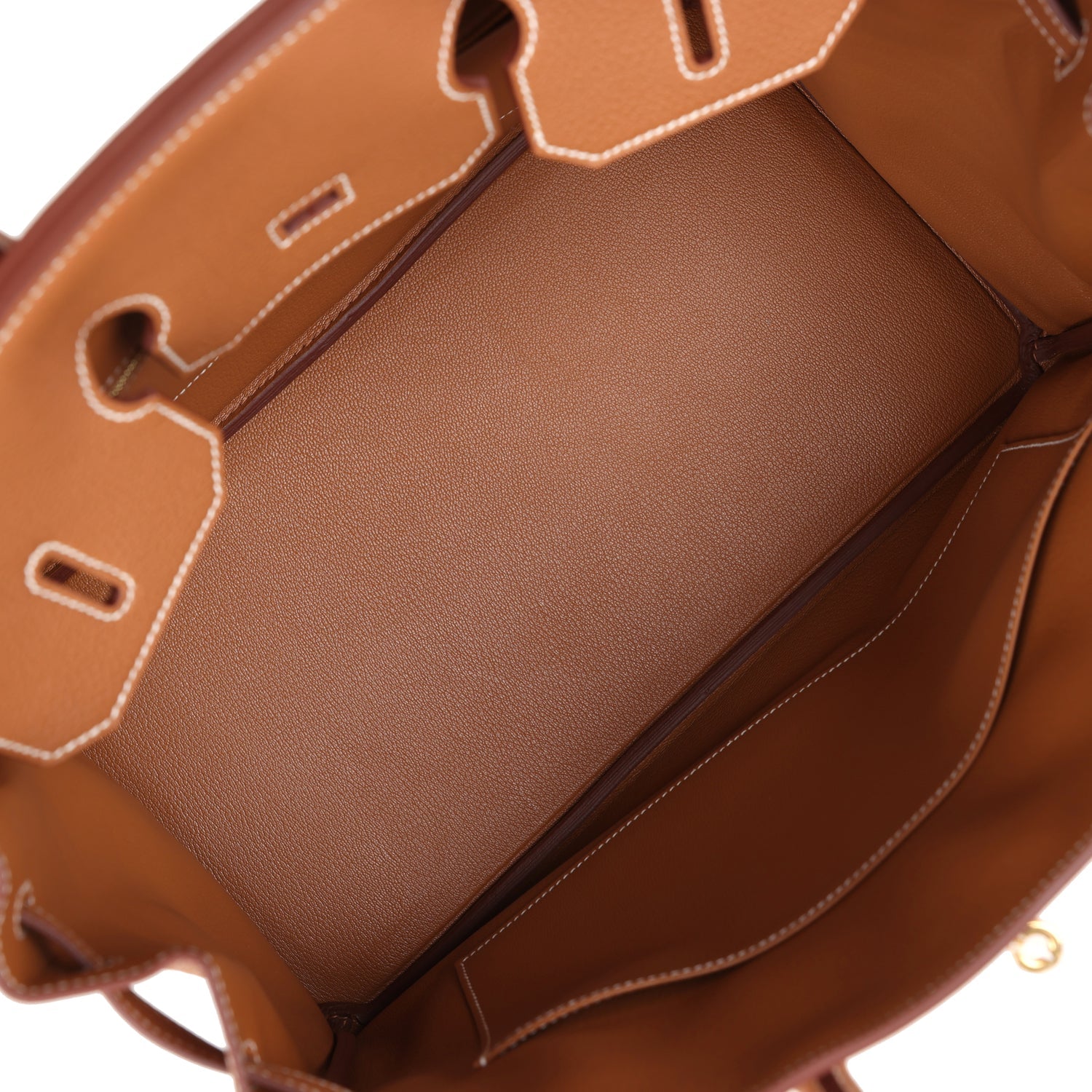 The interior is lined with Gold chevre and has one zip pocket with an Hermes engraved zipper pull and an open pocket on the opposite side.