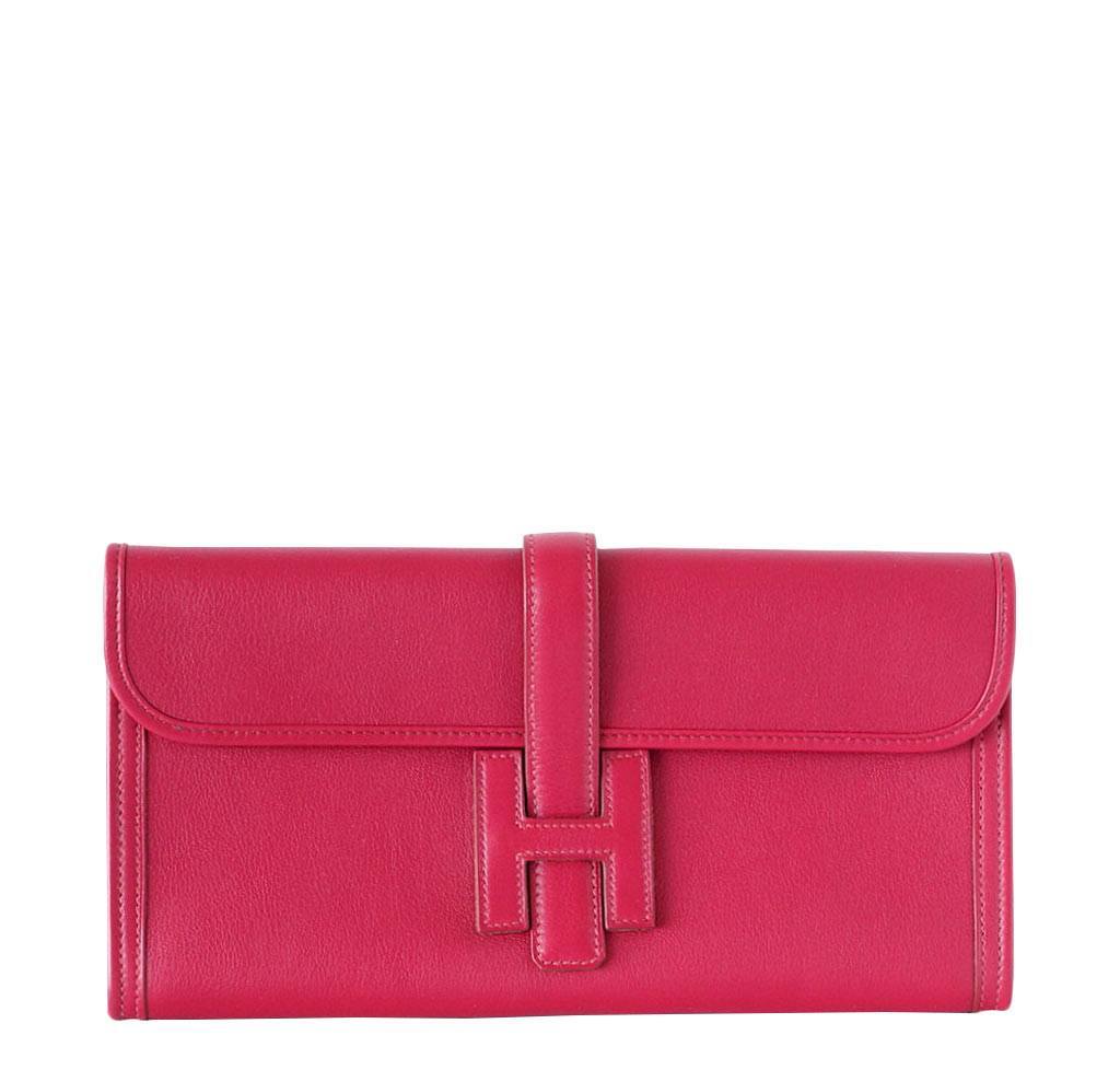 This Hermès Jige 29cm Clutch bag is extremely rare and featured in the Rubis color, which is a redish-pink tone. This bag is made from incredibly smooth swift leather and has the signature Jige "H" closure. This Jige bag is store-fresh, has never been carried and comes with the original Hermès box and sleeper.