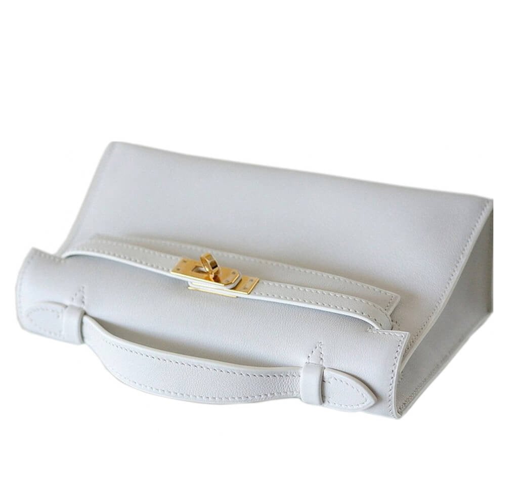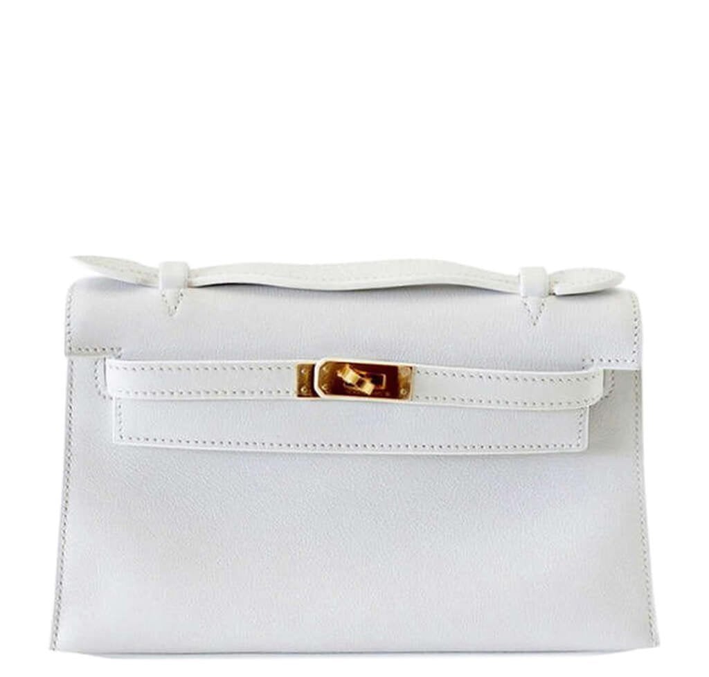 This Hermès Kelly Pochette bag is made from Togo leather, which is incredibly smooth to the touch and has a very fine grain. This bag is featured in white, which is one of the rarest Hermès colors available and is accentuated by gold hardware. This bag is store-fresh and has never been carried. Contact us for availability and additional information.