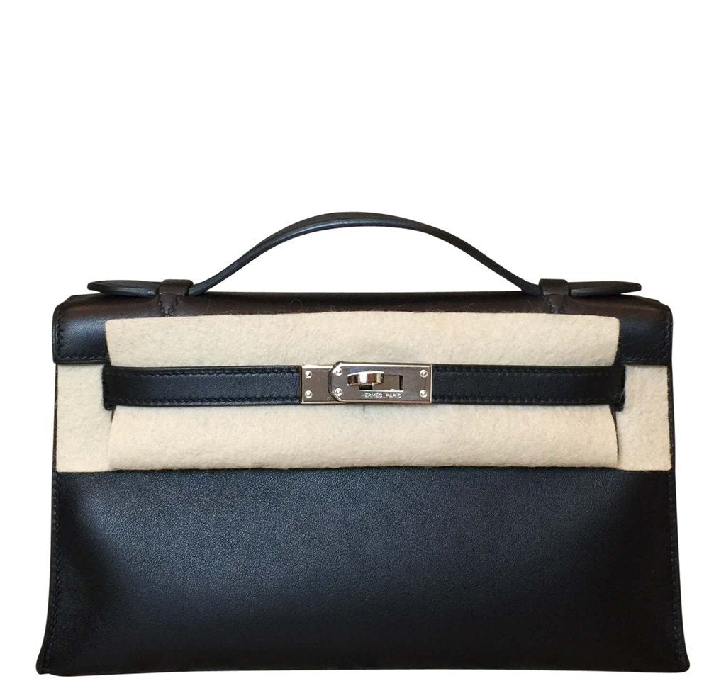 This Hermès Kelly Clutch Pochette Mini bag in the timeless Black Noir color is made of incredibly soft Swift leather and accentuated by palladium hardware. The bag is in excellent condition accompanied by its original box and sleeper. The stamp ID on the inside of the bag is a "T" with no shape, confirming the bag was produced in 2015.