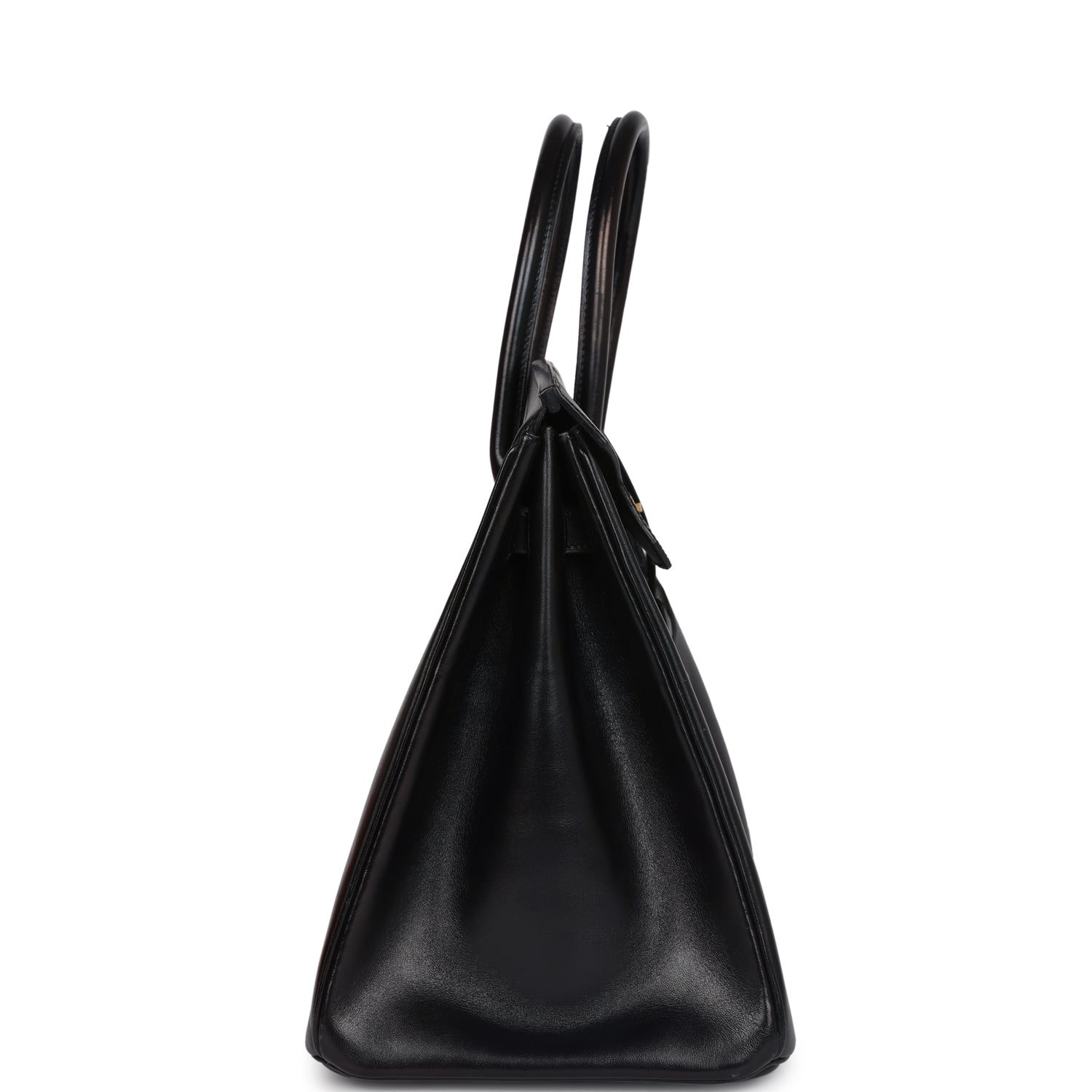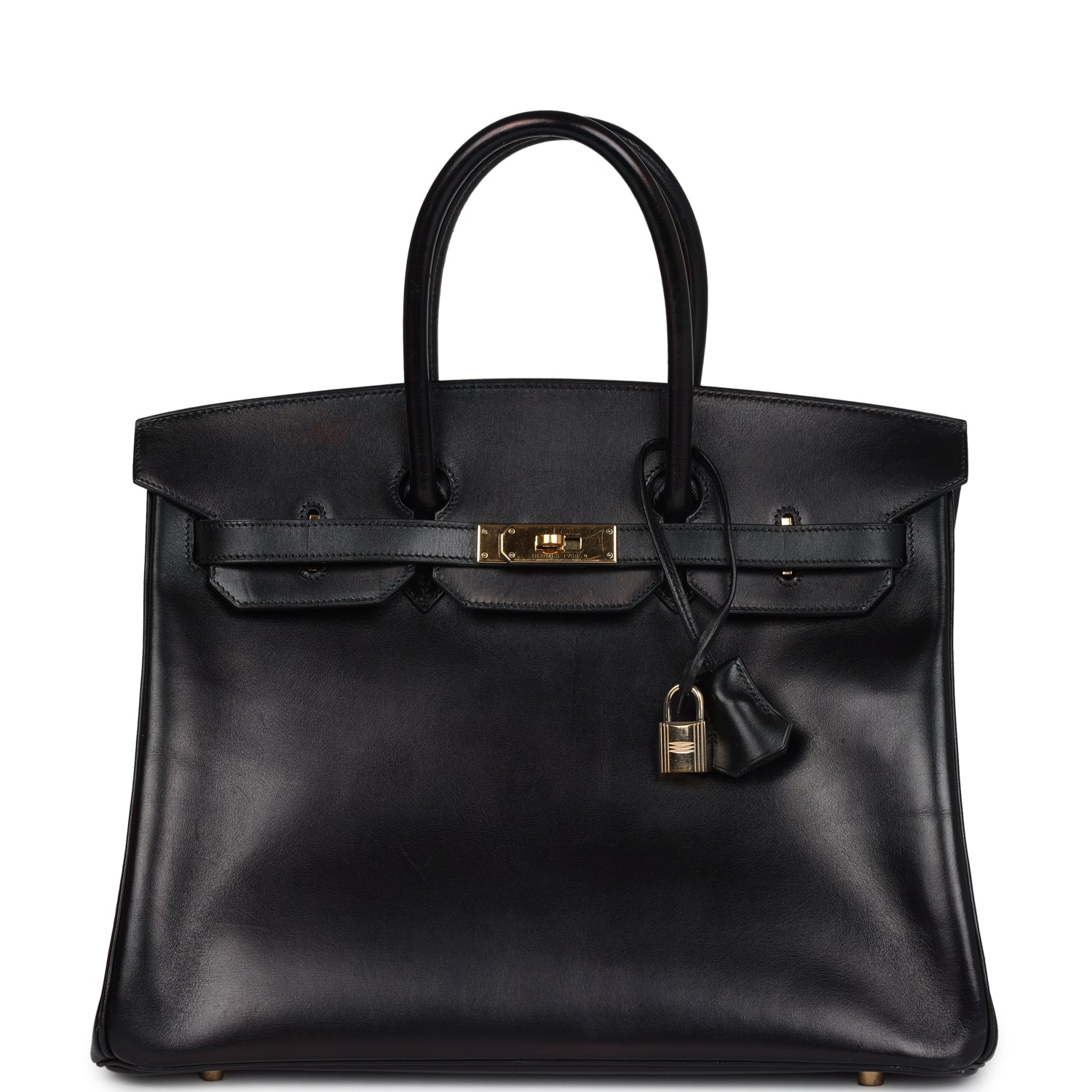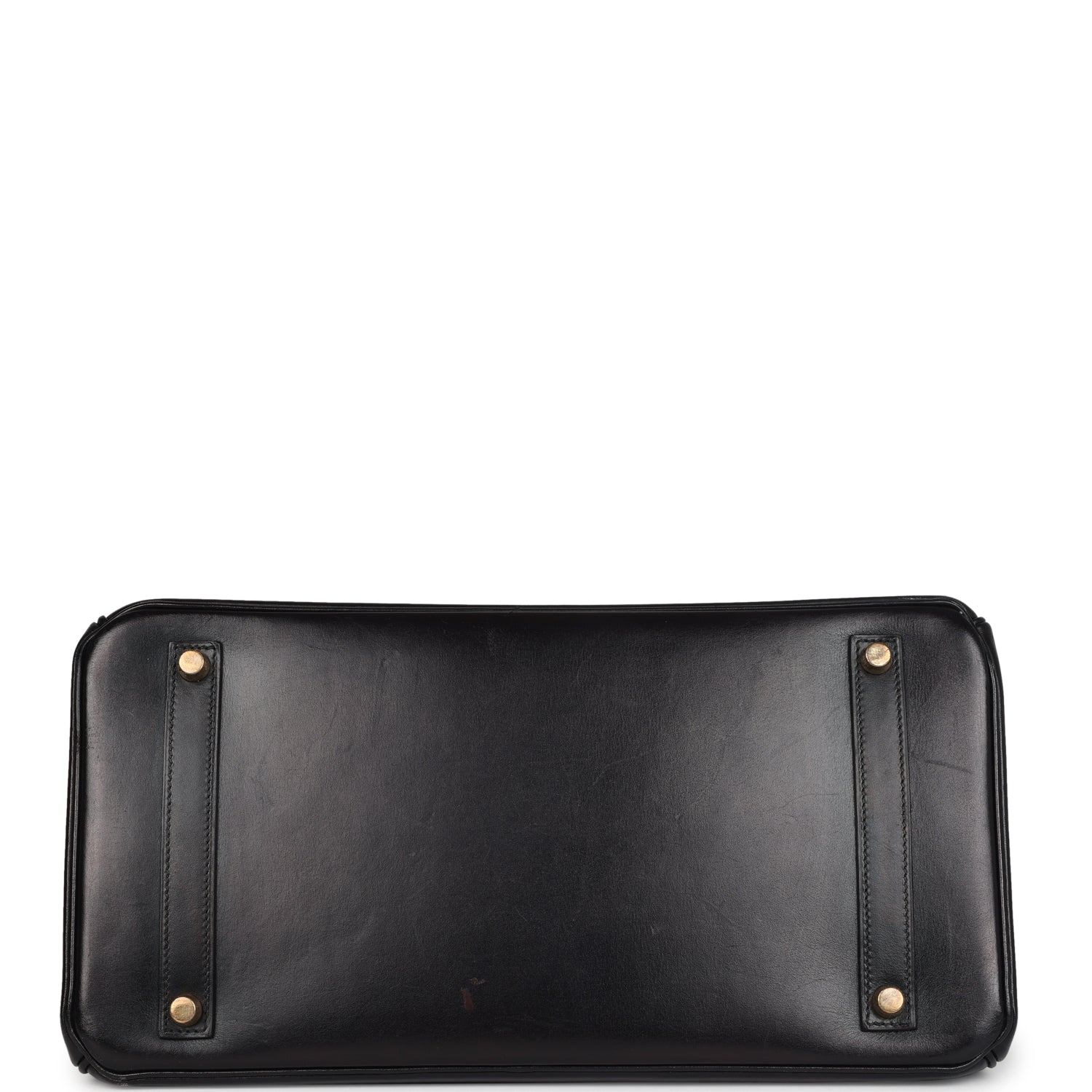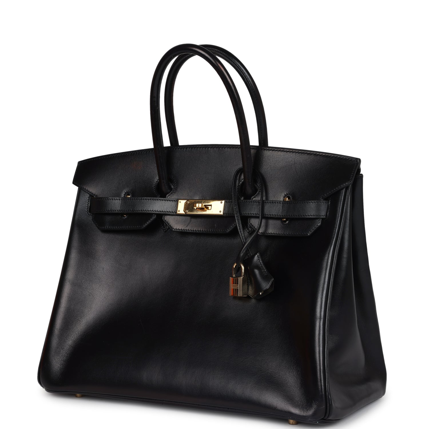 This Birkin is in Black box calf leather with gold hardware, tonal stitching, front flap with two straps, front toggle closure, clochette with lock and two keys, double rolled handles.