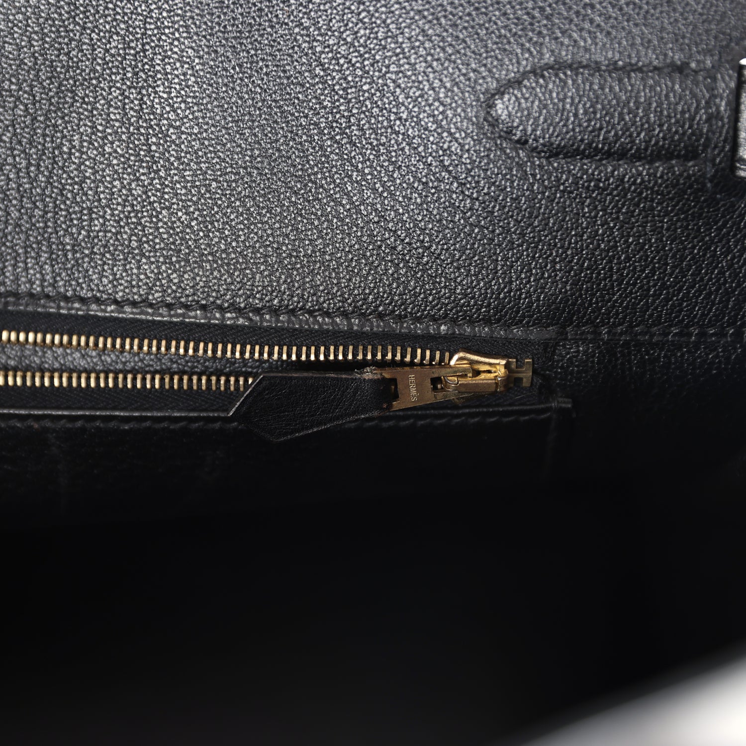 The interior is lined with Black chevre leather and has one zip pocket with an Hermes engraved zipper pull and an open pocket on the opposite side.