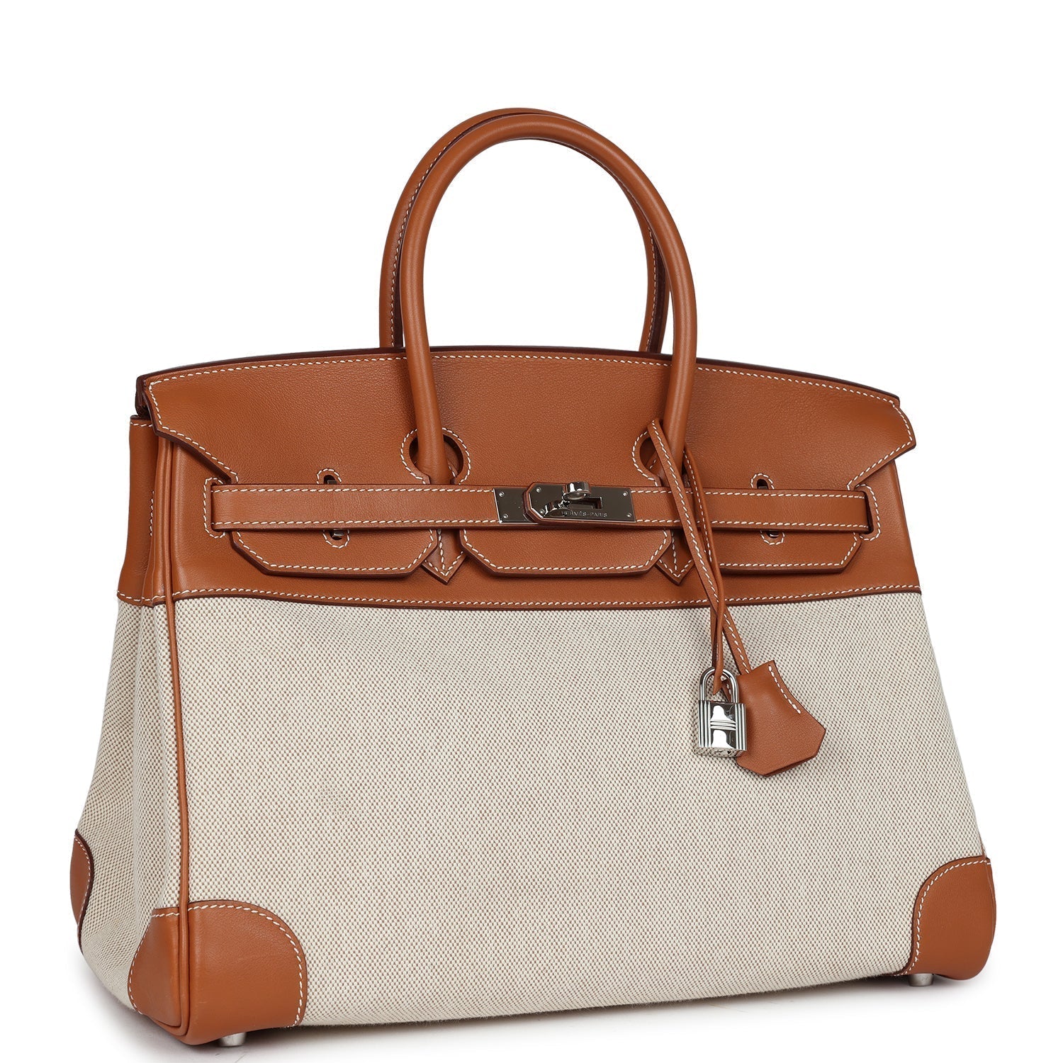 This Birkin 35 is in Toile H and Fauve barenia leather with palladium hardware and has contrast stitching, front flap, two straps with center toggle closure, clochette with lock and two keys, and double rolled handles.