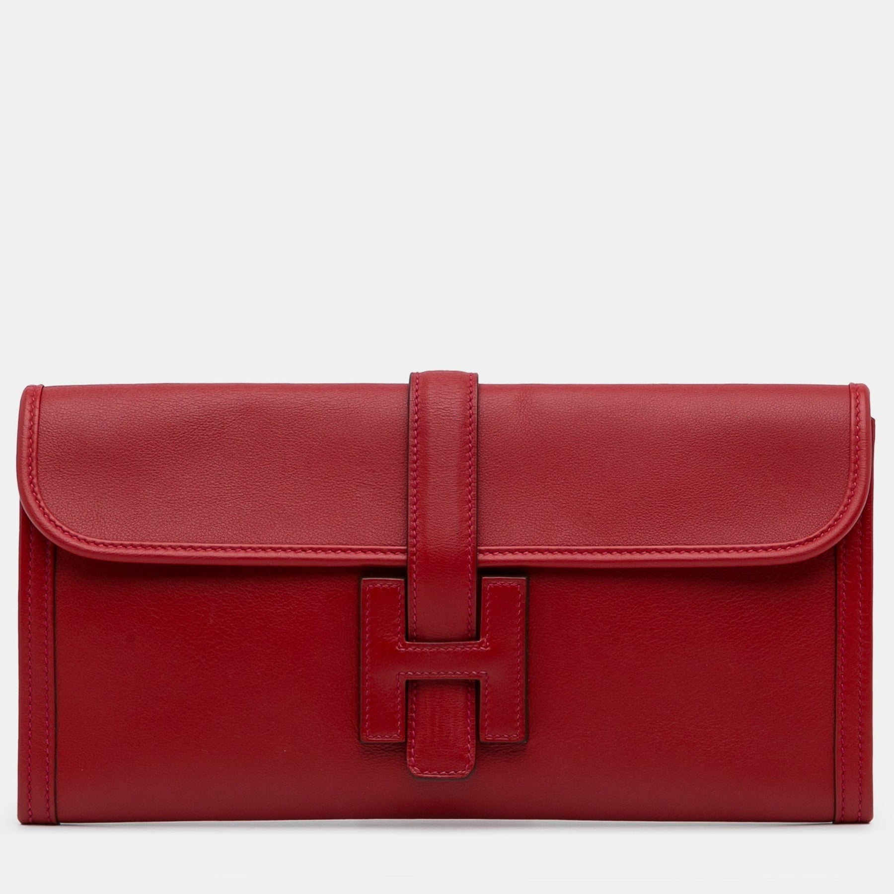 The Jige Elan features a leather body and a front flap with a pull through closure. Crafted with exquisite precision, this timeless Hermes clutch combines luxury with practicality, ensuring you make a chic statement at every gathering.