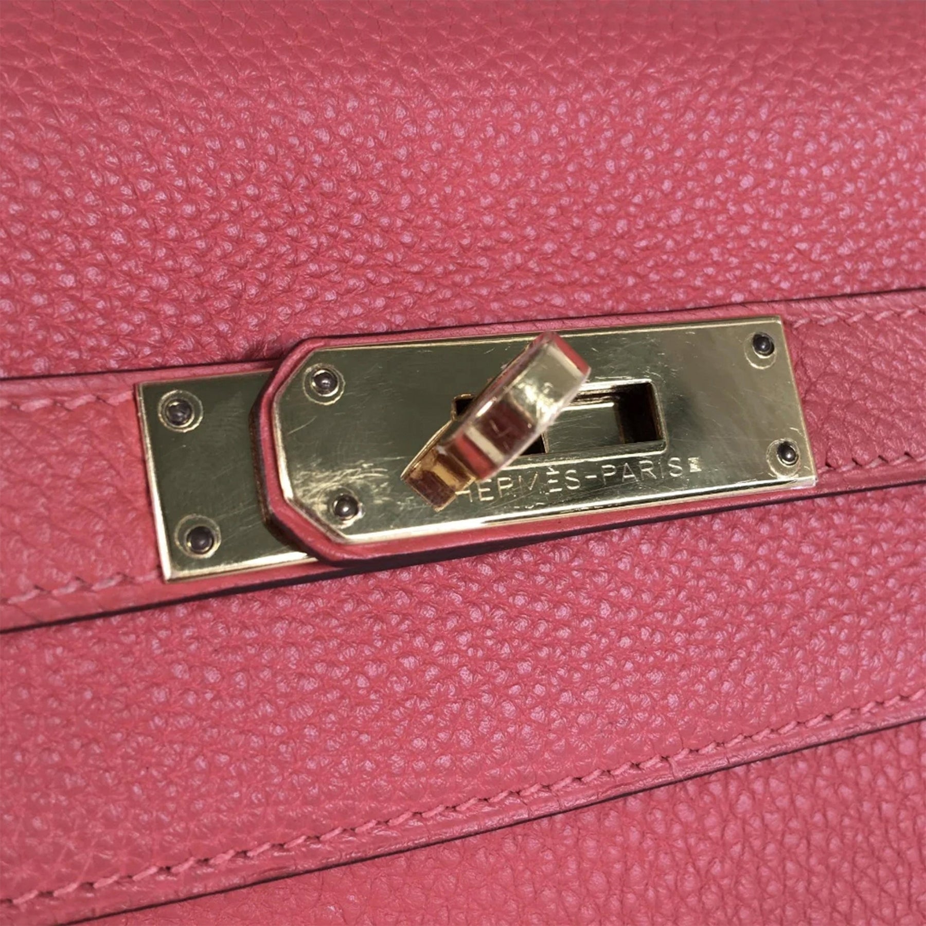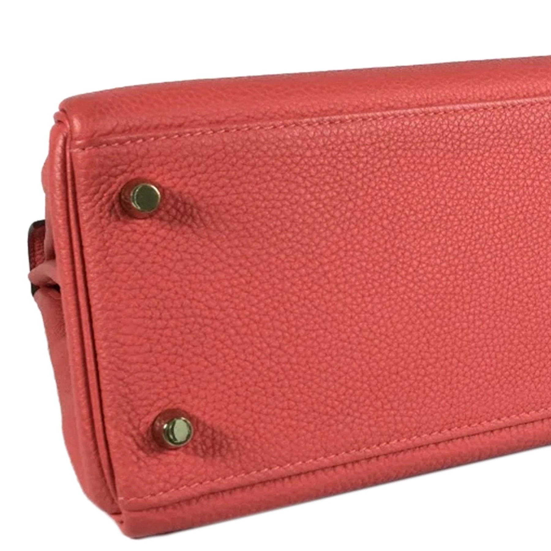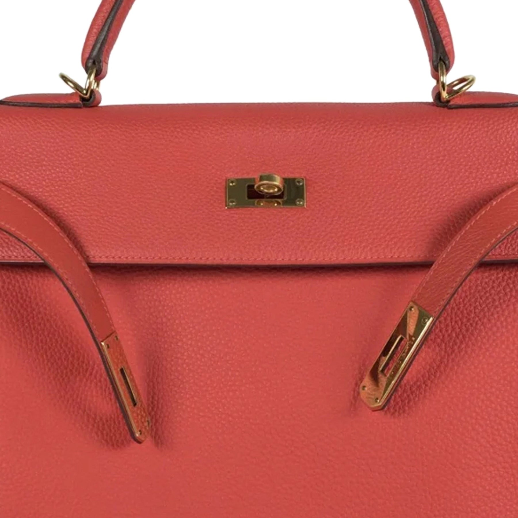 The Kelly 32 features a Togo leather body in Rose Jaipur color, a flat top handle, a detachable strap, a top flap with twist lock closure, gold hardware, leather lining, and interior zip and slip pockets.