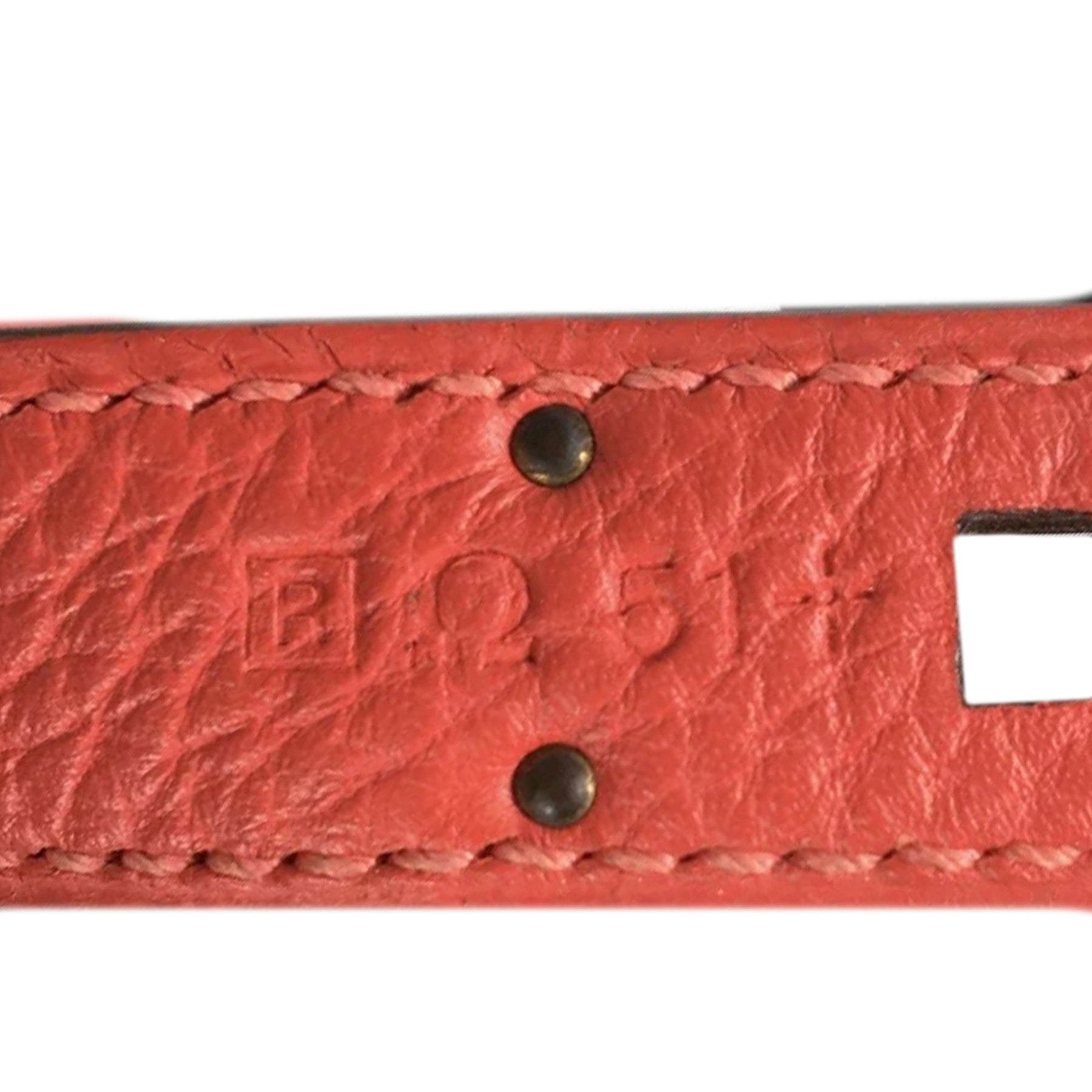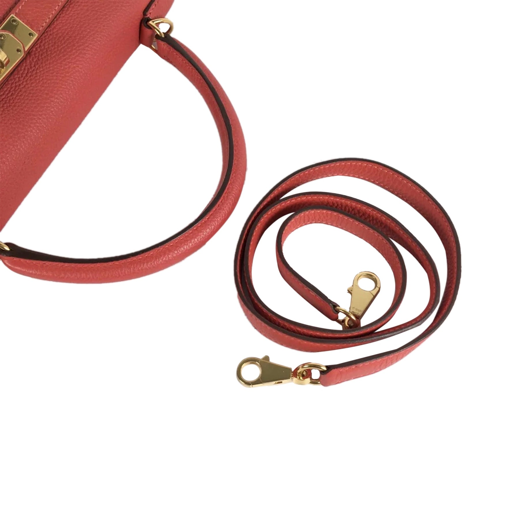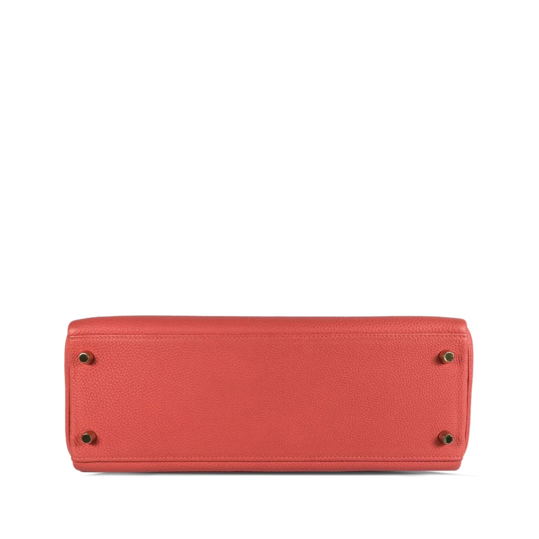 The Kelly 32 features a Togo leather body in Rose Jaipur color, a flat top handle, a detachable strap, a top flap with twist lock closure, gold hardware, leather lining, and interior zip and slip pockets.