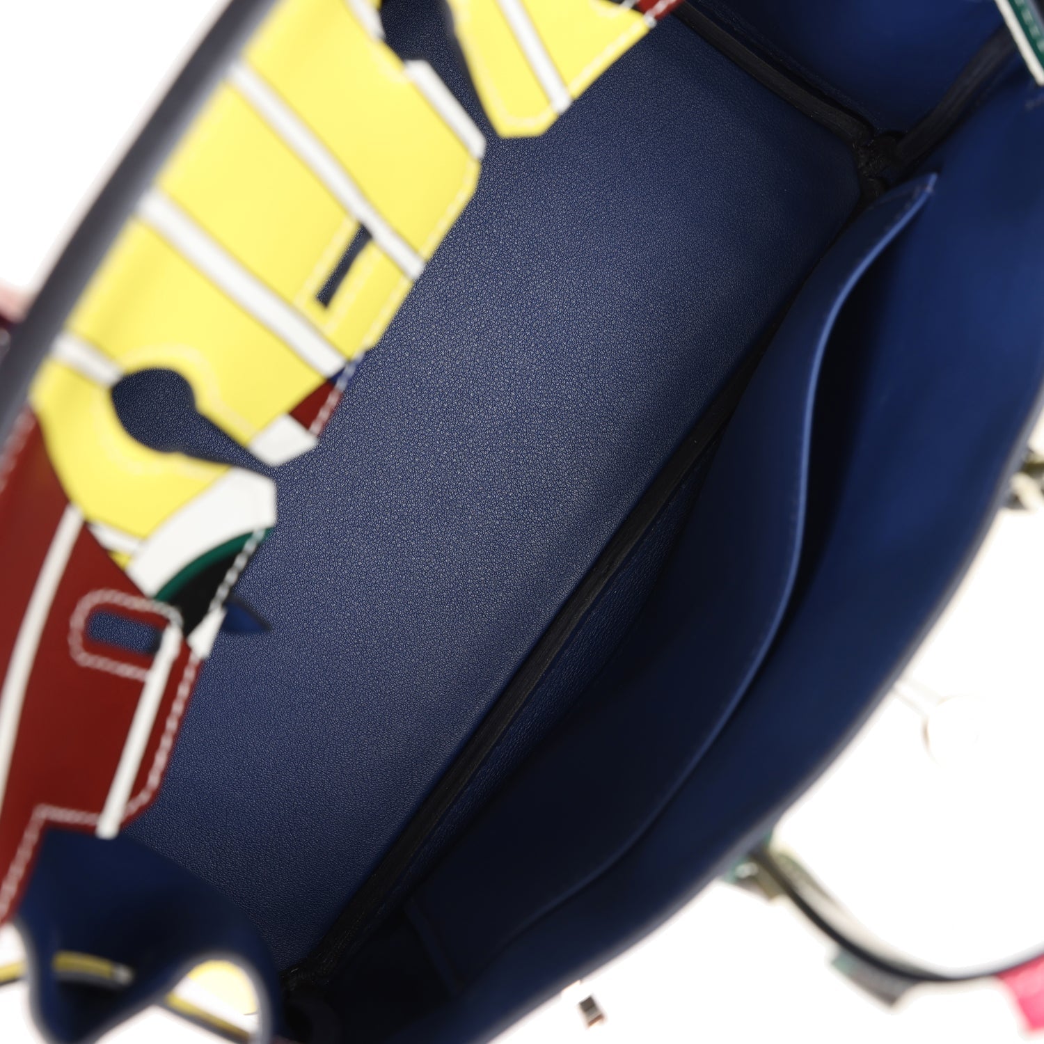 This Limited Edition One Two Three and Away We Go Birkin is in Multicolor Swift leather with Palladium hardware, designed by Nigel Peak, has contrast stitching, front flap with two straps, front toggle closure, clochette, lock and two keys, and double rolled handles.