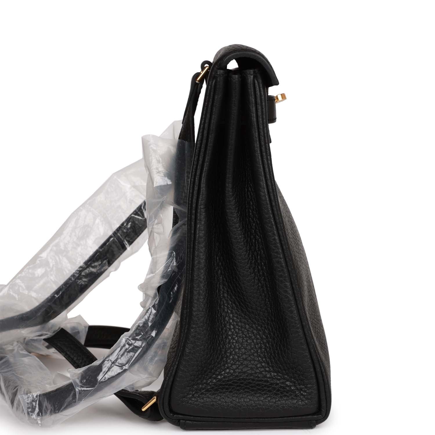 This Kelly Ado Backpack is in Black clemence leather with gold hardware and has tonal stitching, two straps with front toggle closure, and two adjustable shoulder straps.