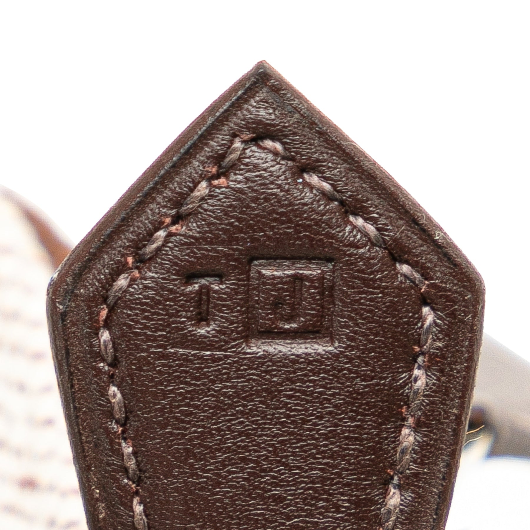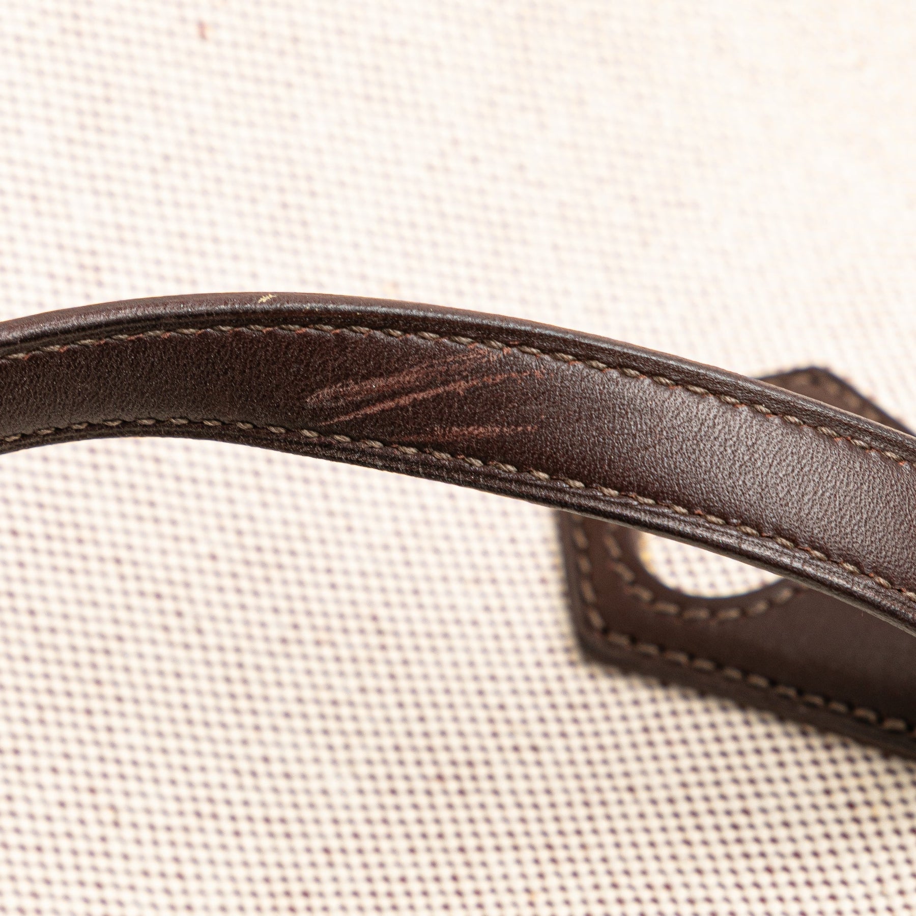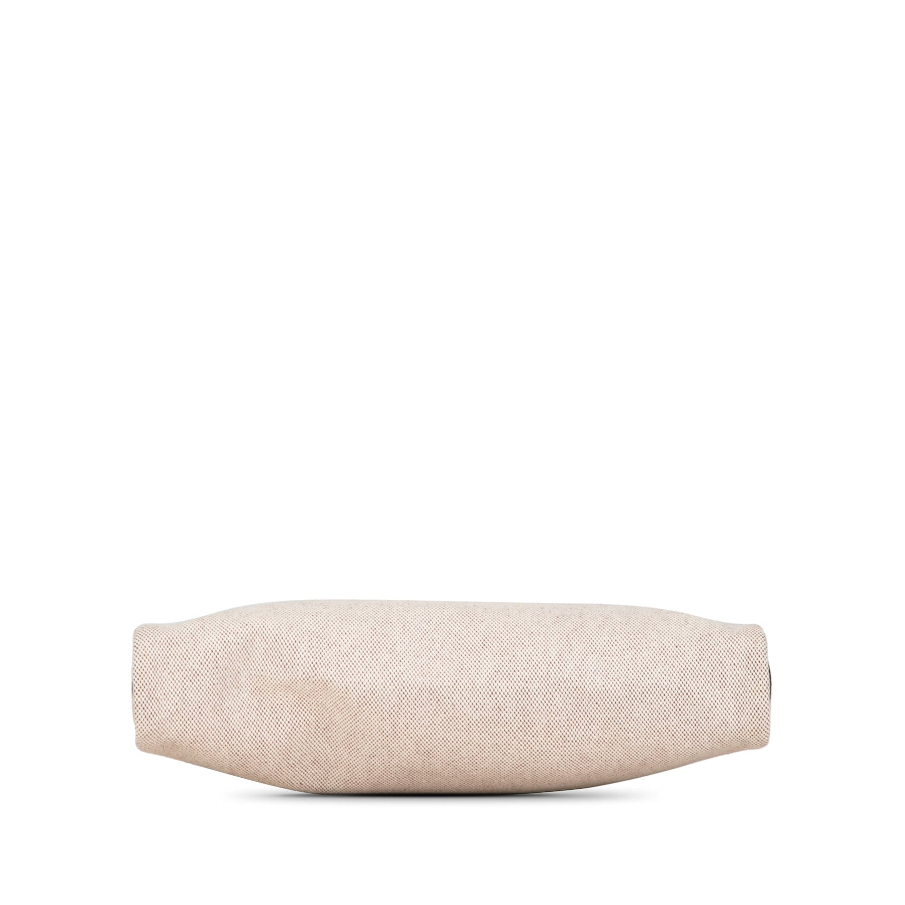 The Heeboo features a canvas body, flat leather handles, top zip closure, and interior open pocket.