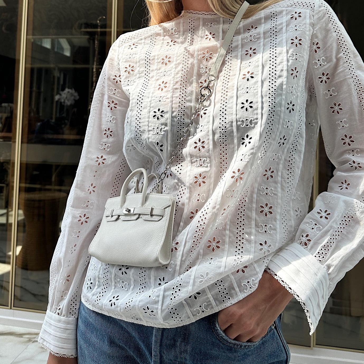 Unveiled in 2011, the Micro Birkin from Hermès is an exclusive, pint-sized version of the original, designed with an equal dedication to superior craftsmanship. This limited-edition handbag, made from the finest Swift leather and adorned with palladium hardware, measures a petite 5 inches in height and 9 inches in width, marking it as the smallest member of the illustrious Birkin family. Upon its debut, the Micro Birkin quickly caught the eye of style mavens and prominent celebrities, making numerous cameo appearances on the red carpets of Hollywood. This instant allure greatly reinforced the Birkin's stature as an iconic symbol of high fashion, leading to a significant escalation in the value of the entire Birkin range. Even though the Micro Birkin is no longer in production, it remains a highly desired artifact in the world of luxury fashion, treasured as an investment-worthy collector's item. Pictured with the lovely JF Charms collection, part of the JaneFinds Accessories collection.