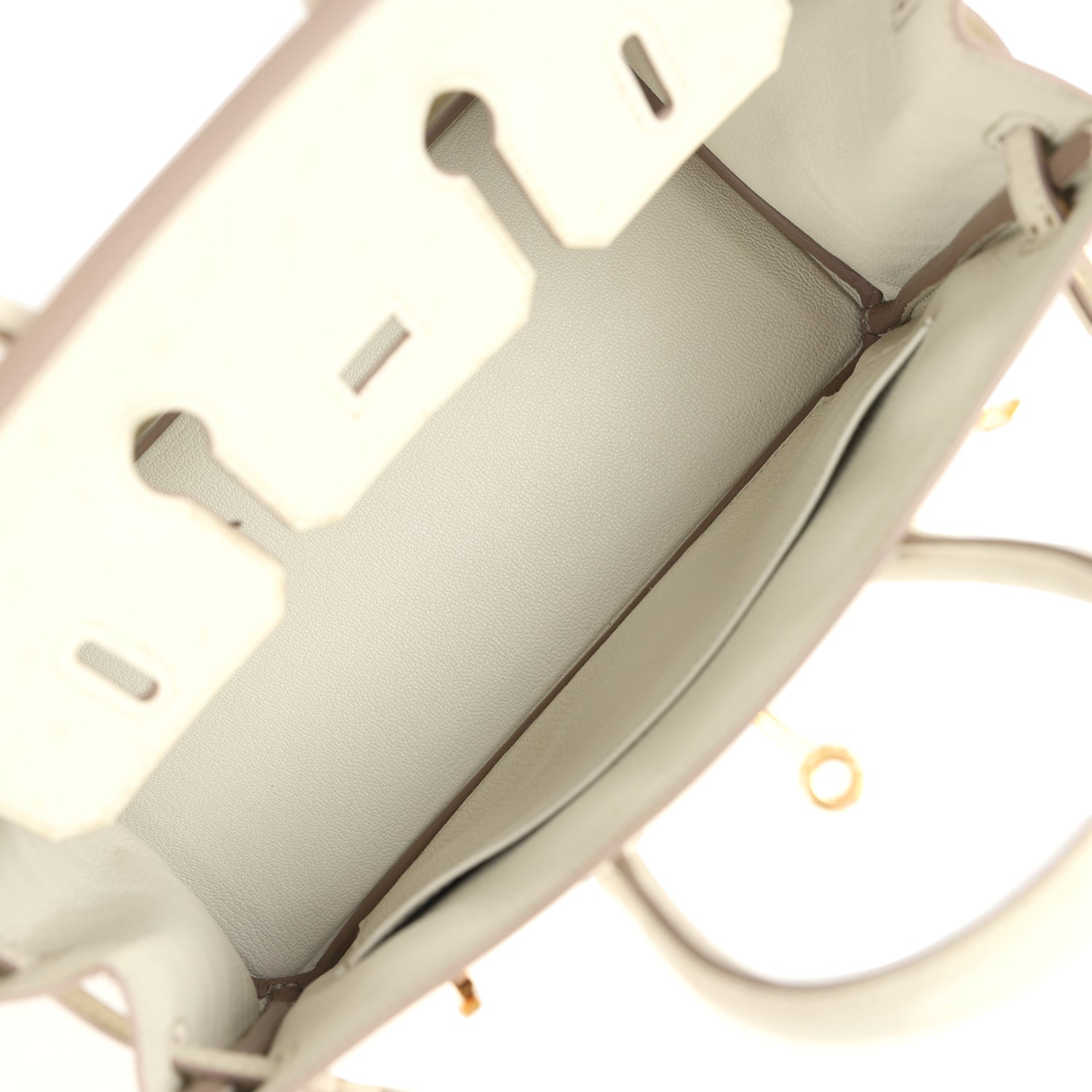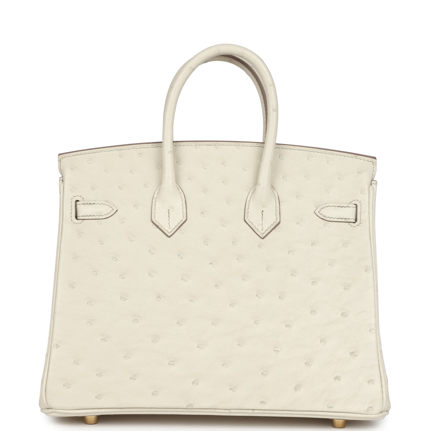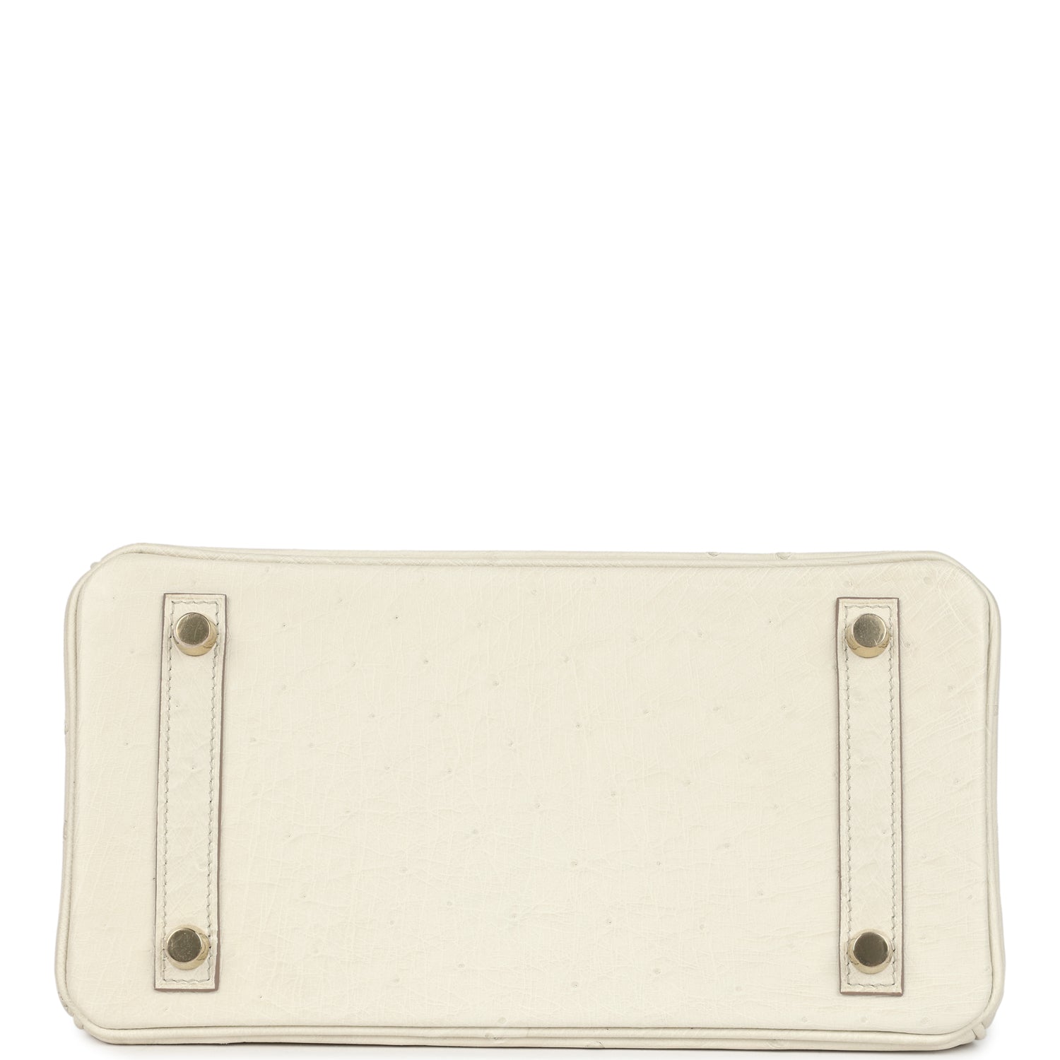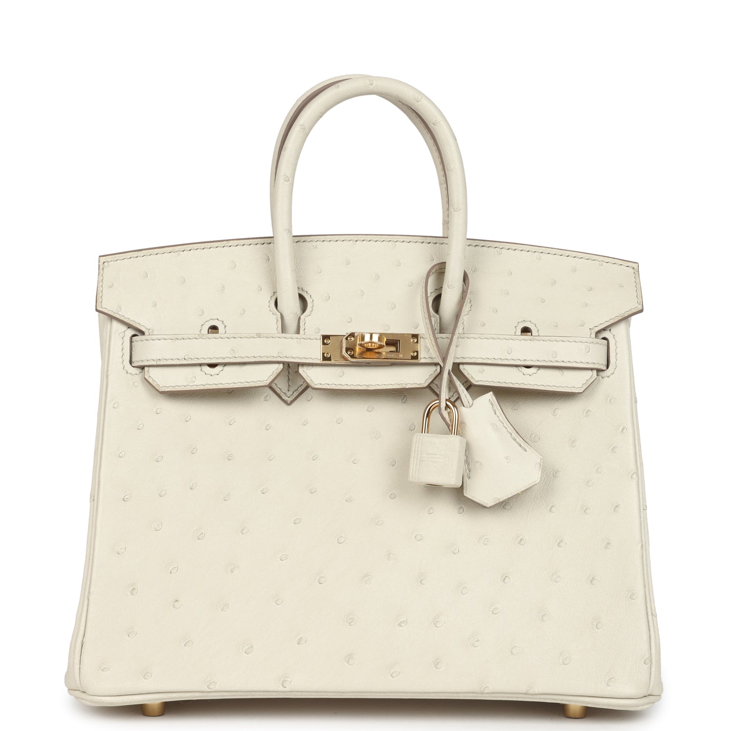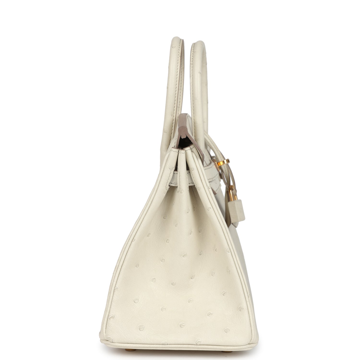 Birkin is in Beton ostrich leather with gold hardware, tonal stitching, front flap with two straps, front toggle closure, clochette with lock and two keys, and double rolled handles.