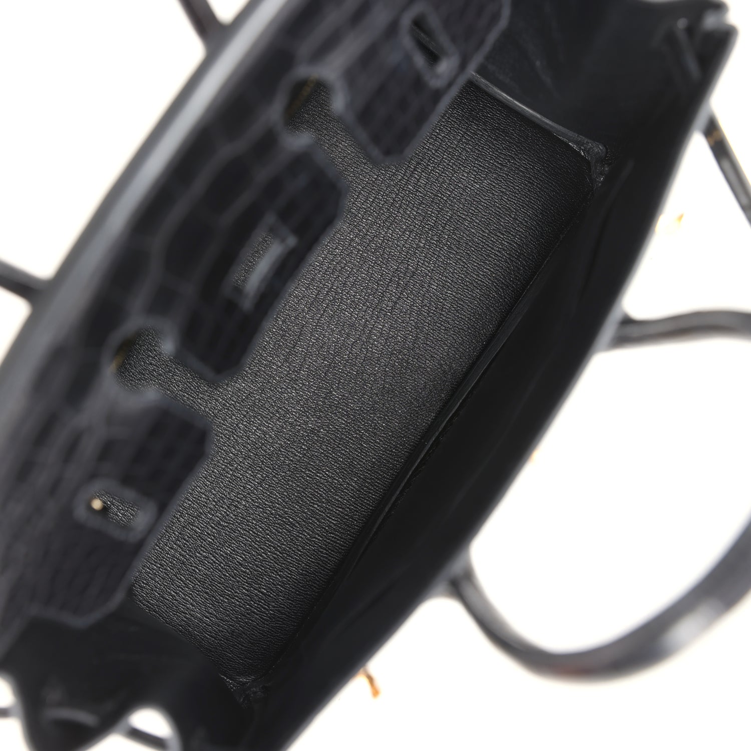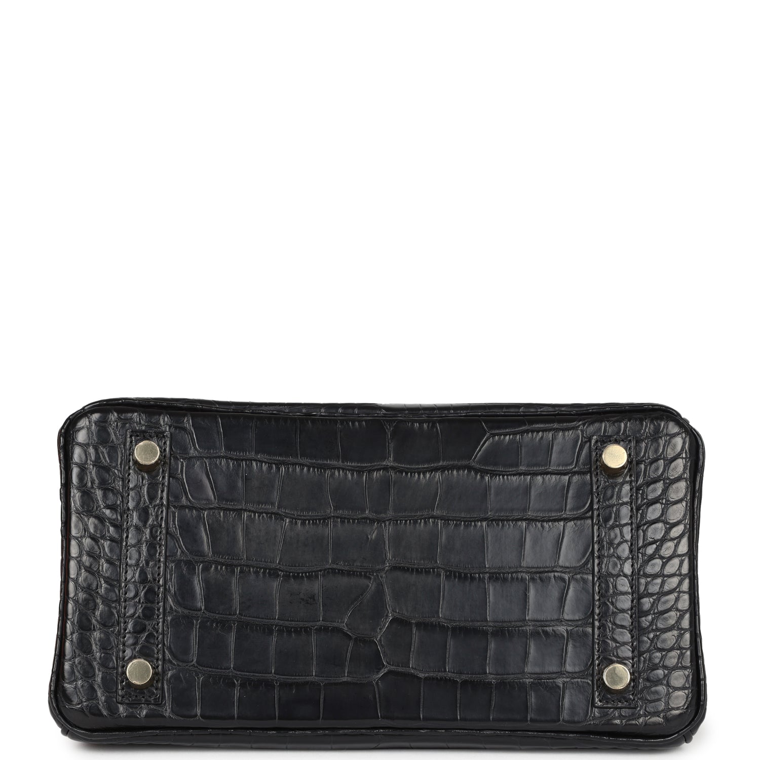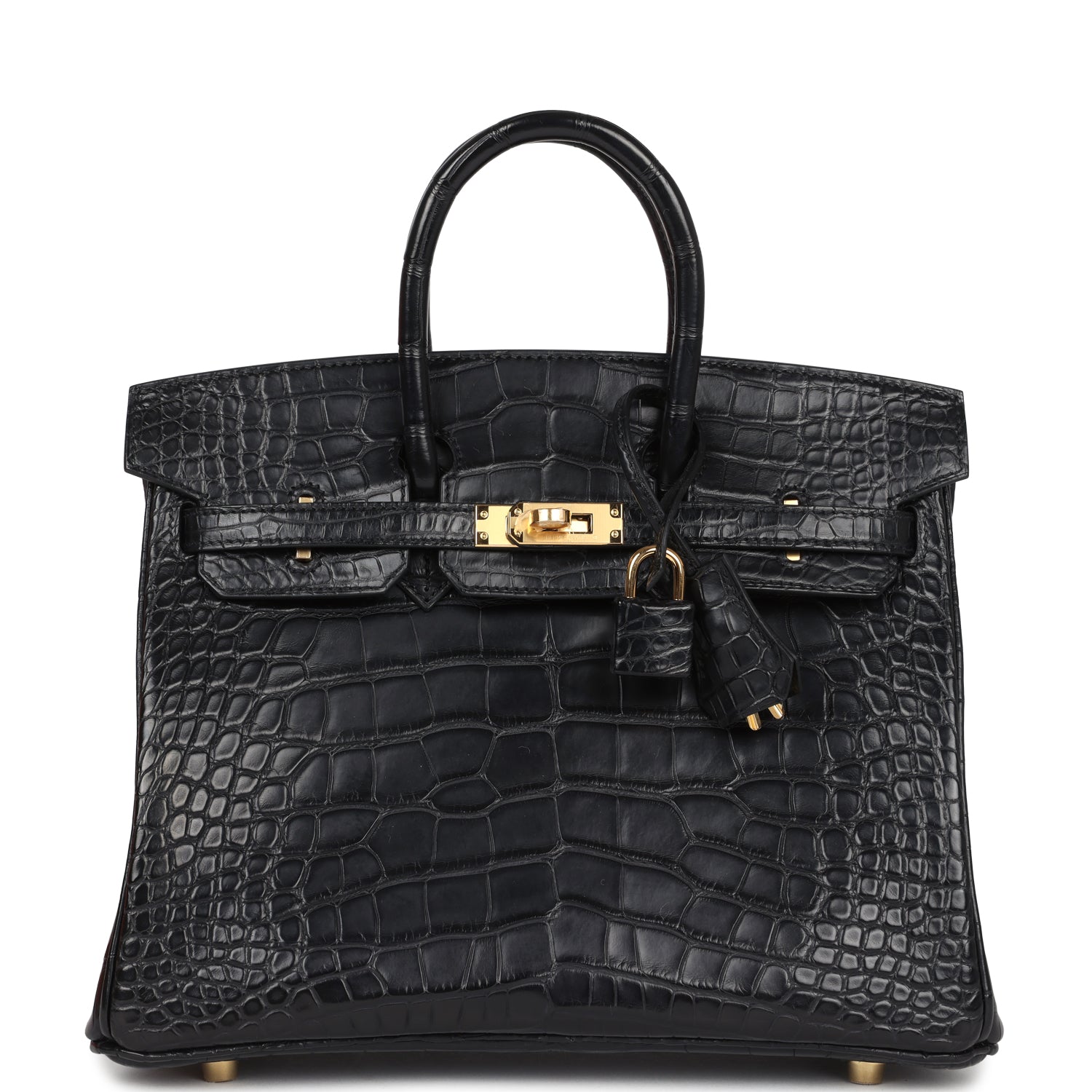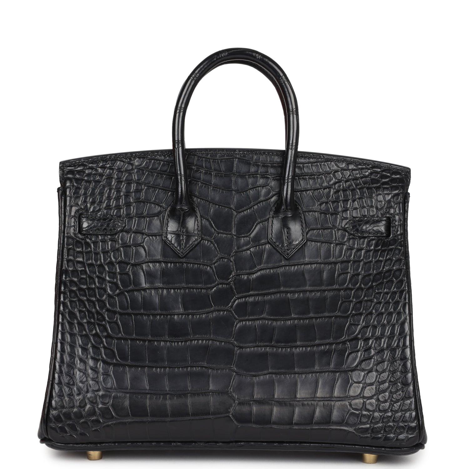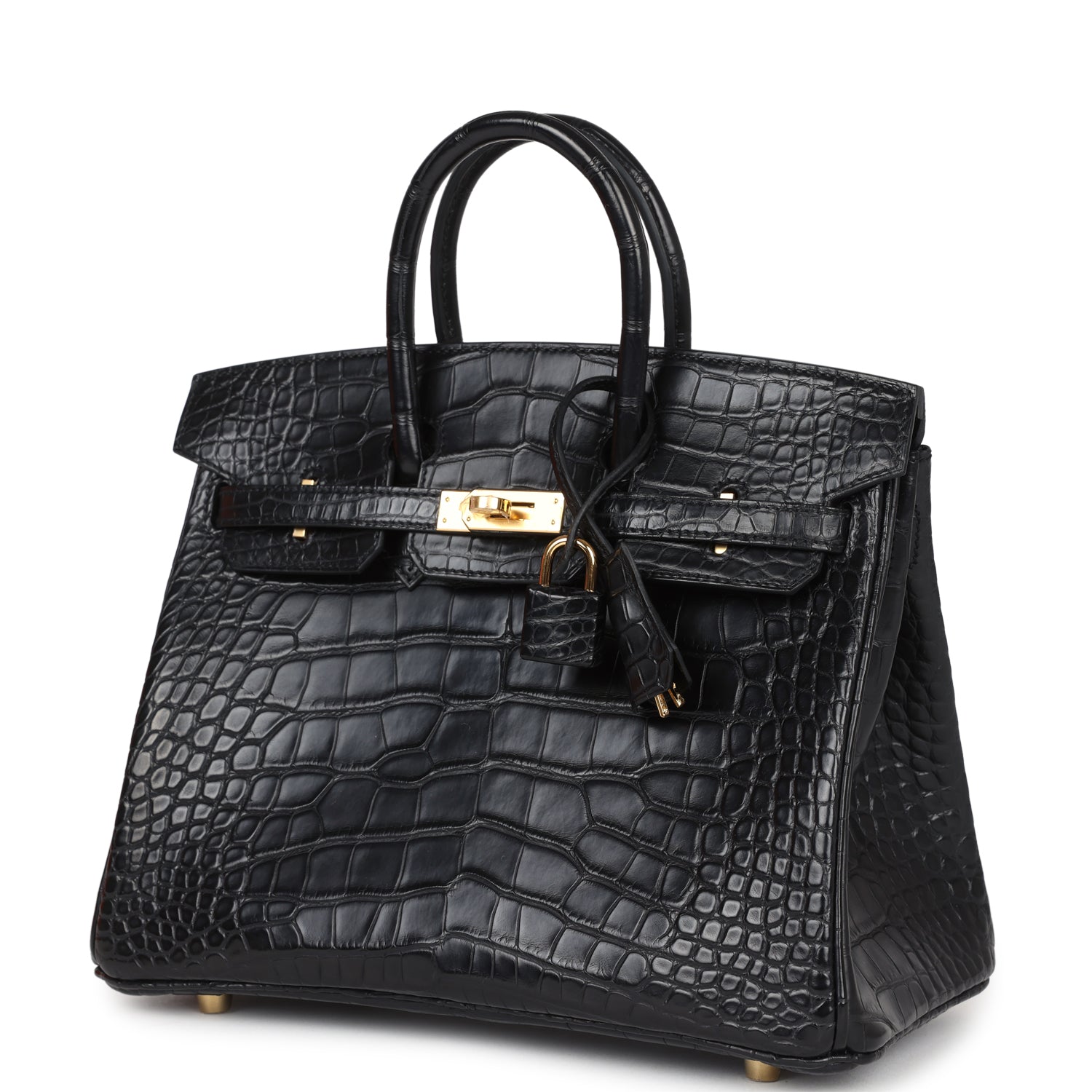 Birkin is in Black Matte Alligator Mississippiensis leather with Gold hardware, tonal stitching, front flap with two straps, front toggle closure, clochette with lock and two keys, and double rolled handles.