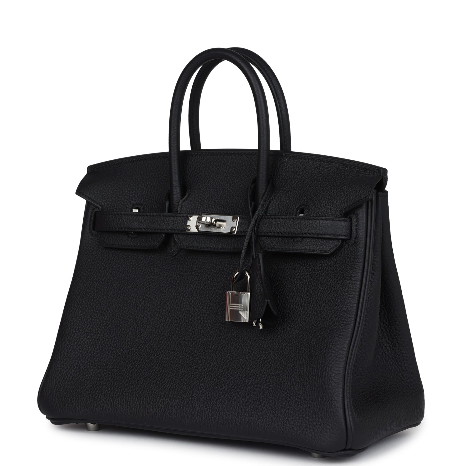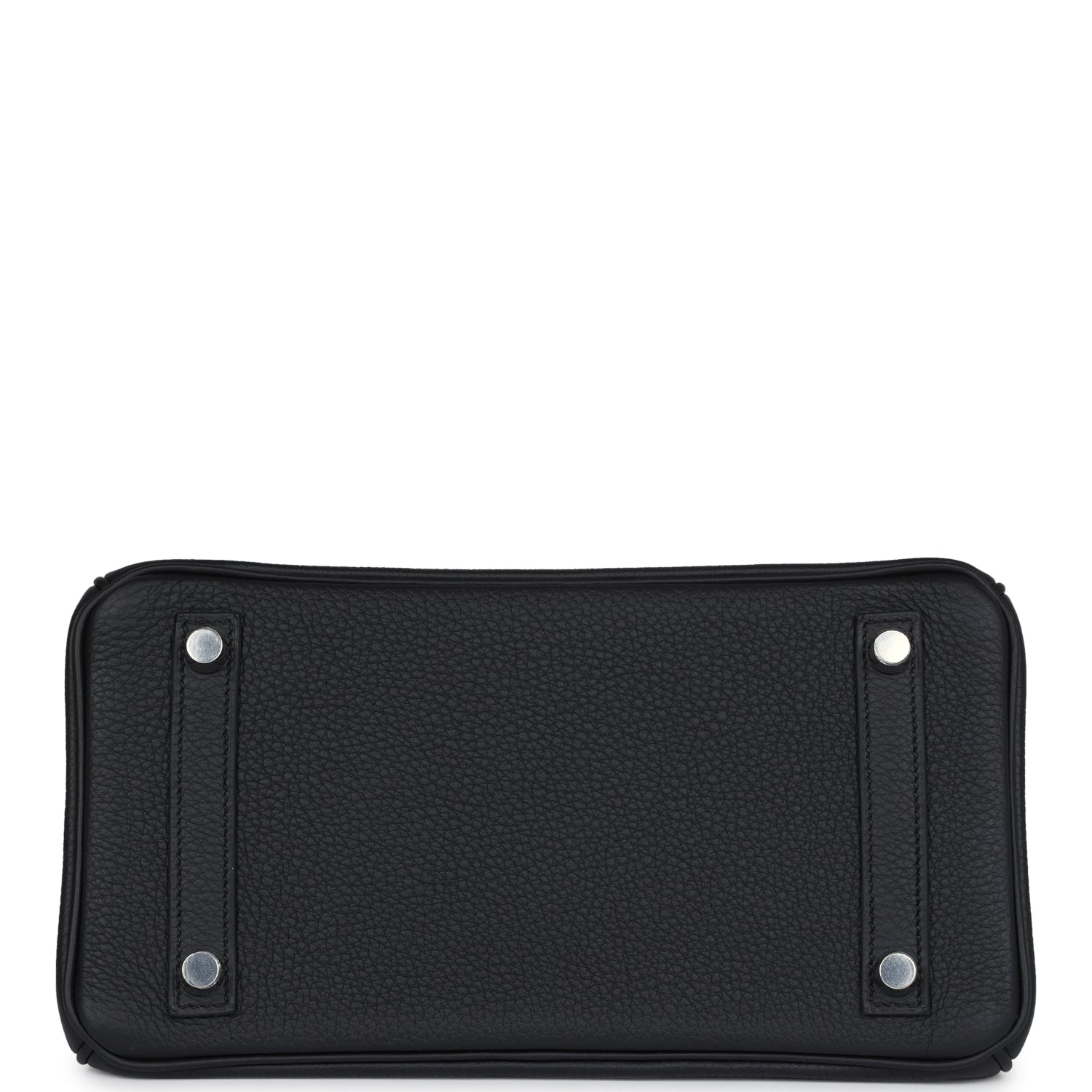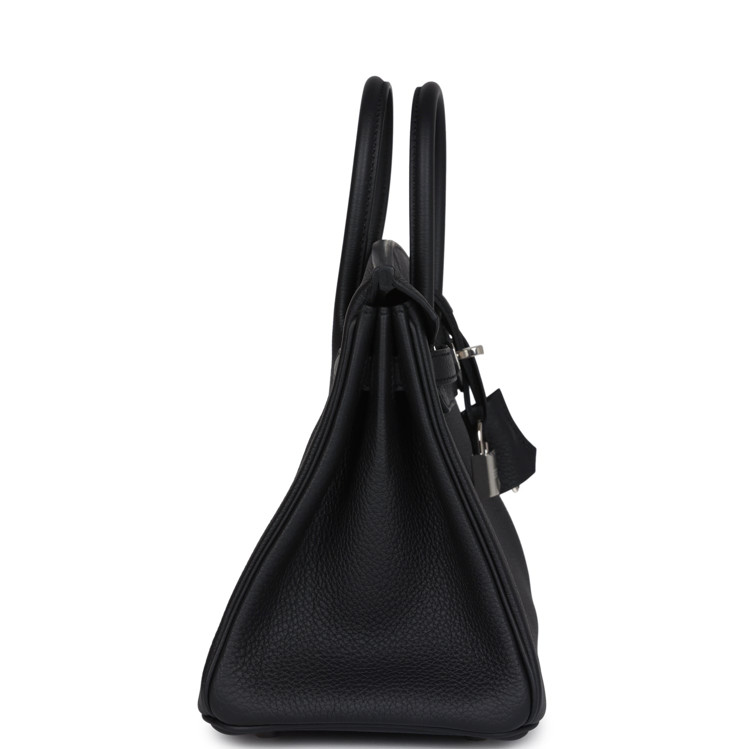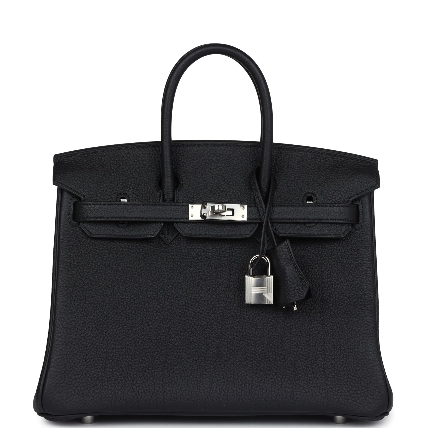 Birkin is in Black togo leather with palladium hardware and has tonal stitching, front flap, two straps with center toggle closure, clochette with lock and two keys, and double rolled handles.