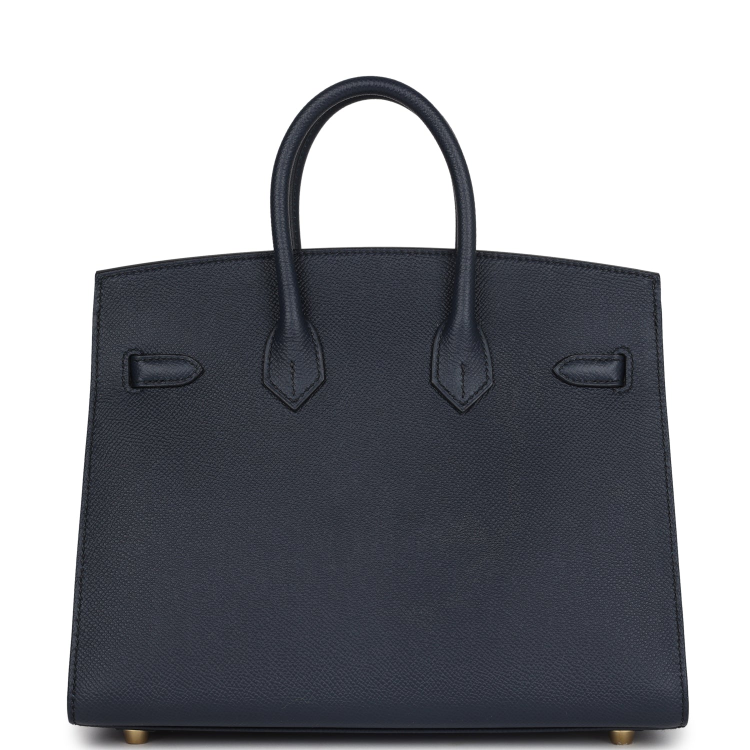 This Birkin is in Bleu Indigo epsom leather with gold hardware and has tonal stitching, front flap, two straps with center toggle closure, clochette with lock and two keys, and double rolled handles.