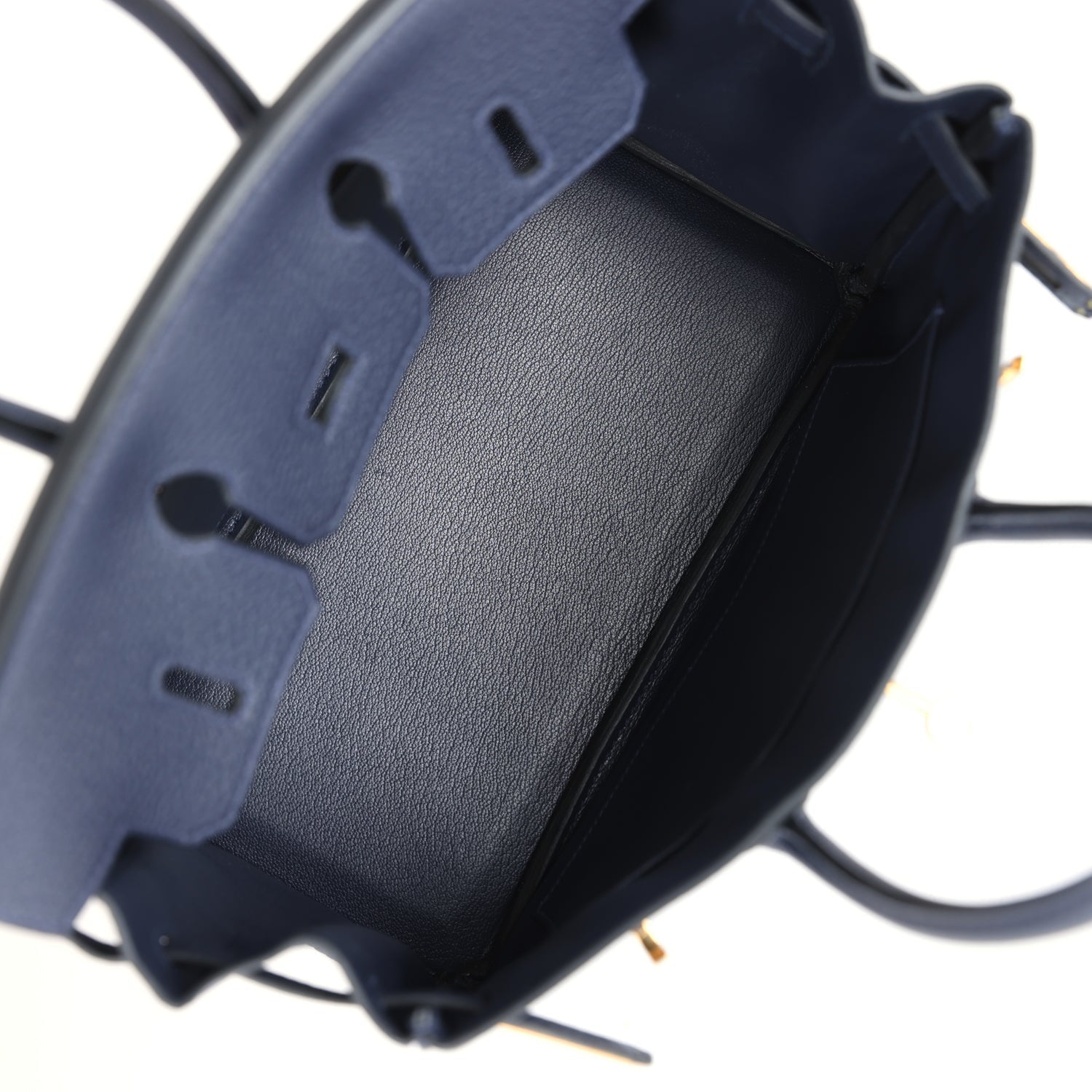 The interior is lined with Blue Nuit chevre, has one zip pocket with an Hermes engraved zipper pull and an open pocket on the opposite side.