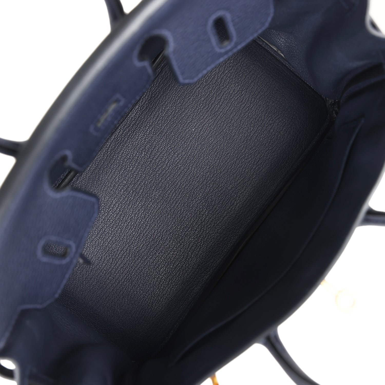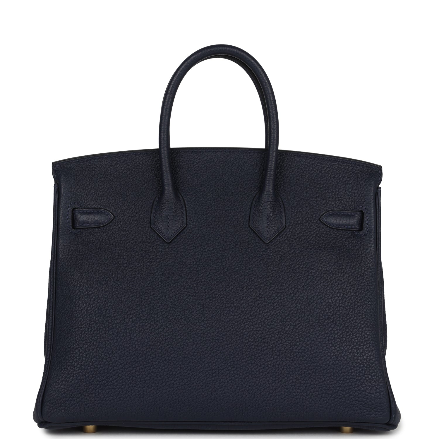This Birkin is in Bleu Nuit togo leather with gold hardware and has tonal stitching, a front flap, two straps with center toggle closure, clochette with lock and two keys, and double rolled handles.