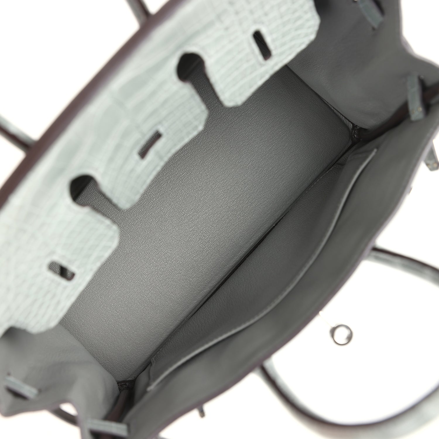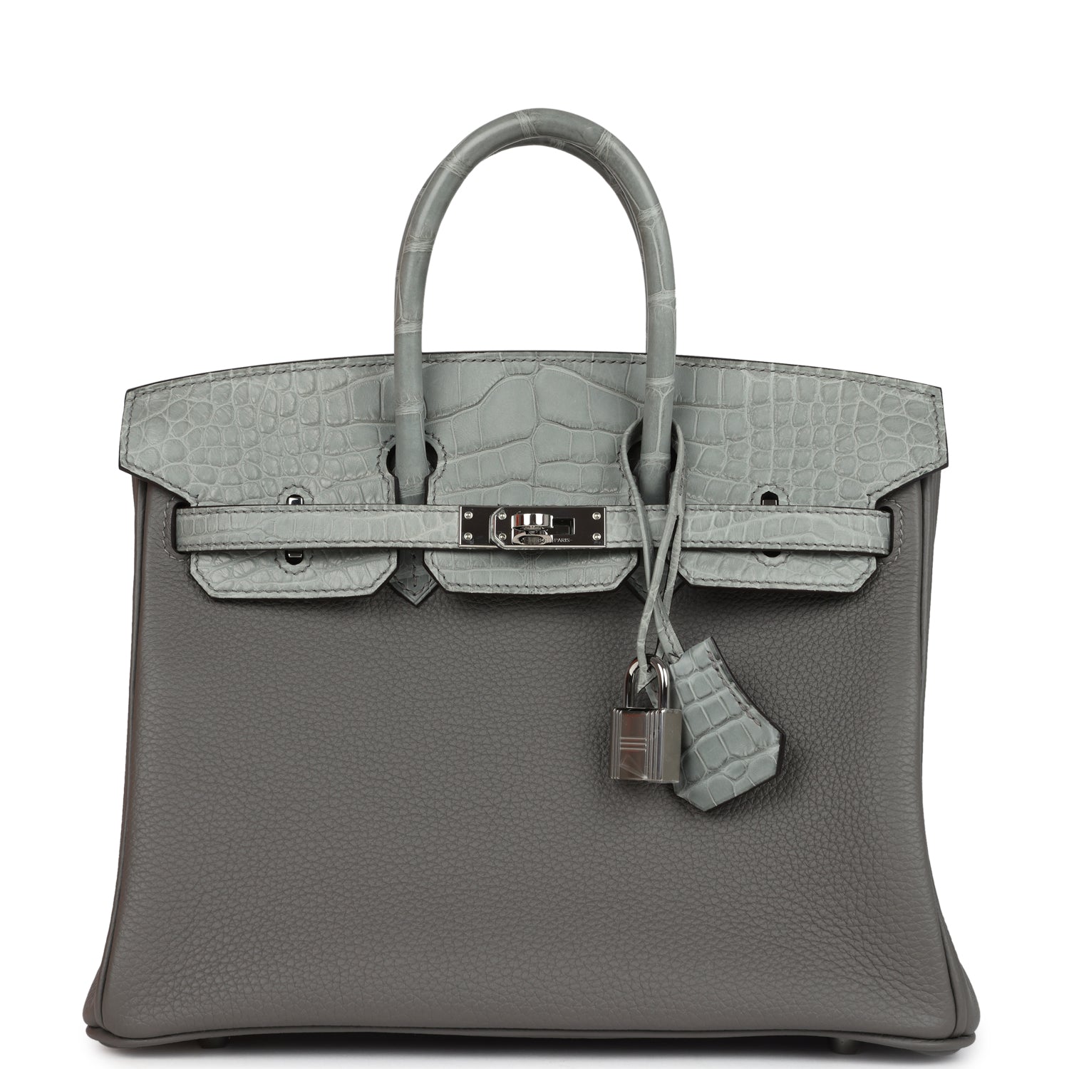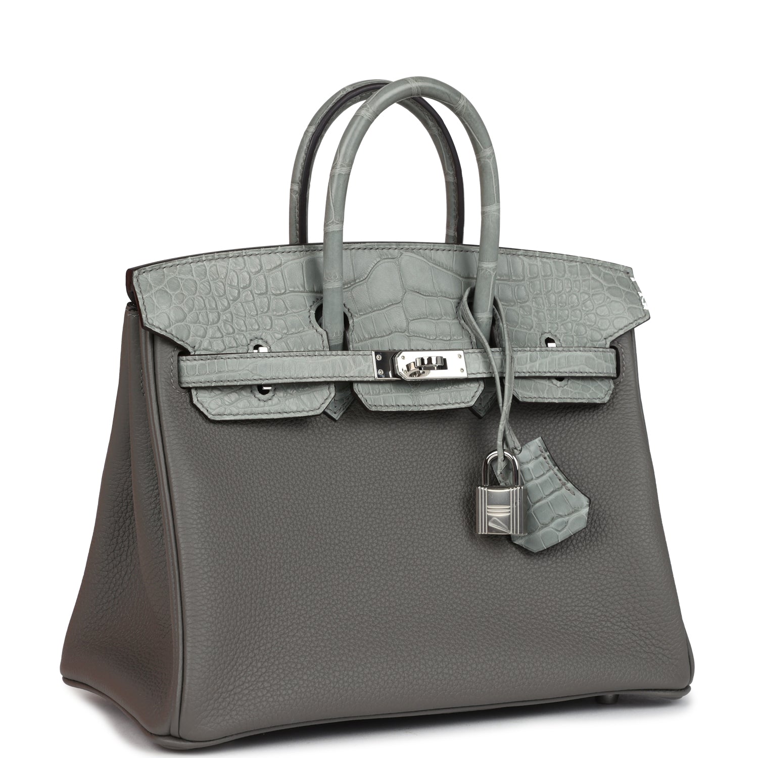 This Birkin "Touch" is in Gris Ciment Matte Alligator Mississippiensis leather and Gris Meyer togo leather with palladium hardware and has tonal stitching, two straps with front toggle closure, clochette with lock and two keys and double rolled alligator handles.