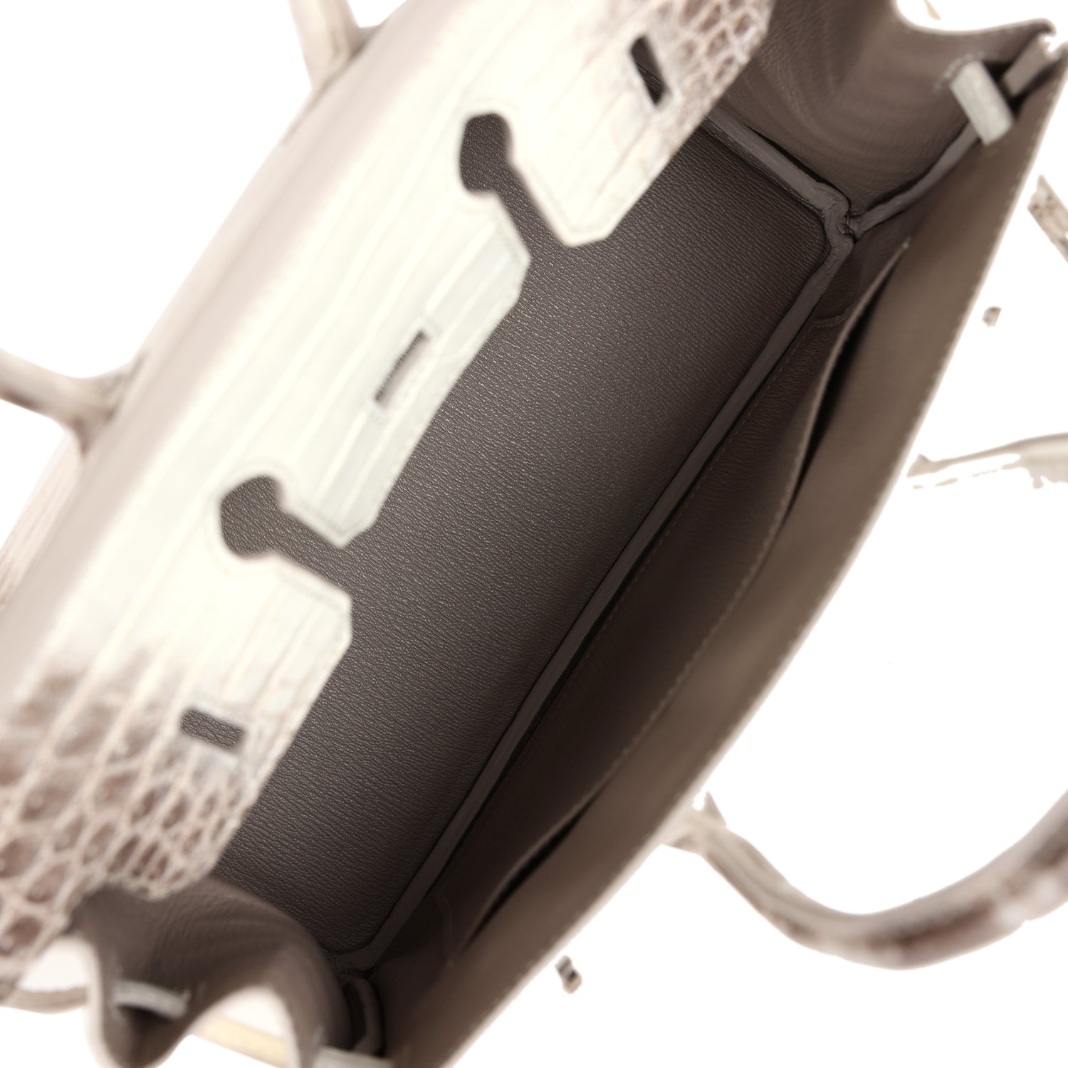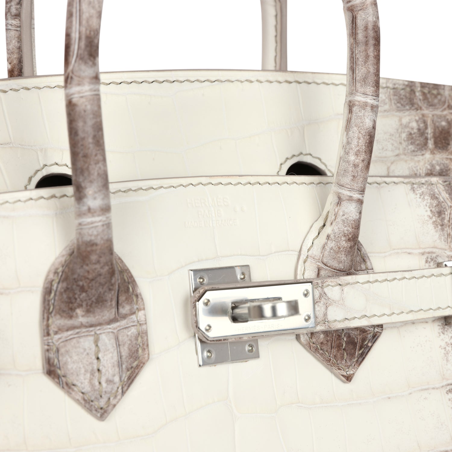 Himalaya Birkin is in Niloticus crocodile leather with palladium hardware and has contrast stitching, front flap, two straps with center toggle closure, clochette with lock and two keys, and double rolled handles.