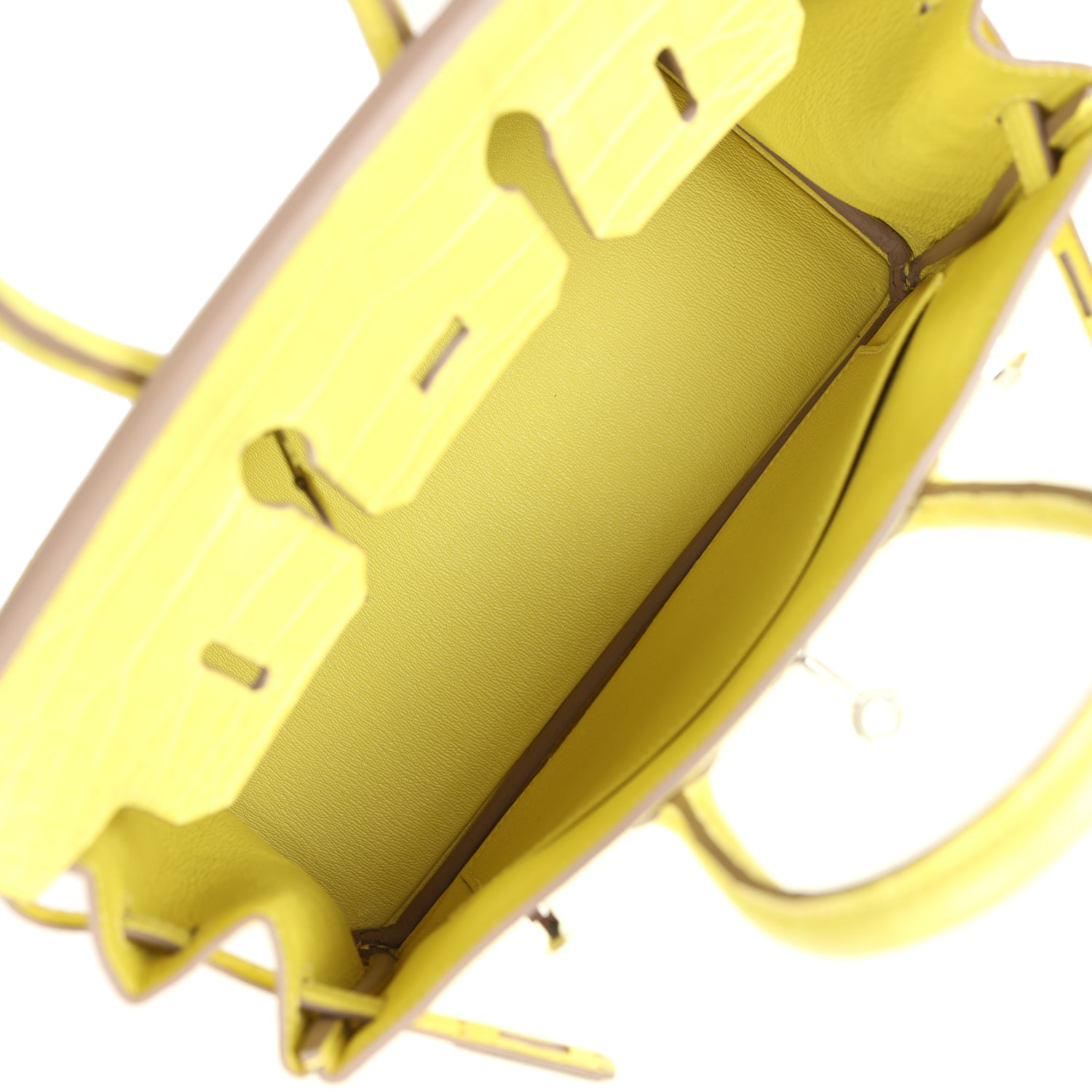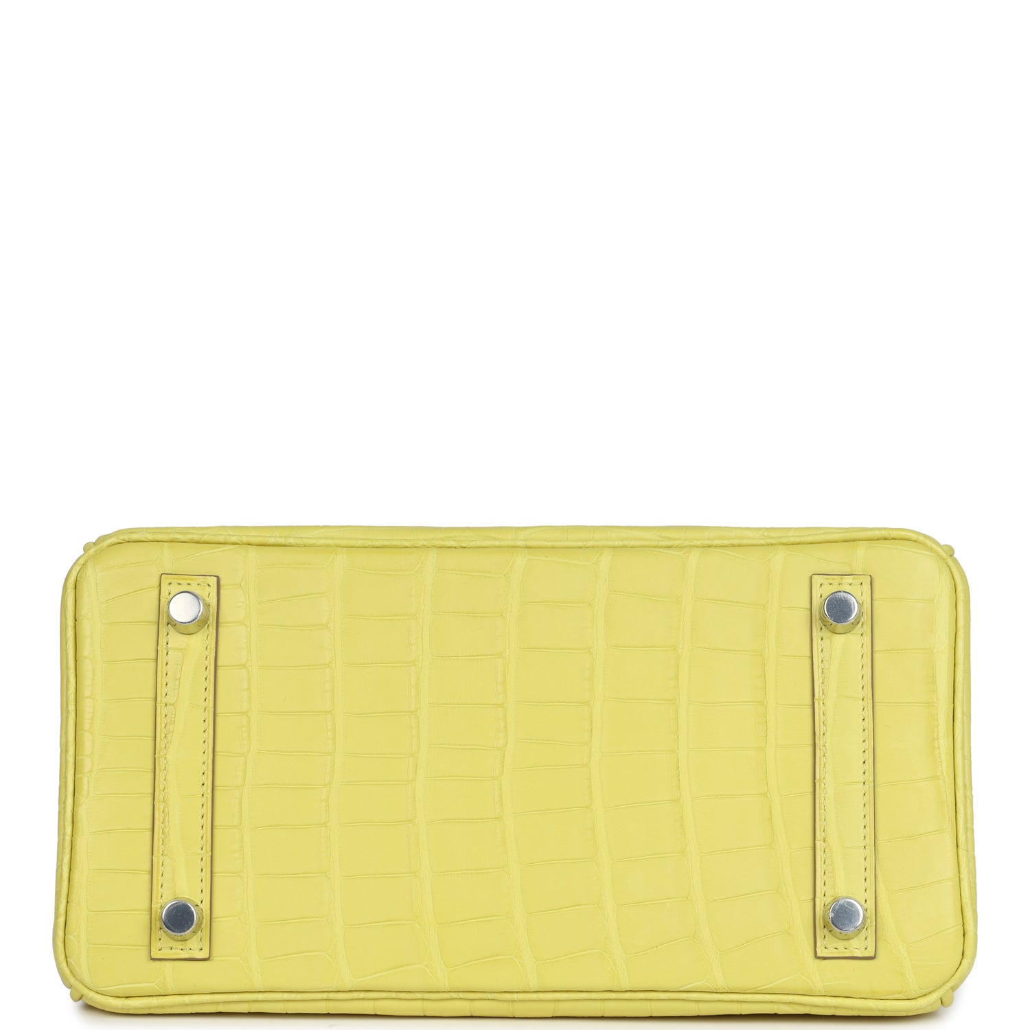 Birkin is in Lime Mississippiensis Matte Alligator leather with palladium hardware, has tonal stitching, front flap, two straps with center toggle closure, clochette with lock and two keys, and double rolled handles.