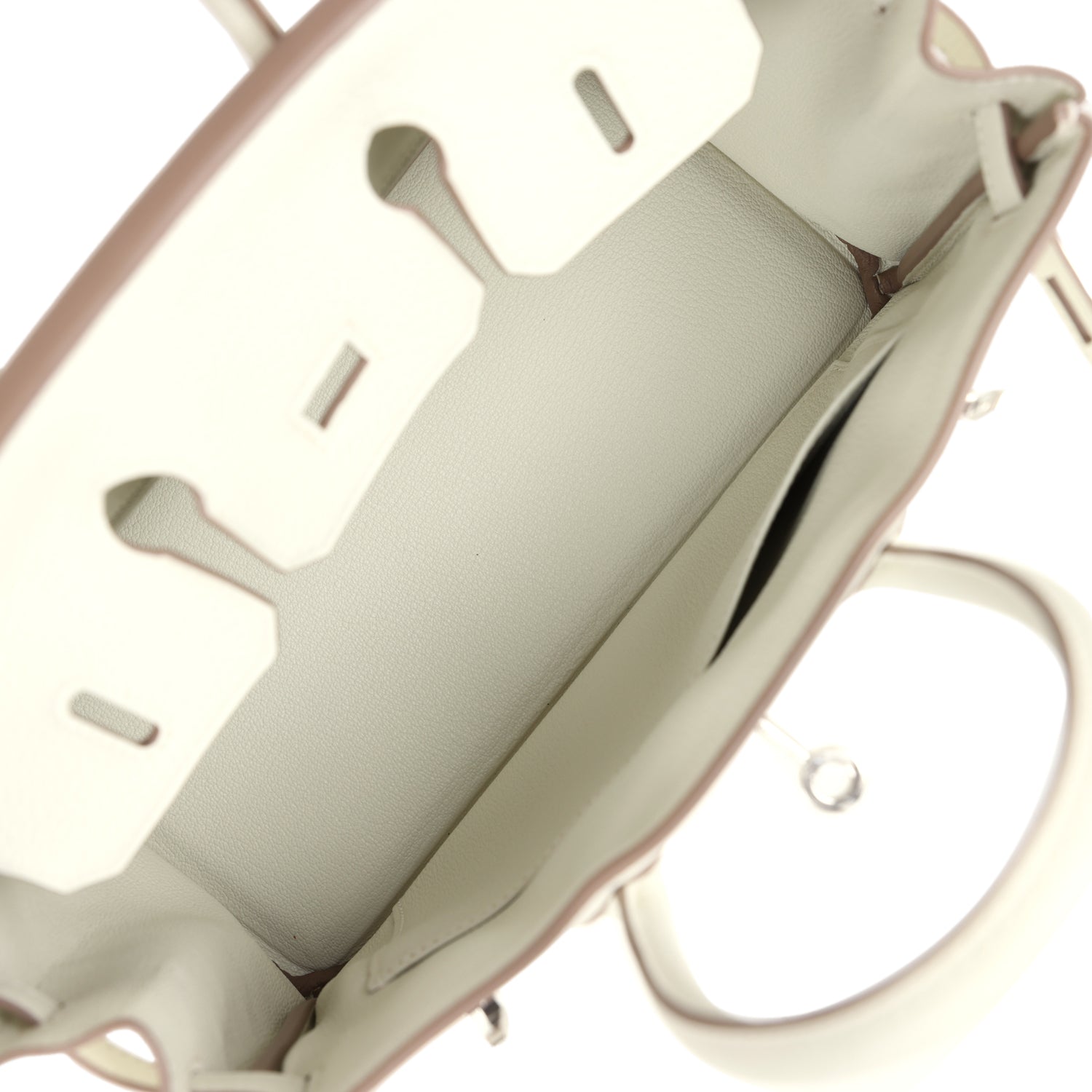 The interior is lined with Mushroom chevre leather and has one zip pocket with an Hermes engraved zipper pull and an open pocket on the opposite side.
