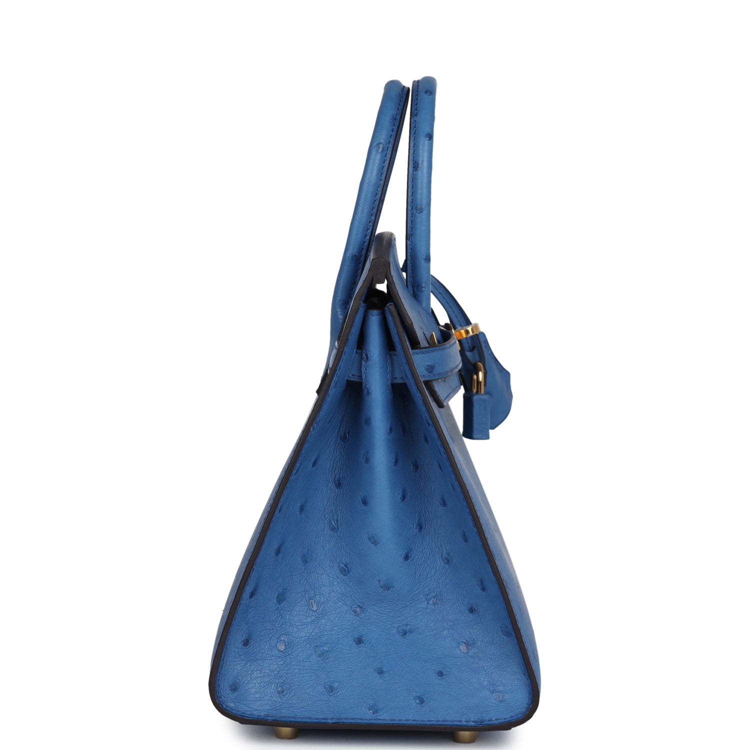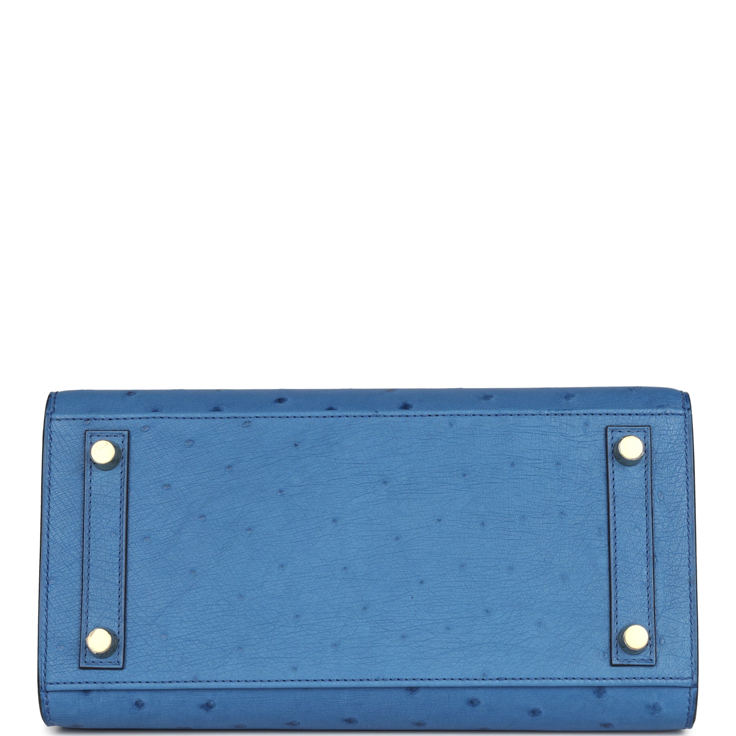 This Birkin is in Mykonos Ostrich leather with gold hardware, tonal stitching, front flap with two straps, front toggle closure, clochette with lock and two keys, and double rolled handles.
