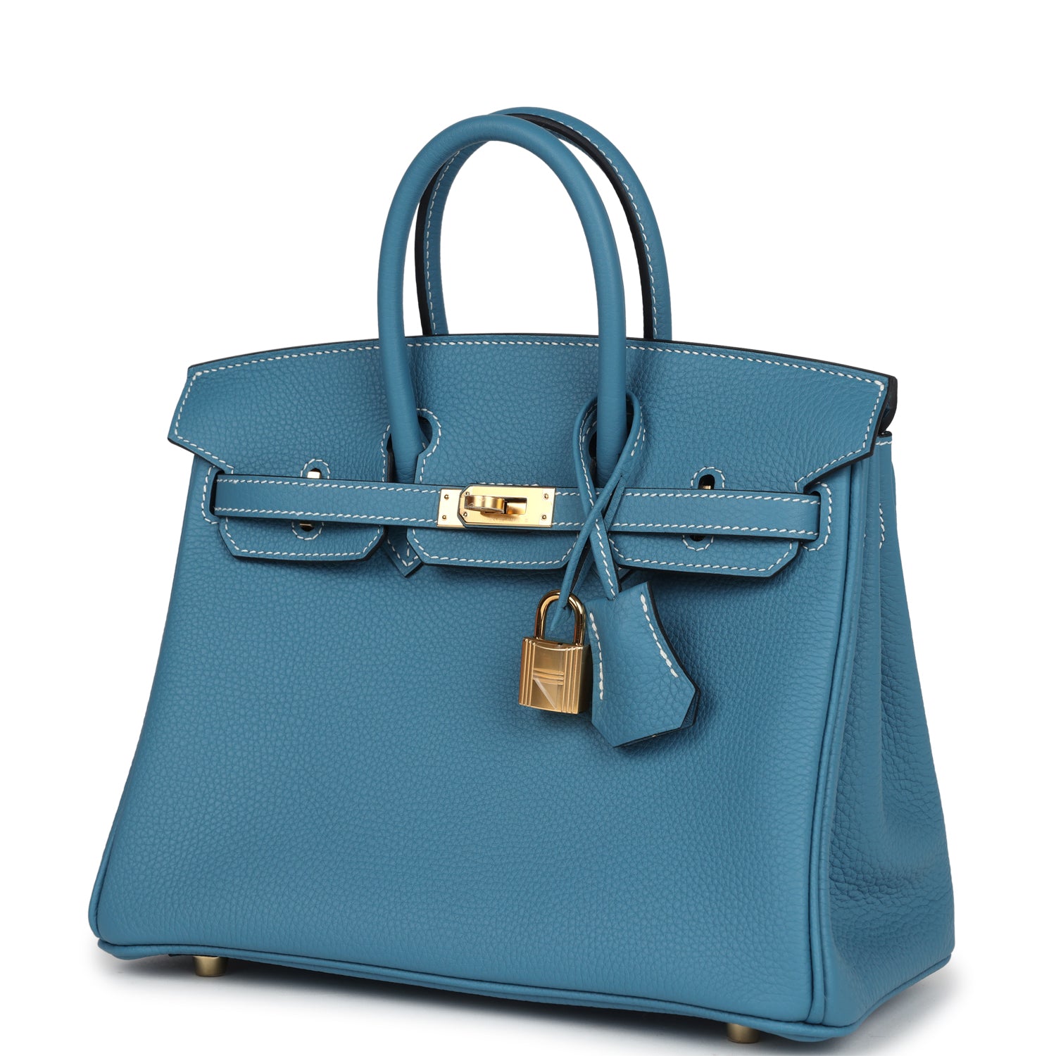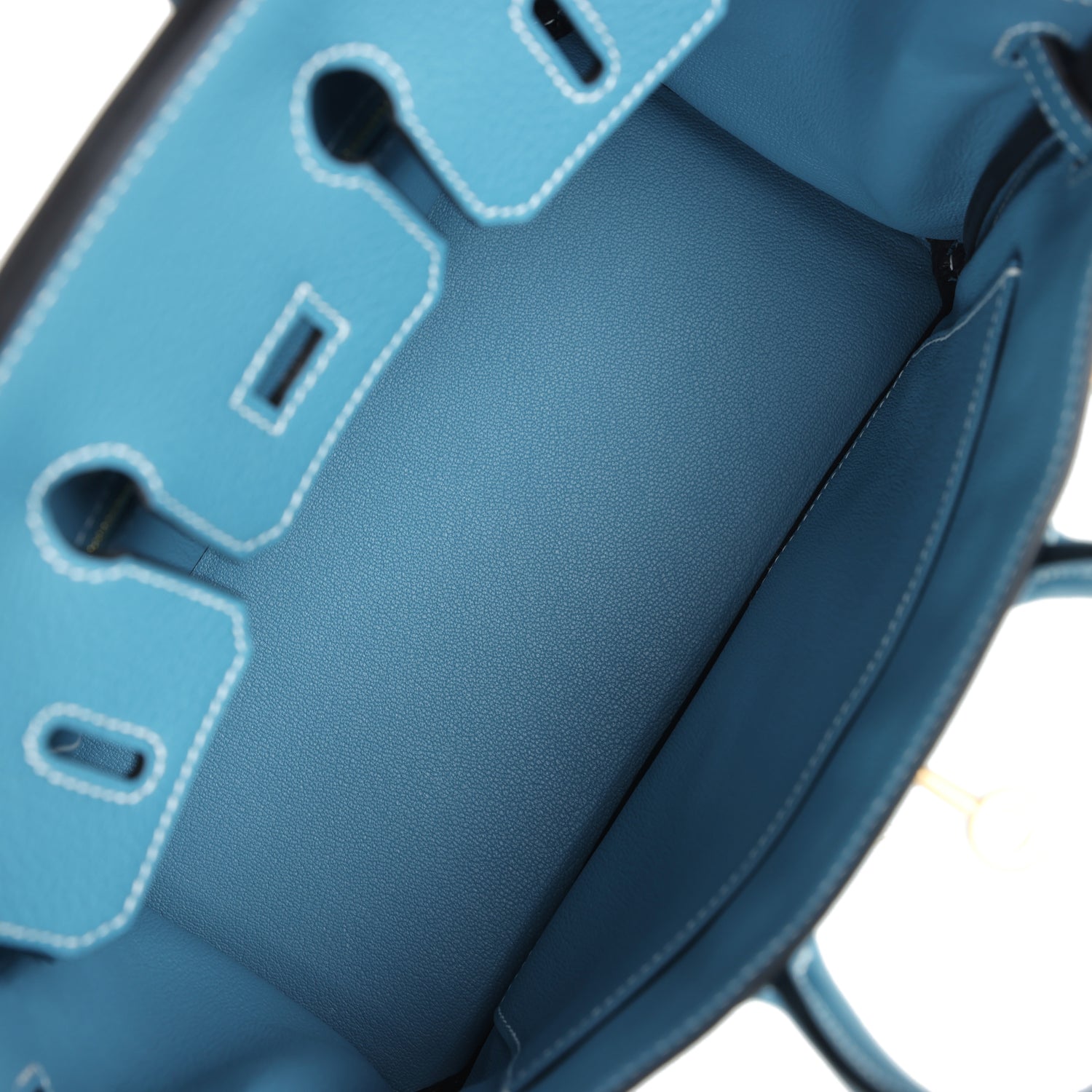 This Birkin is in Blue Jean togo leather with gold hardware and has contrast stitching, a front flap, two straps with center toggle closure, clochette with lock and two keys, and double rolled handles.