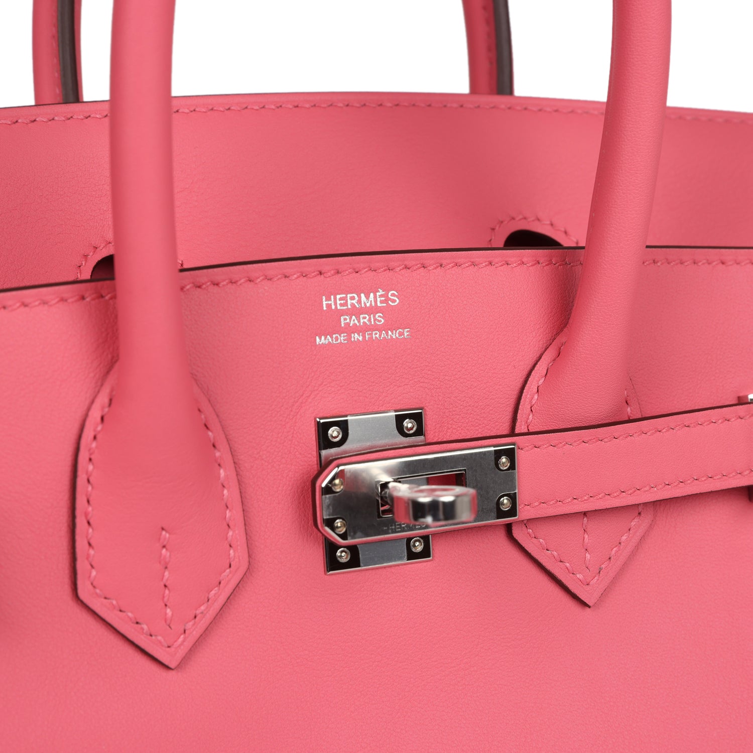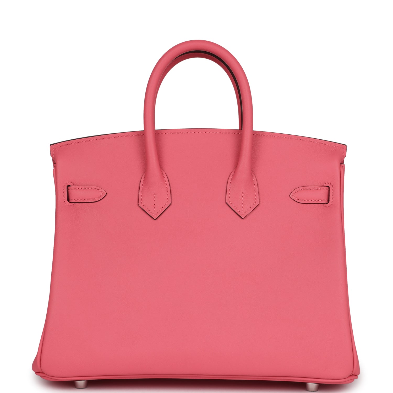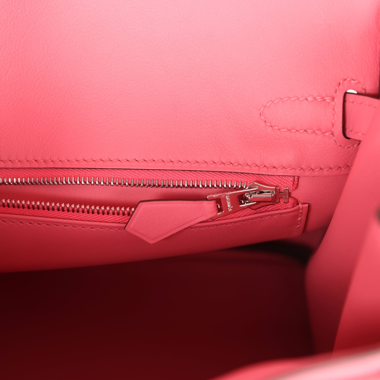 Birkin is in Rose Azalee swift with palladium hardware and features tonal stitching, front flap, two straps with center toggle closure, clochette with lock and two keys, and double rolled handles.