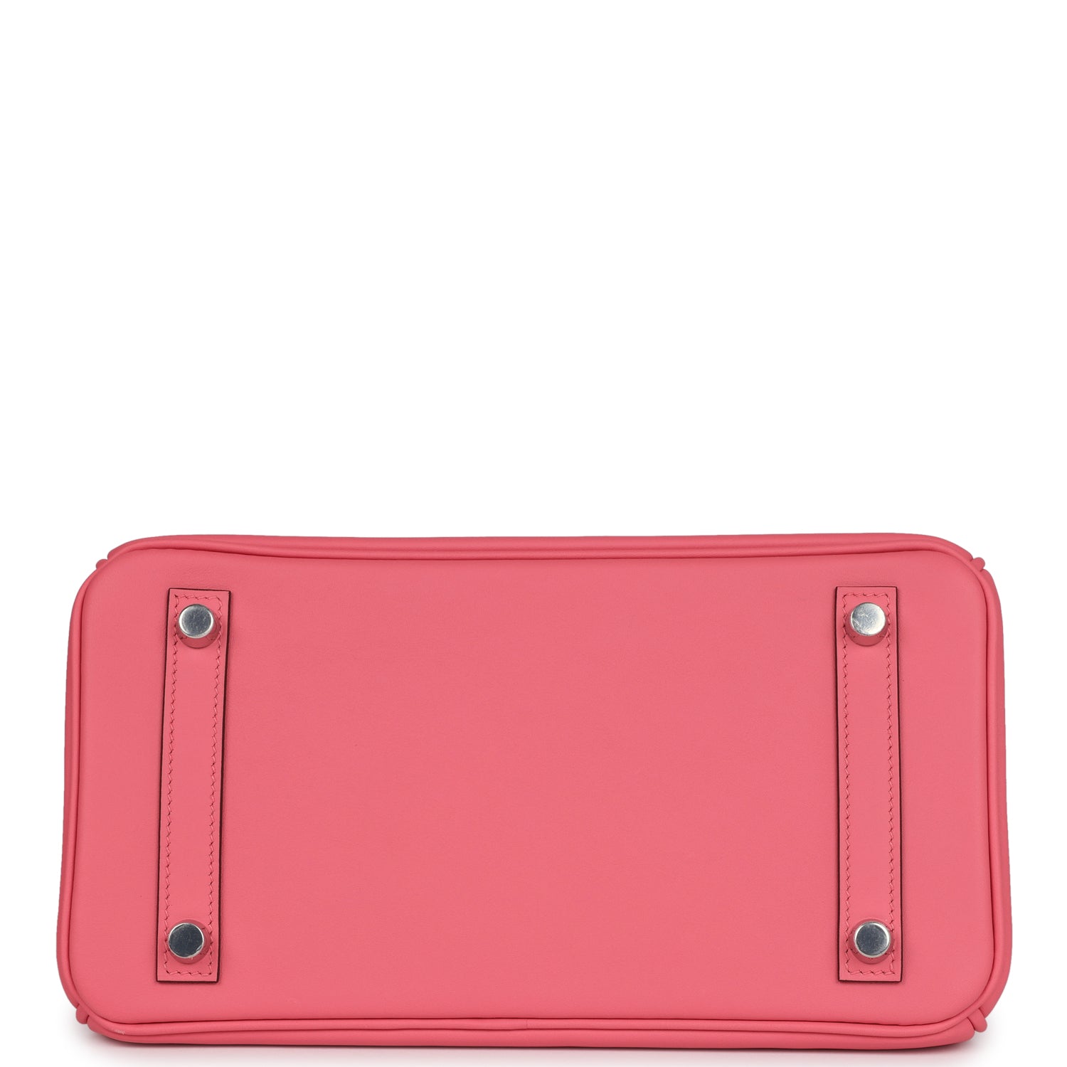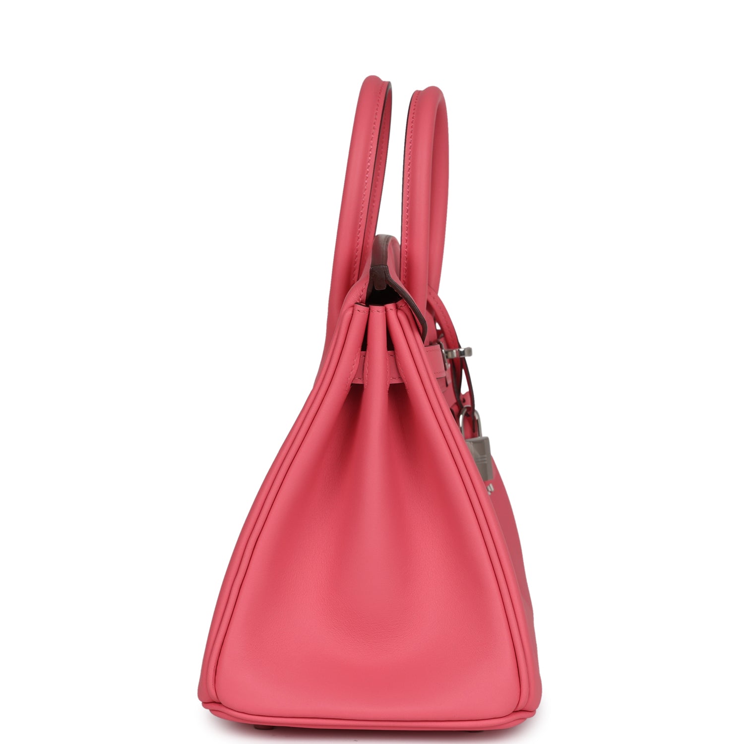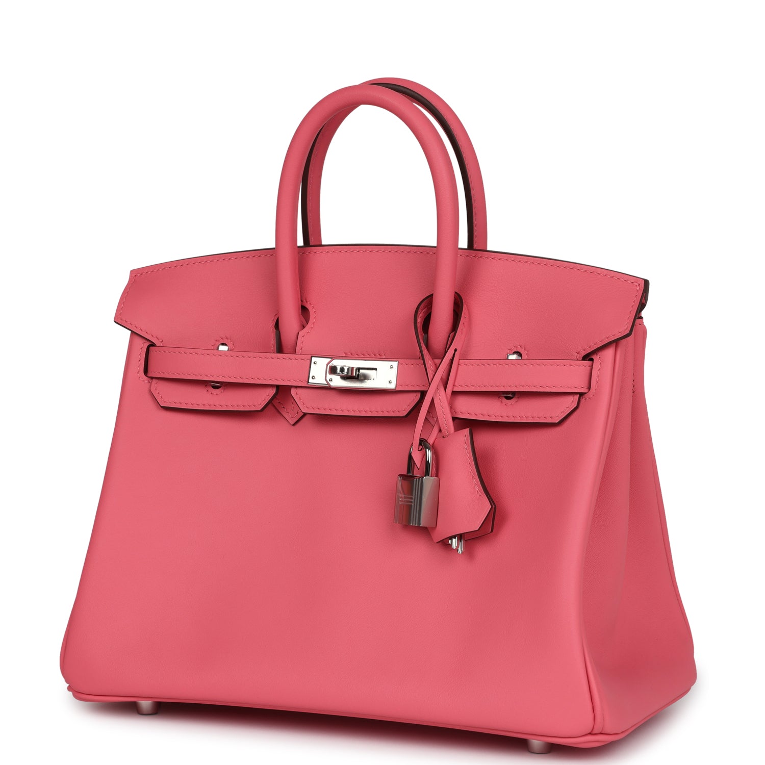 Birkin is in Rose Azalee swift with palladium hardware and features tonal stitching, front flap, two straps with center toggle closure, clochette with lock and two keys, and double rolled handles.