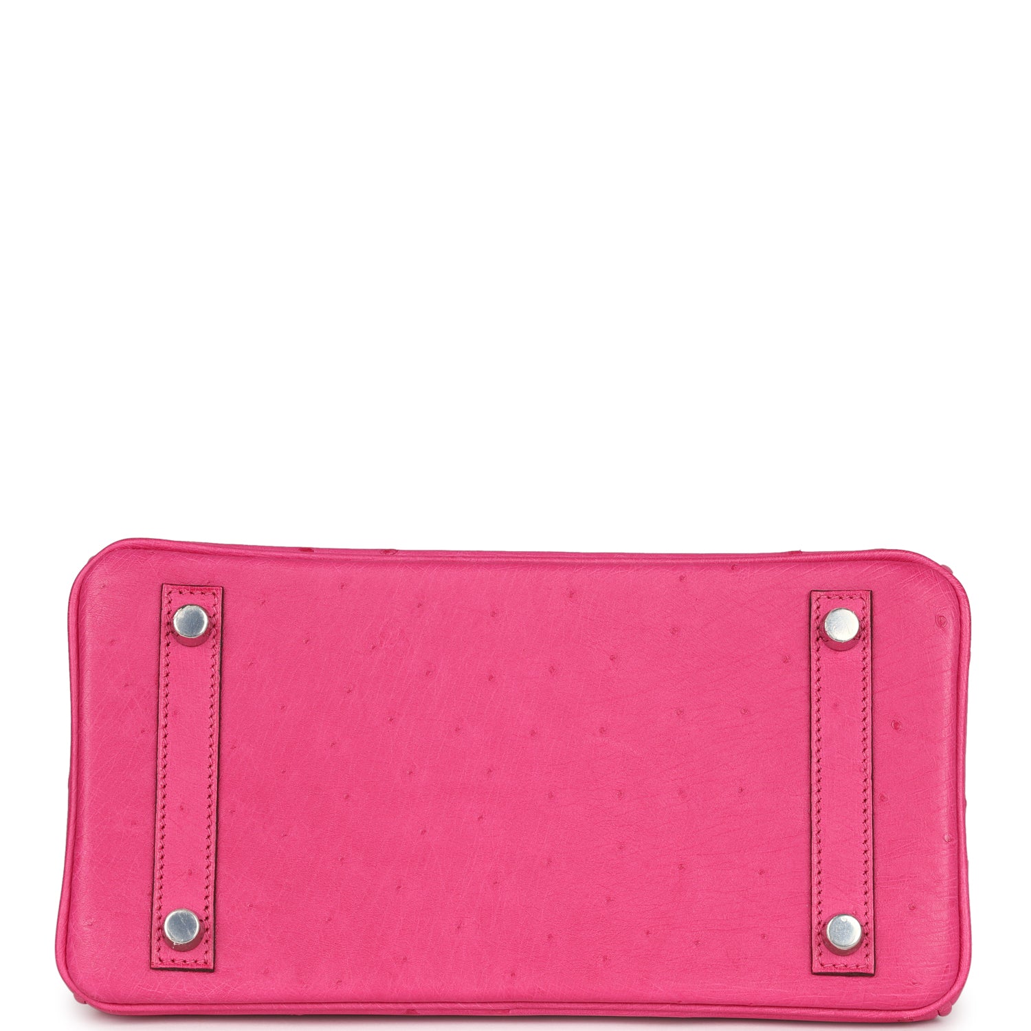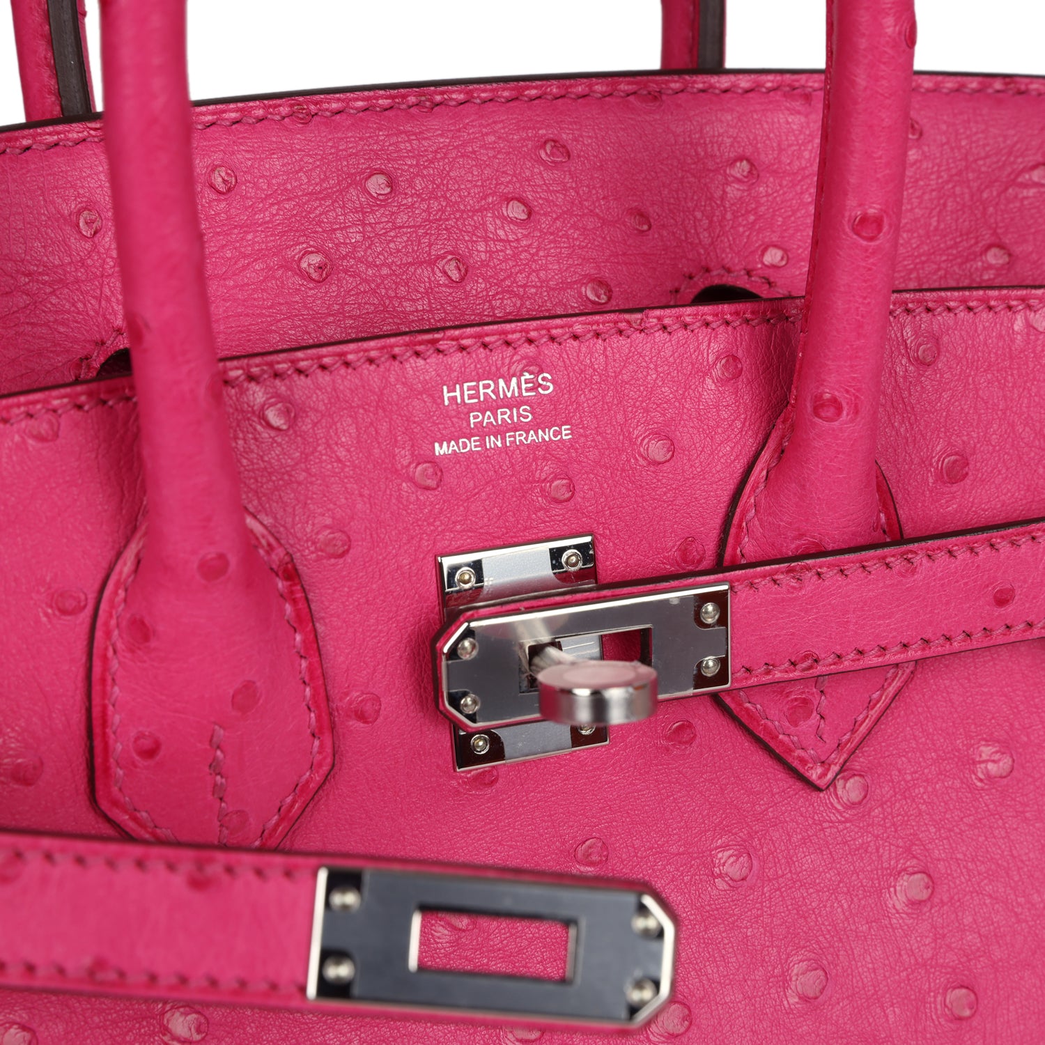 Birkin is in Rose Tyrien Ostrich leather with palladium hardware, tonal stitching, front flap with two straps, front toggle closure, clochette with lock and two keys, and two rolled handles.