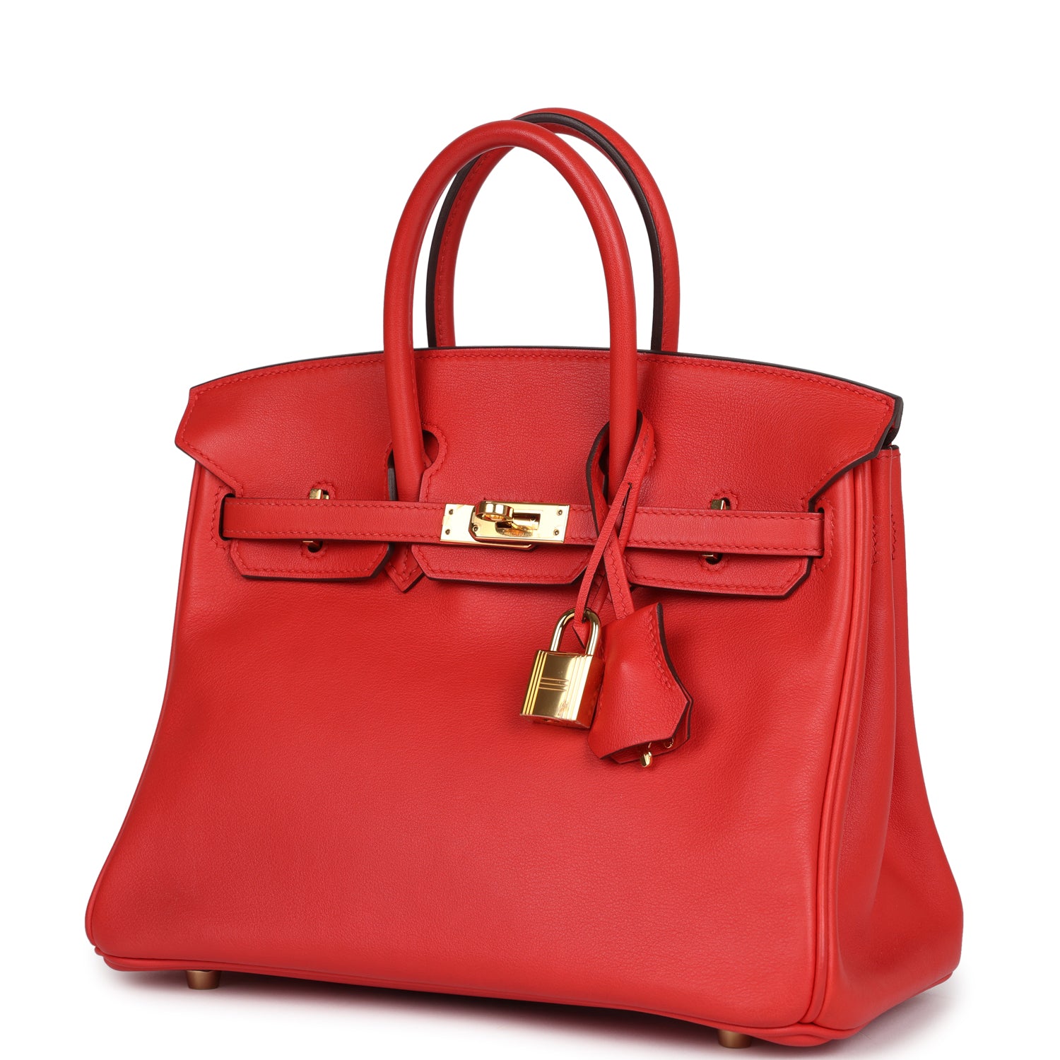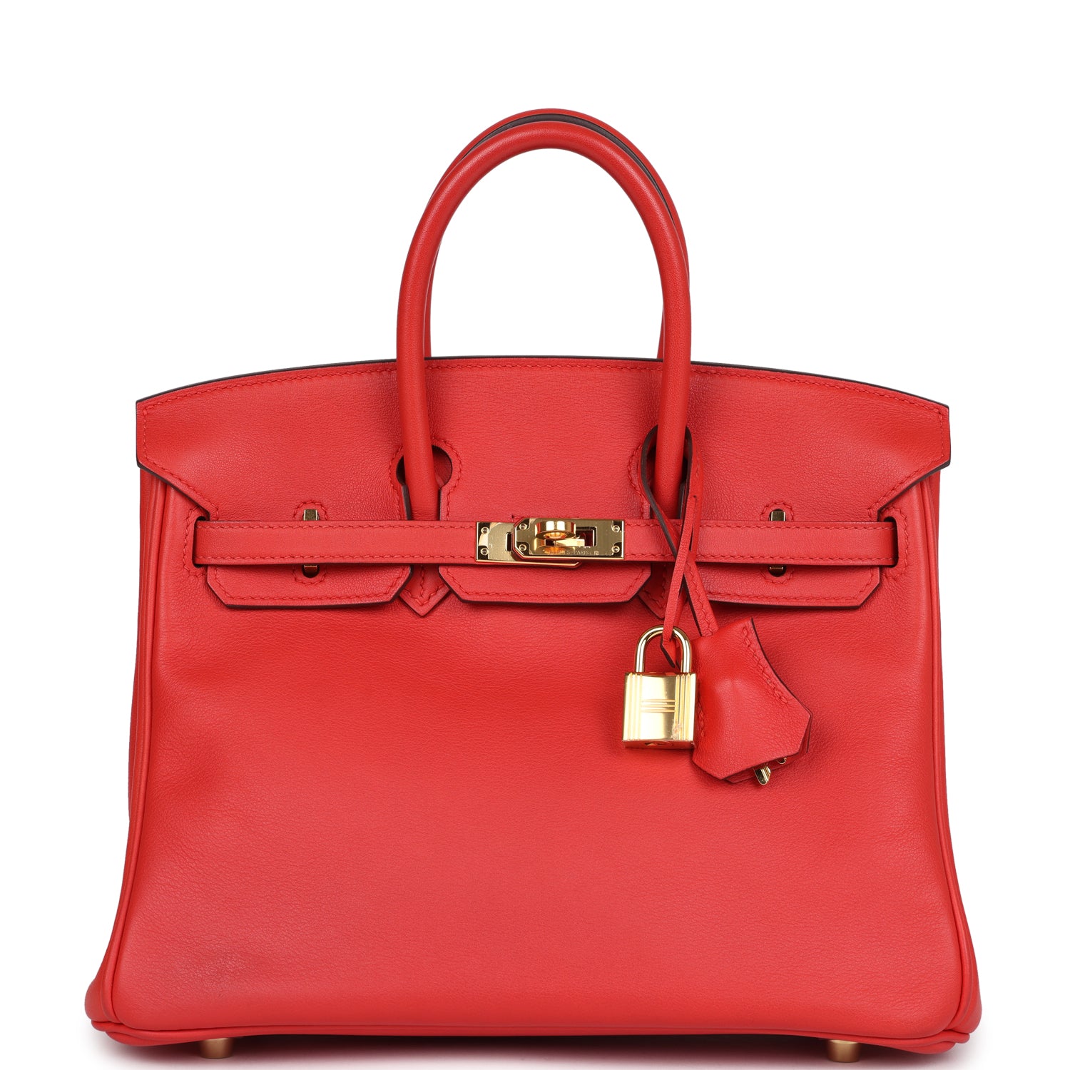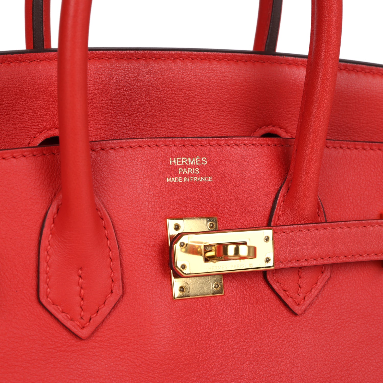 Birkin is in Rouge Tomate swift leather with palladium hardware and has tonal stitching, front flap, two straps with center toggle closure, clochette with lock and two keys, and double rolled handles.