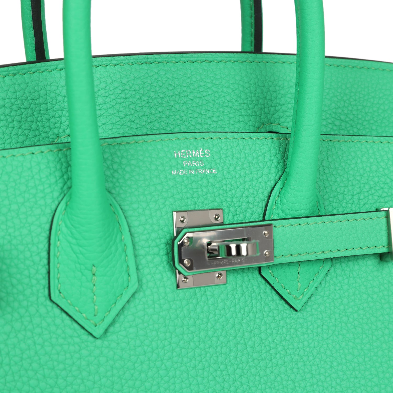 Birkin 25 is in Vert Comics Togo with palladium hardware, tonal stitching, front flap with two straps, front toggle closure, clochette with lock and two keys, and double rolled handles.