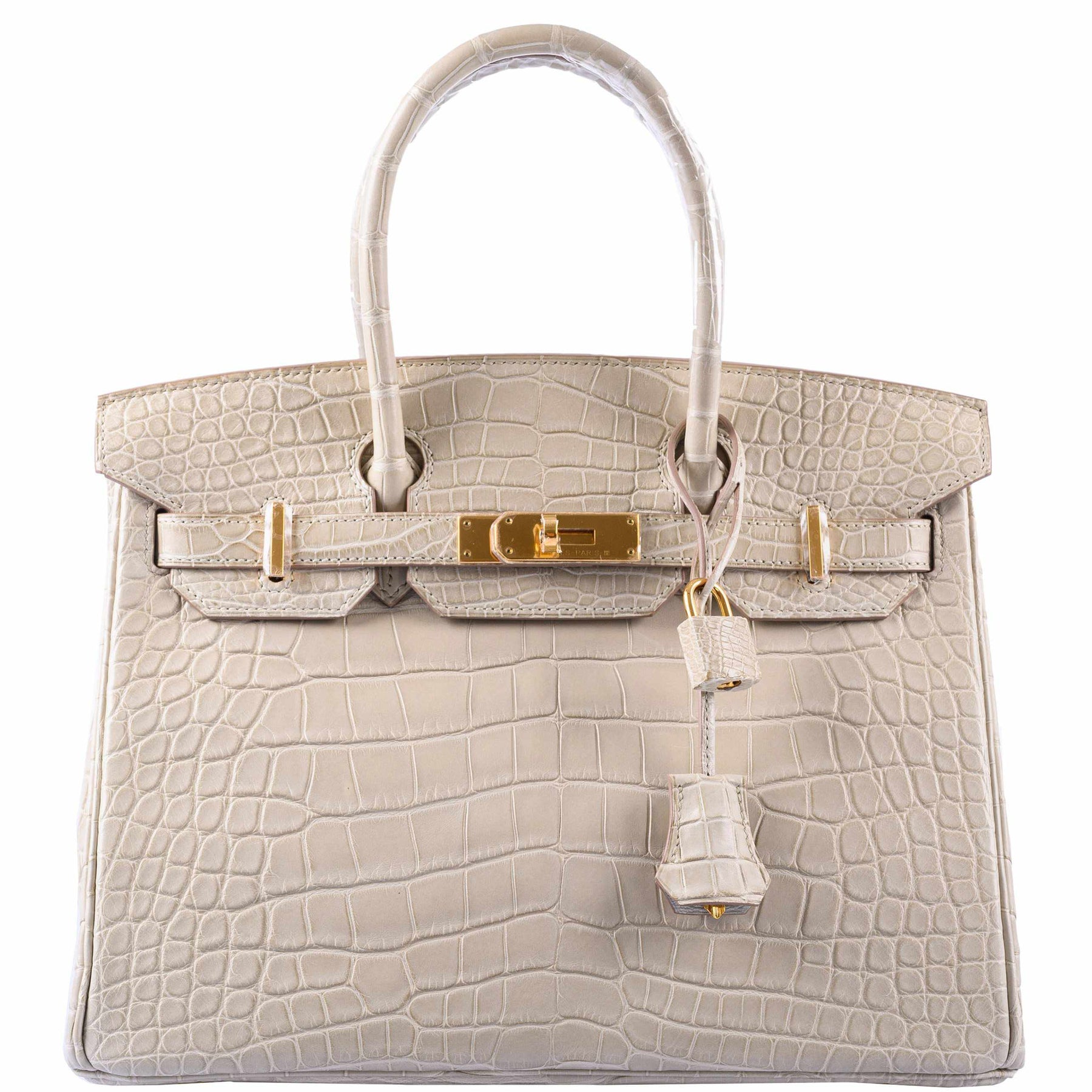This store-fresh example is exceptional, featuring gold hardware crafted from matte Beton Alligator, a highly sought after shade that is limited by its difficulty of production. To create light tones, first the natural pigments must be stripped, a process which can easily damage lower-quality skins. One of Hermès’ highest prized exotic shades is Beton.