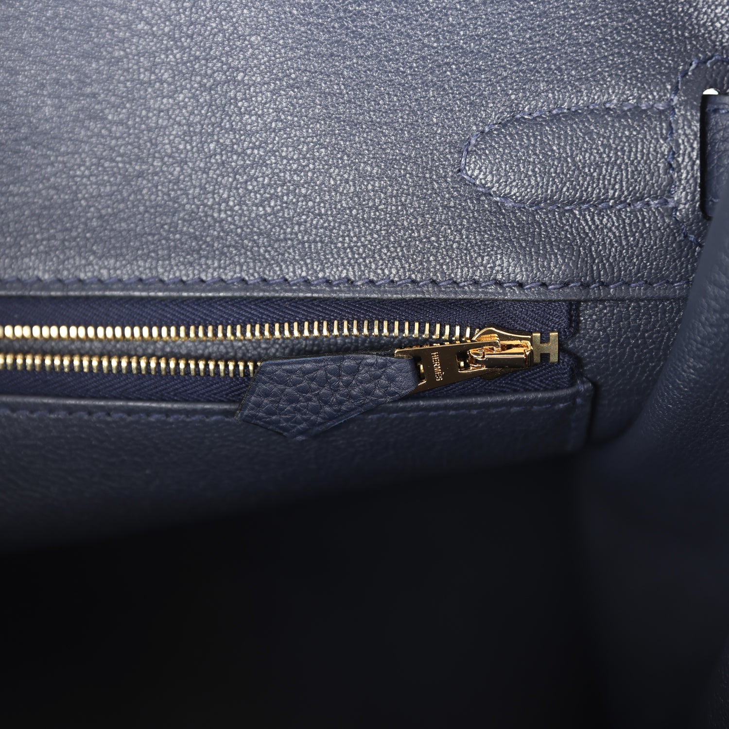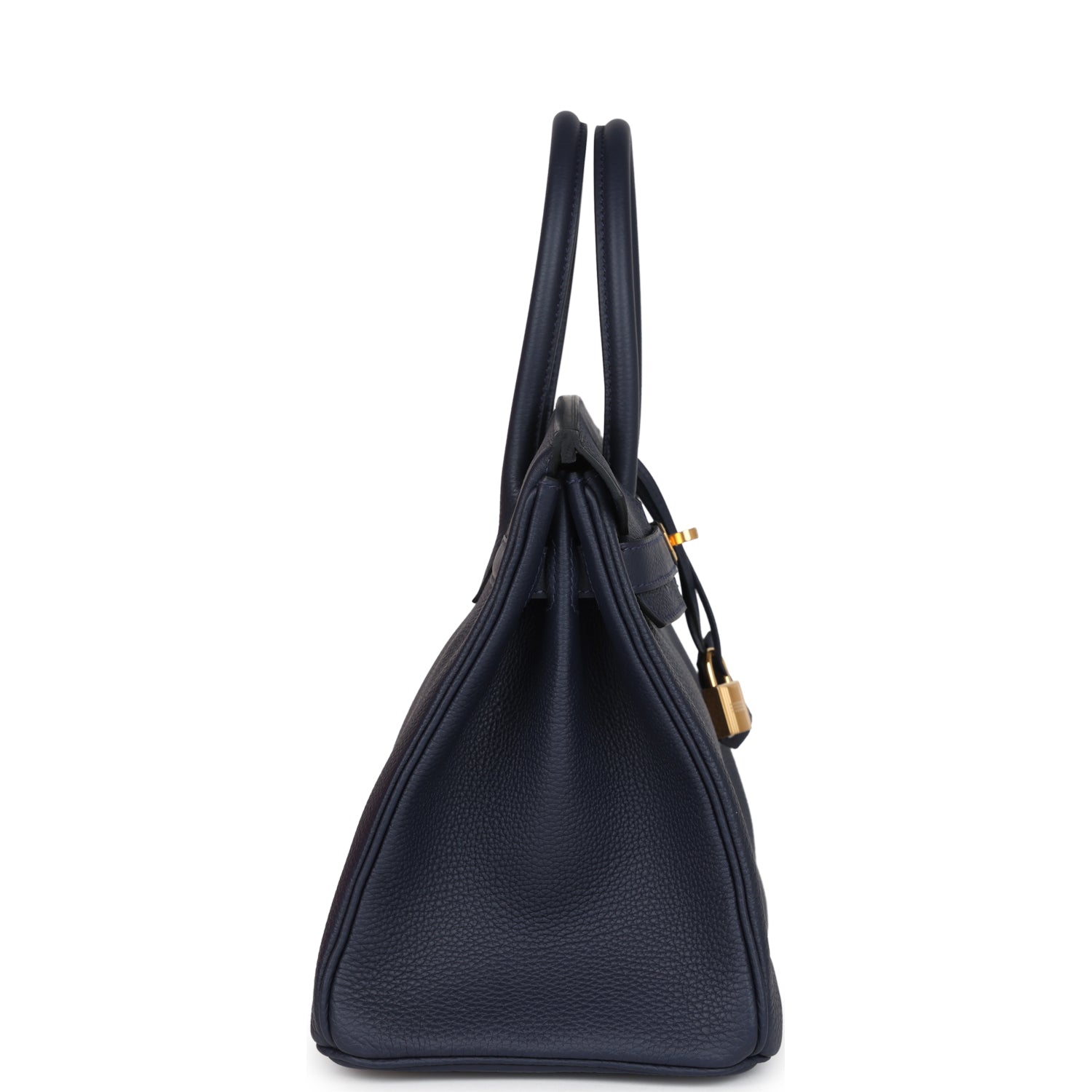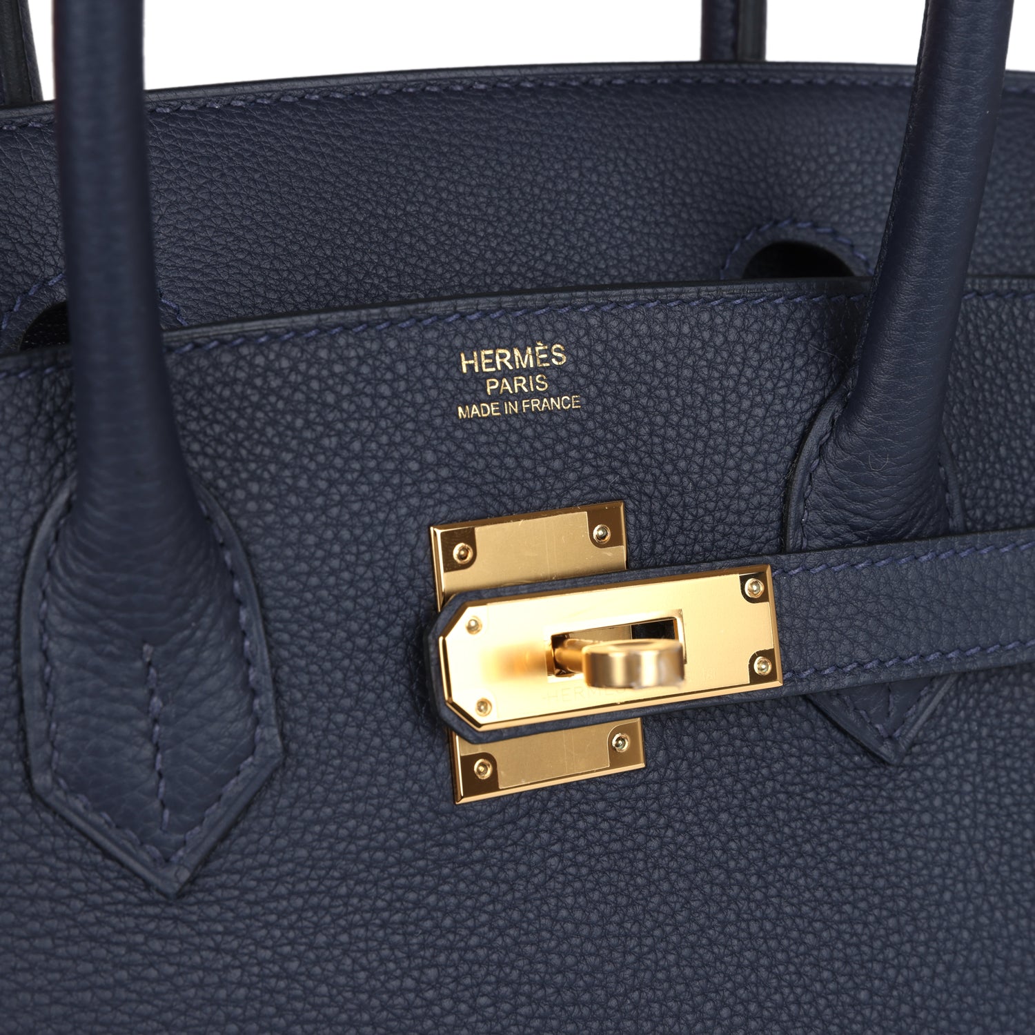 This Birkin is in Bleu Nuit togo leather with gold hardware and has tonal stitching, front flap, two straps with center toggle closure, clochette with lock and two keys, and double rolled handles.