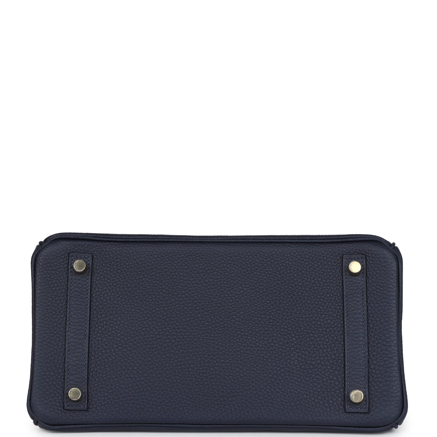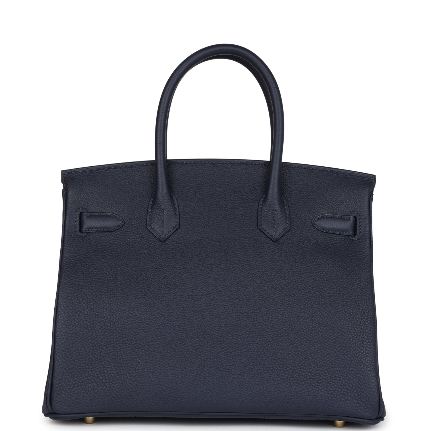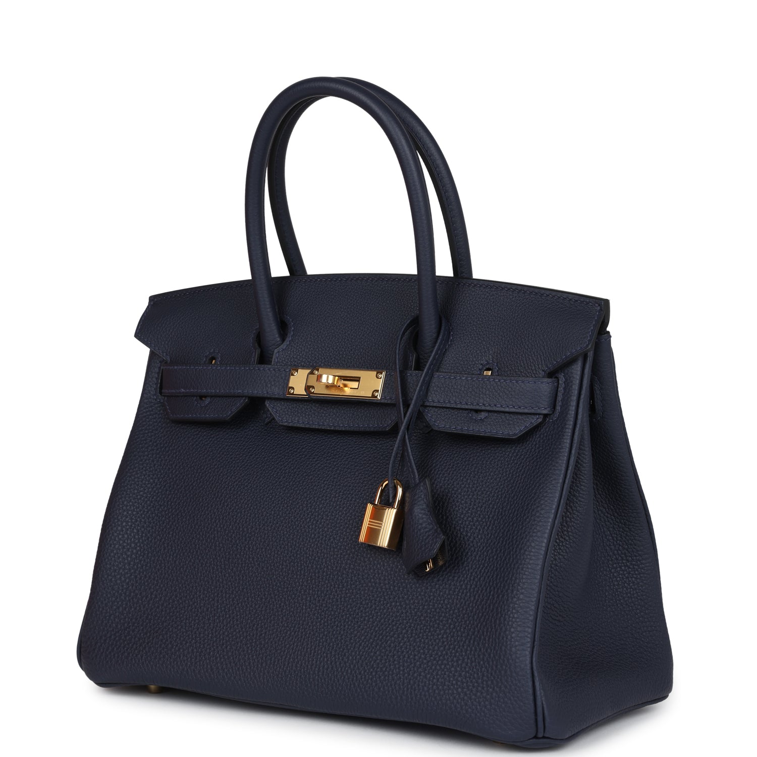This Birkin is in Bleu Nuit togo leather with gold hardware and has tonal stitching, front flap, two straps with center toggle closure, clochette with lock and two keys, and double rolled handles.