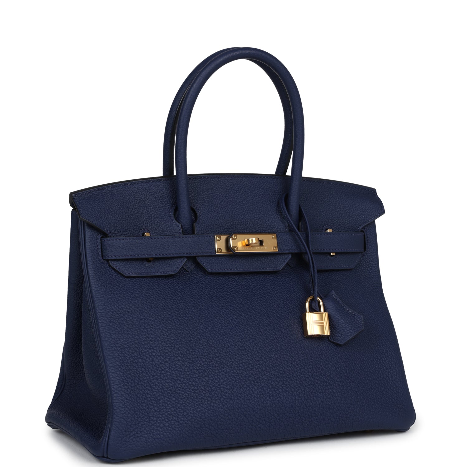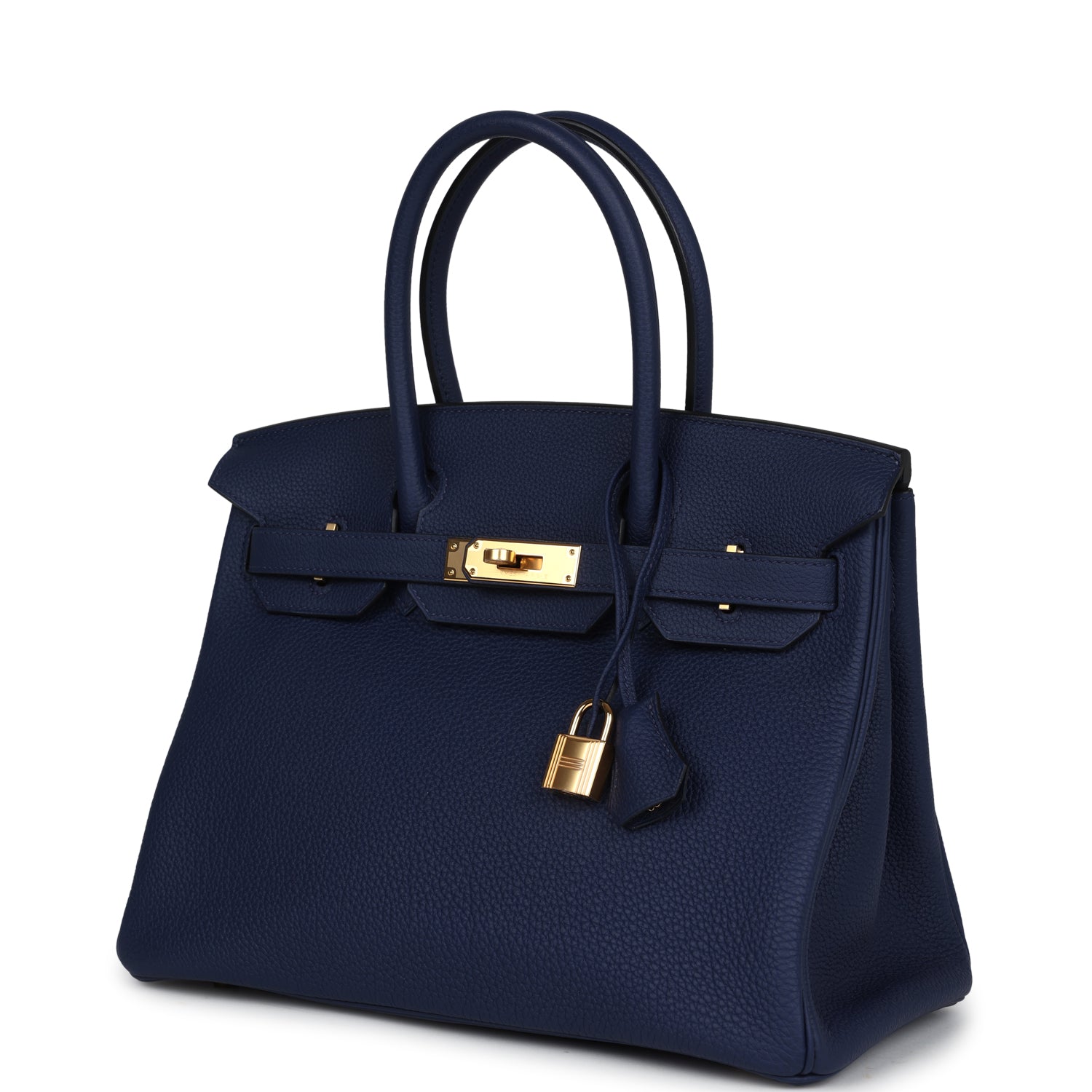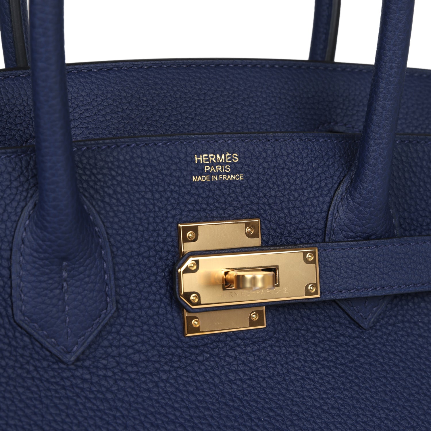 This Birkin is in Bleu Nuit togo leather with gold hardware and has tonal stitching, front flap, two straps with center toggle closure, clochette with lock and two keys, and double rolled handles.