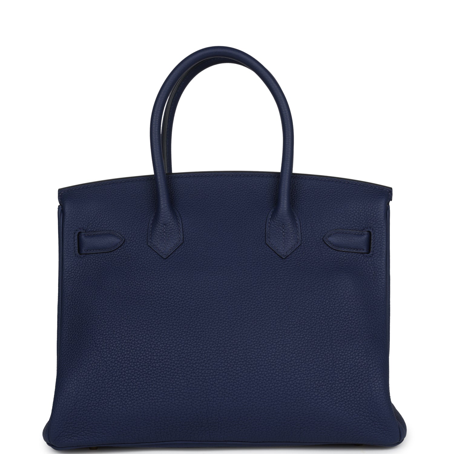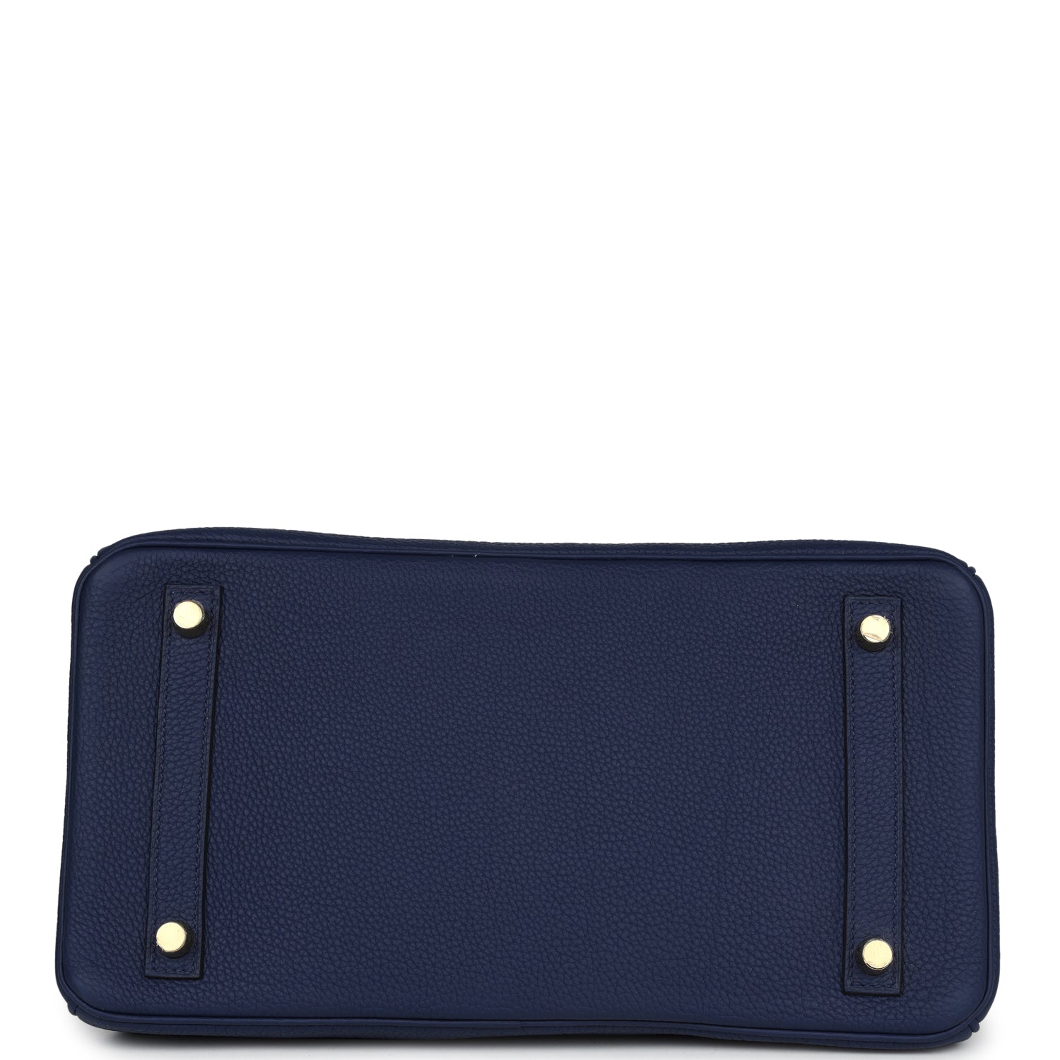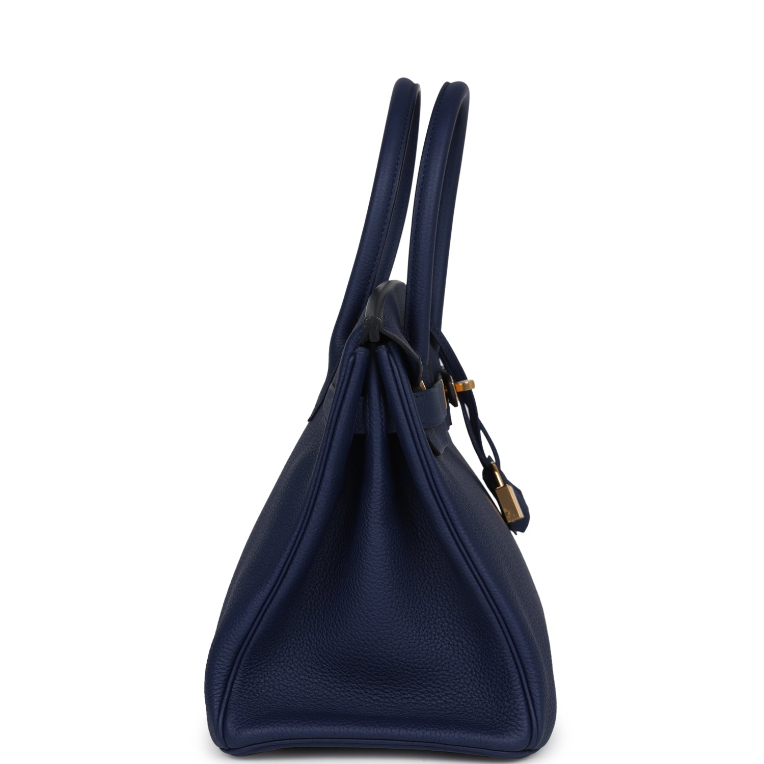 This Birkin is in Bleu Nuit togo leather with gold hardware and has tonal stitching, front flap, two straps with center toggle closure, clochette with lock and two keys, and double rolled handles.