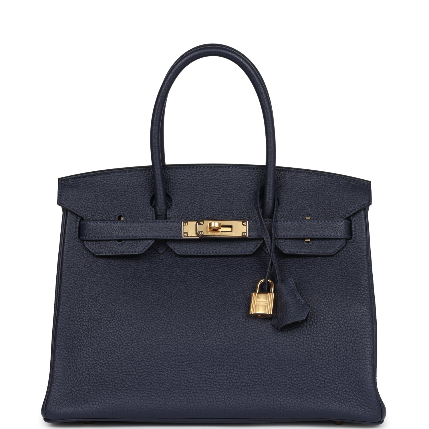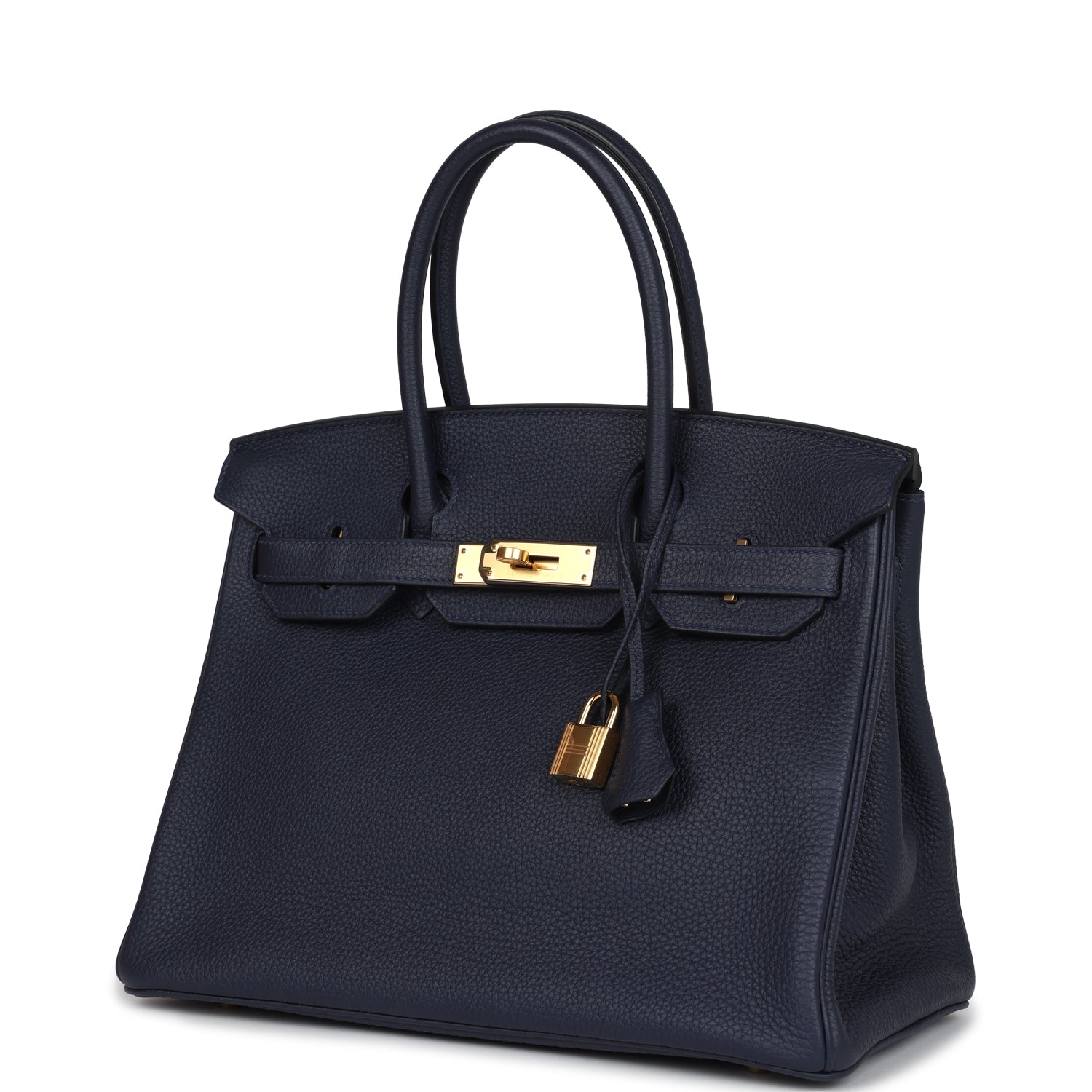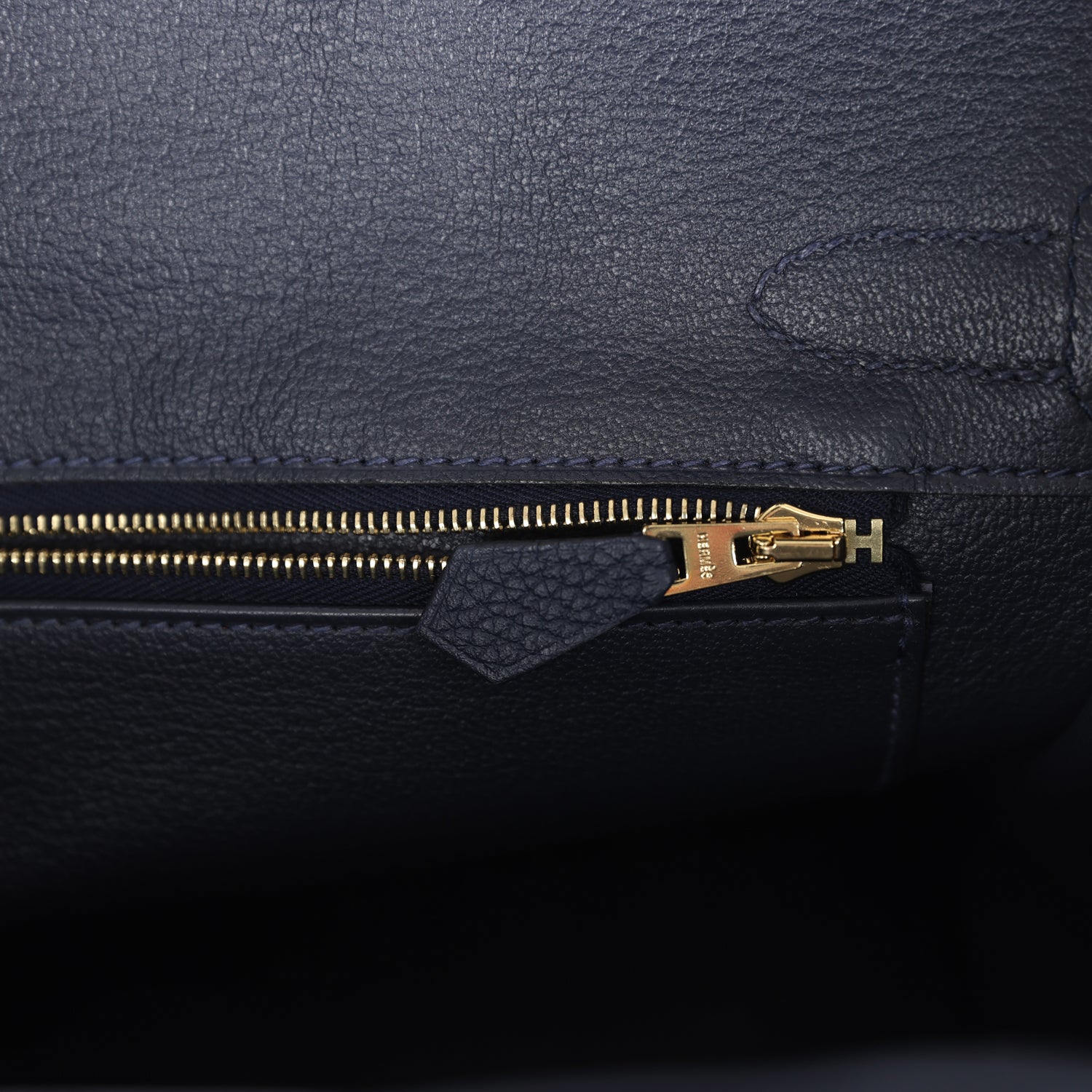 This Birkin is in Bleu Nuit togo leather with gold hardware and has tonal stitching, front flap, two straps with center toggle closure, clochette with lock and two keys, and double rolled handles.