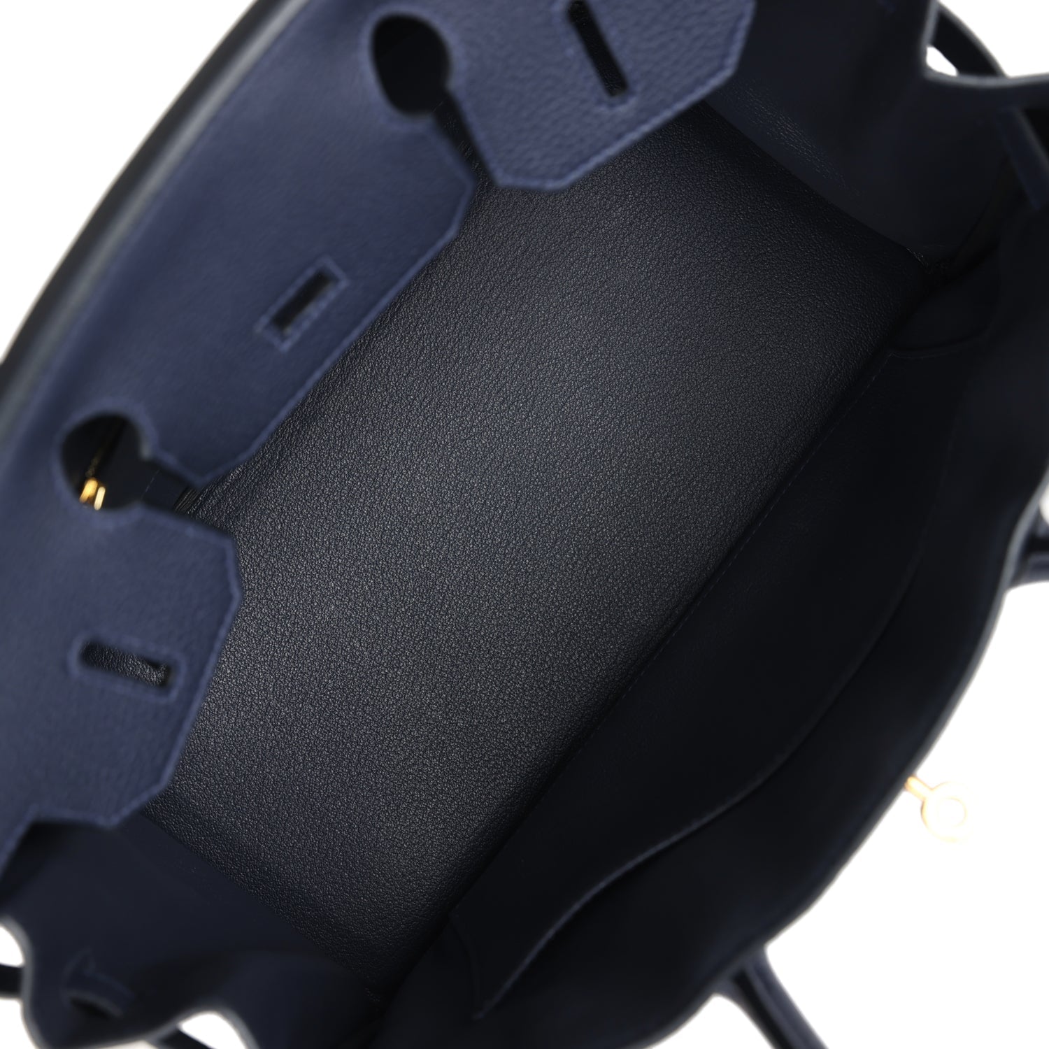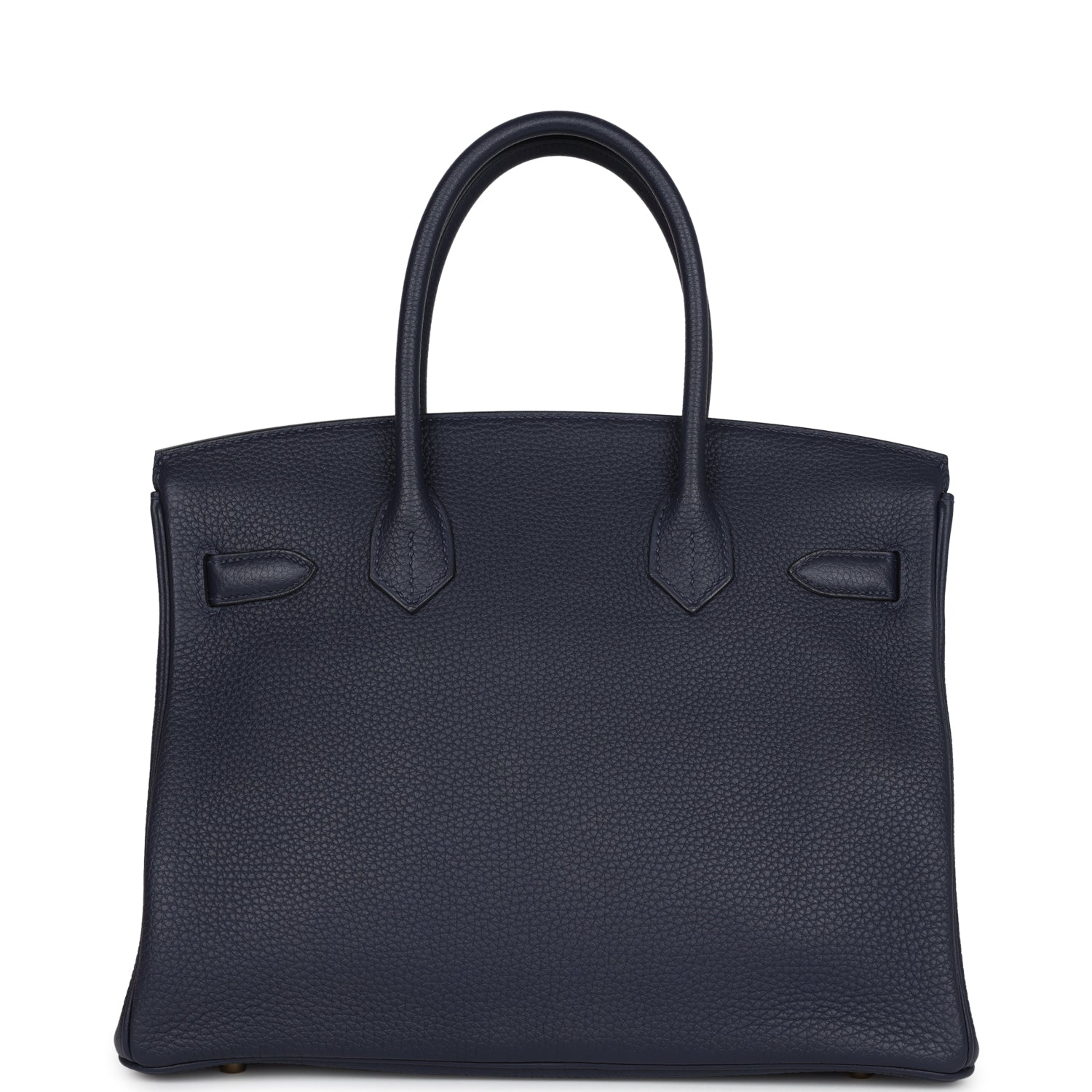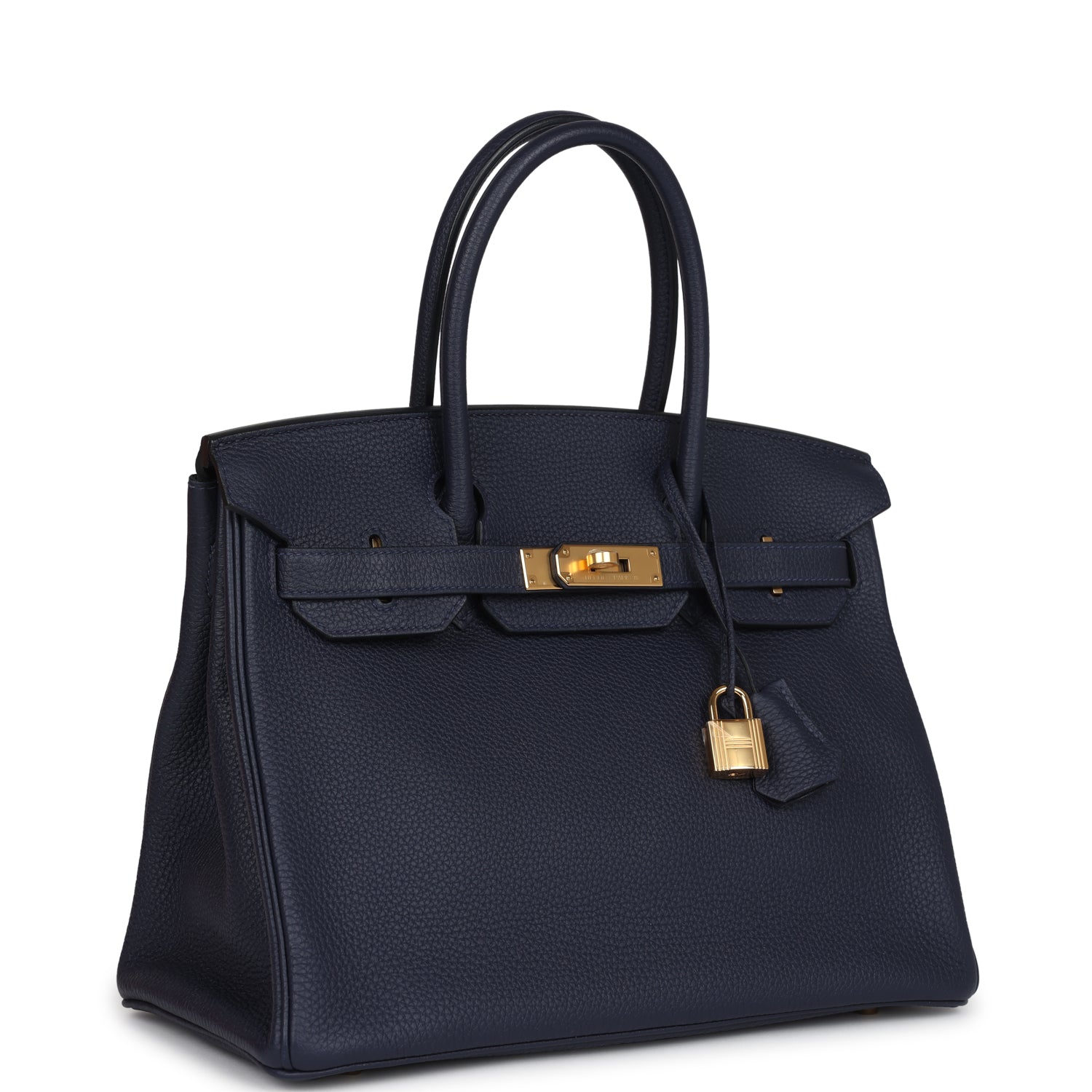 This Birkin is in Bleu Nuit togo leather with gold hardware and has tonal stitching, front flap, two straps with center toggle closure, clochette with lock and two keys, and double rolled handles.