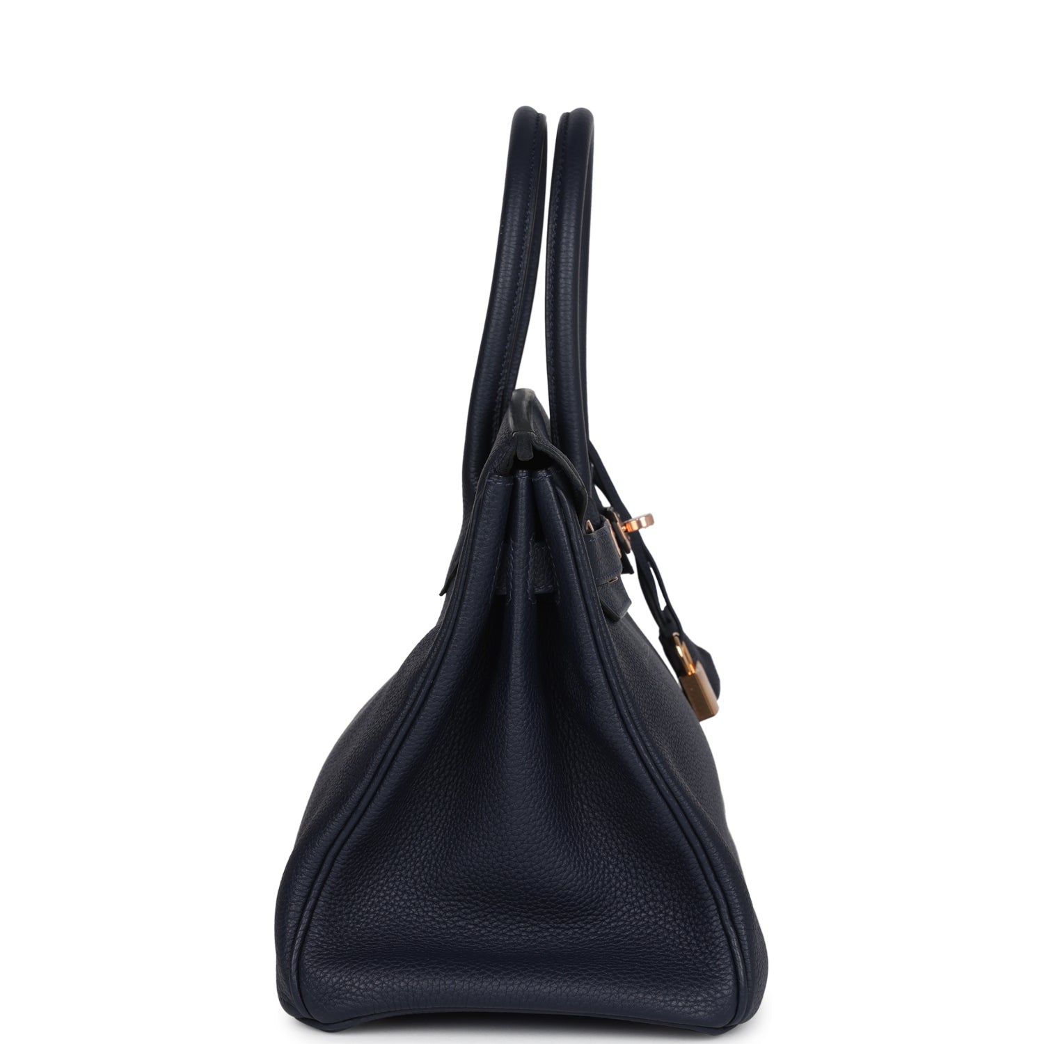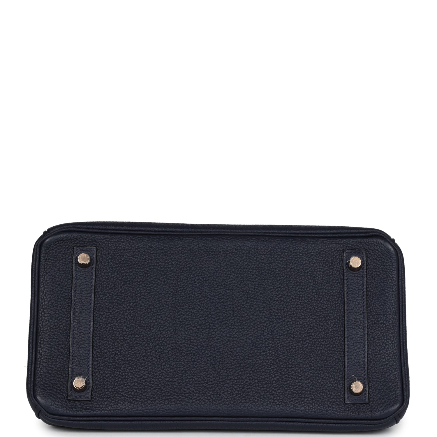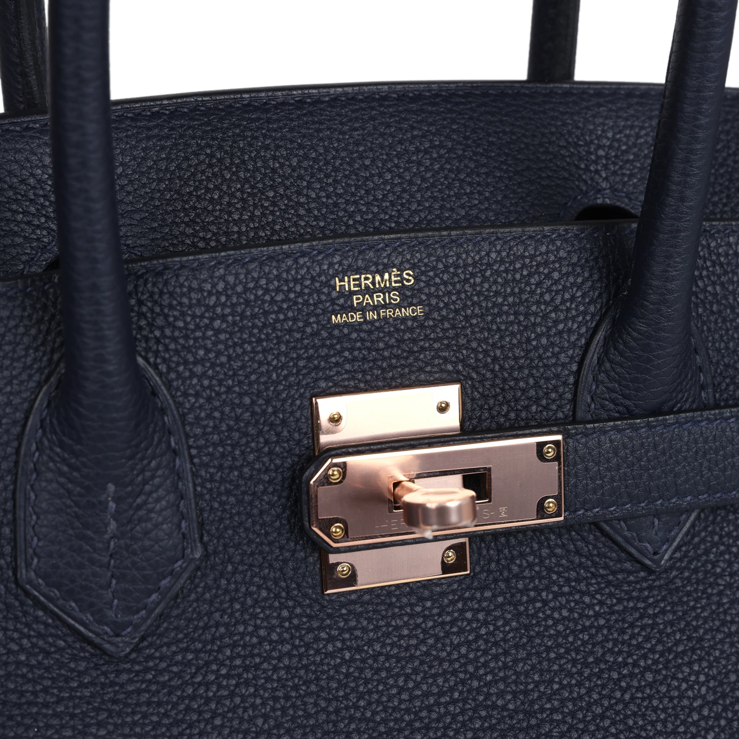 This Birkin is in Bleu Nuit togo leather with rose gold hardware and has tonal stitching, front flap, two straps with center toggle closure, clochette with lock and two keys, and double rolled handles.