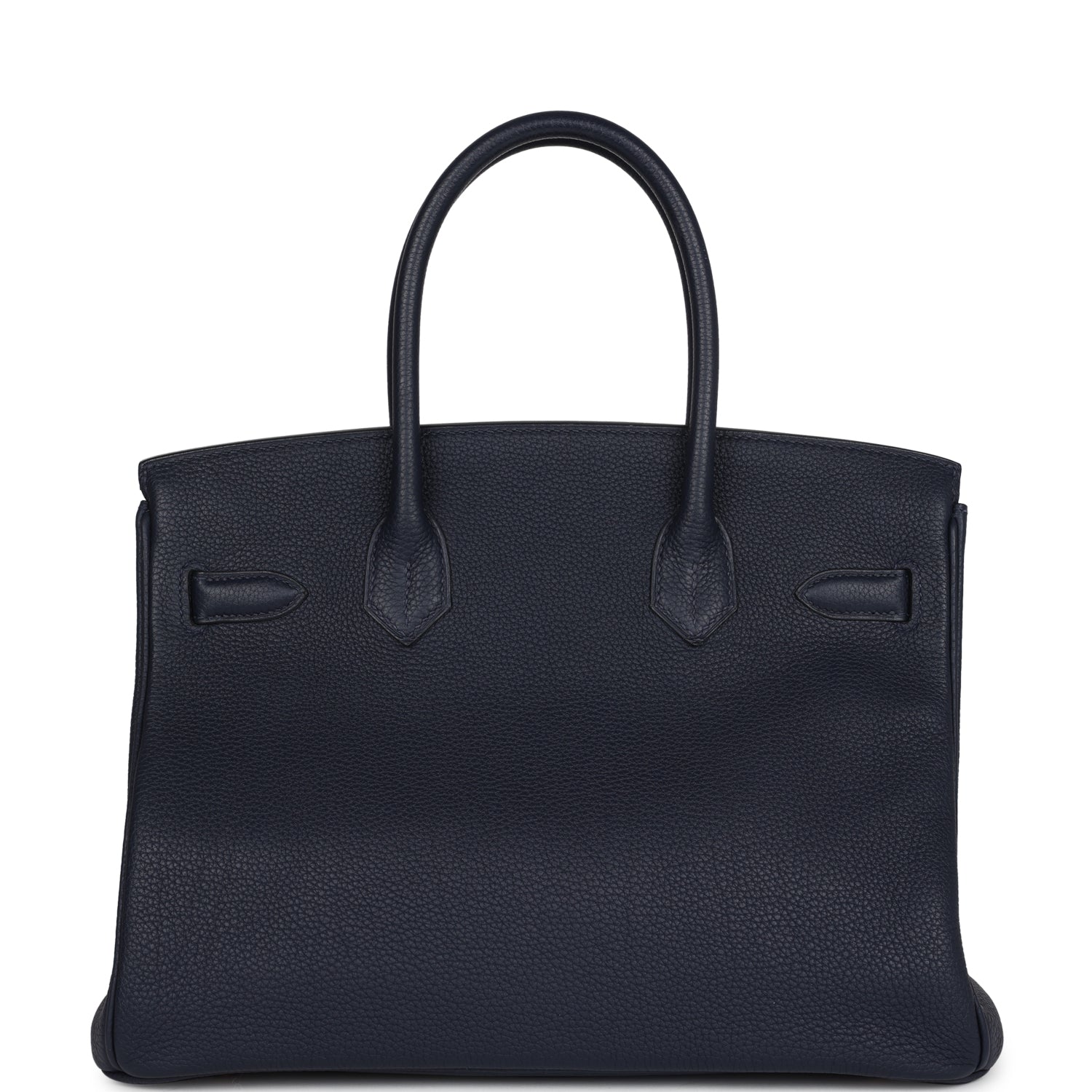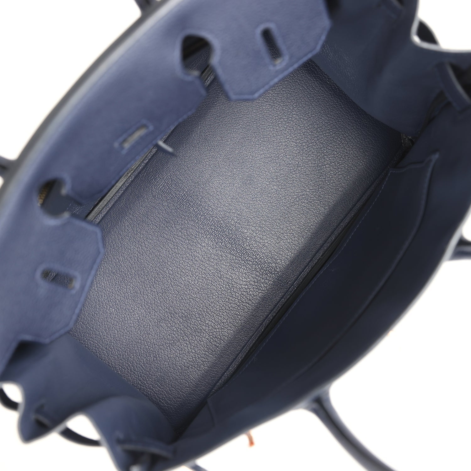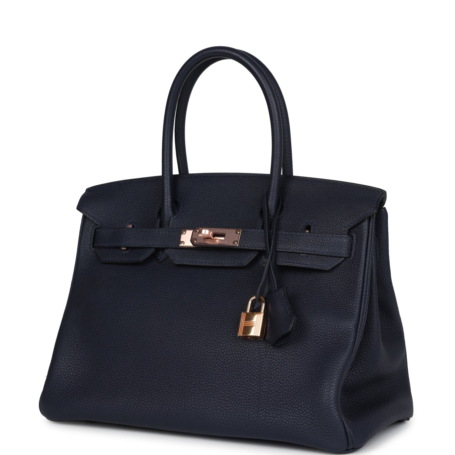 This Birkin is in Bleu Nuit togo leather with rose gold hardware and has tonal stitching, front flap, two straps with center toggle closure, clochette with lock and two keys, and double rolled handles.