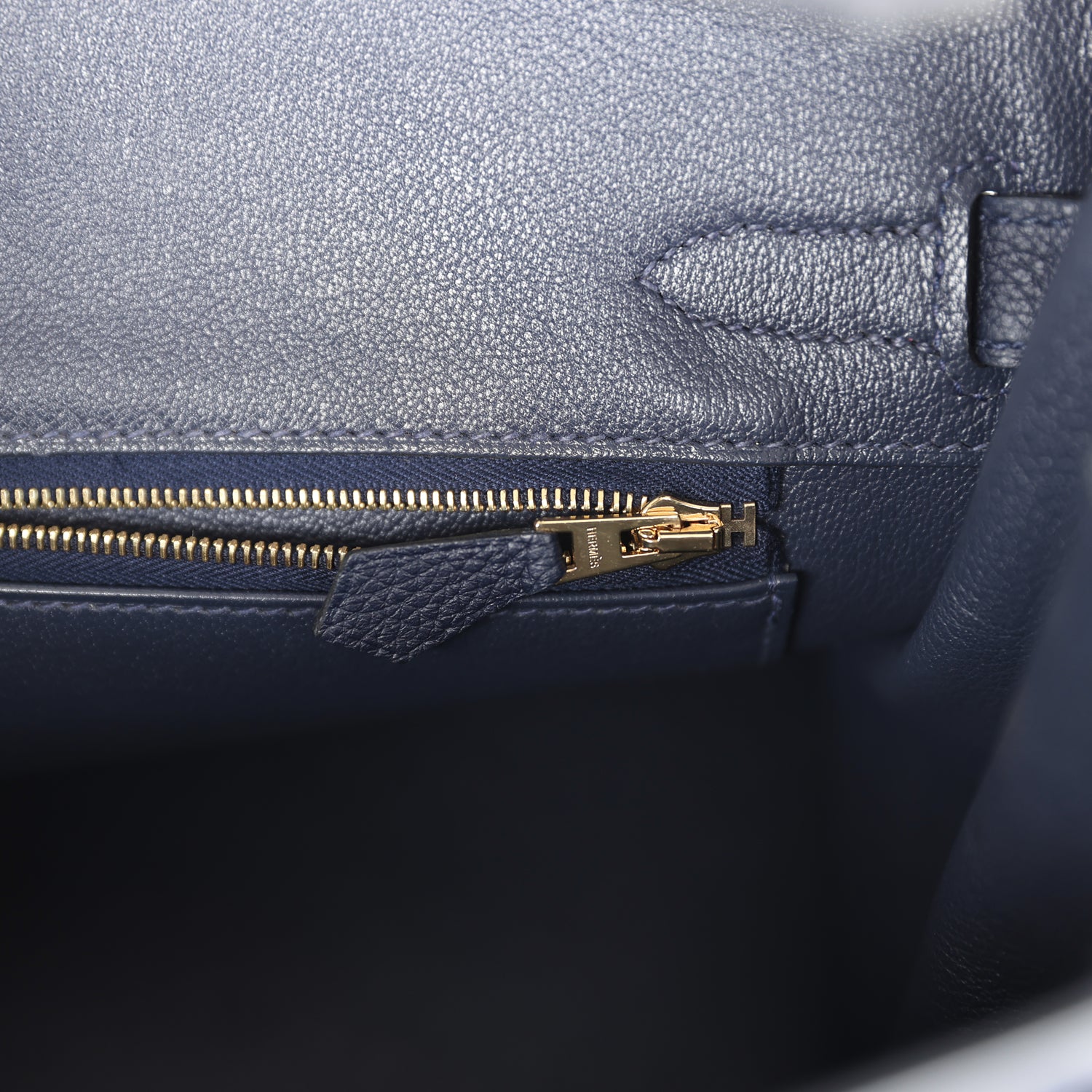 The interior is lined with Bleu Nuit chevre and has one zip pocket with an Hermes engraved zipper pull and an open pocket on the opposite side.