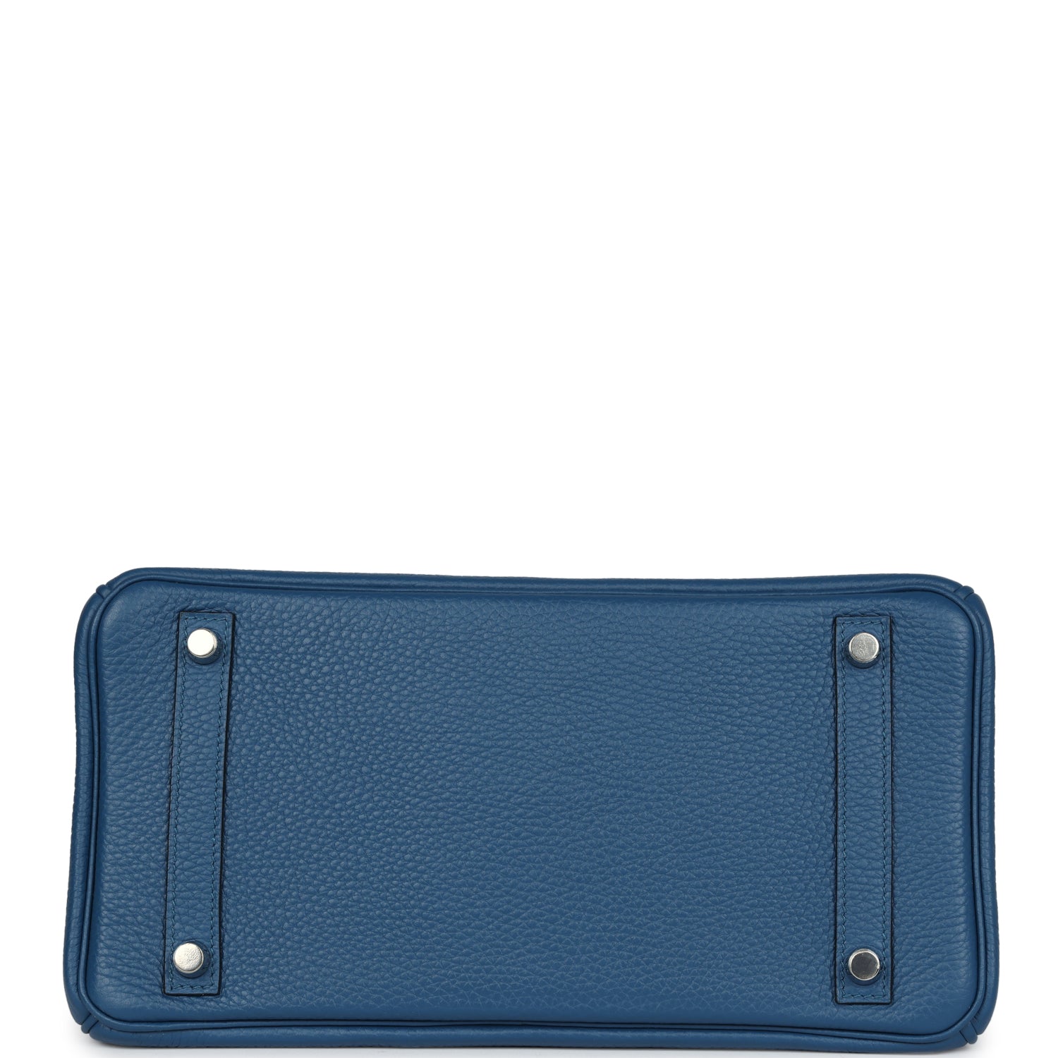 This Birkin is in Bleu Thalassa clemence leather with gold hardware and has tonal stitching, front flap, two straps with center toggle closure, clochette with lock and two keys, and double rolled handles.